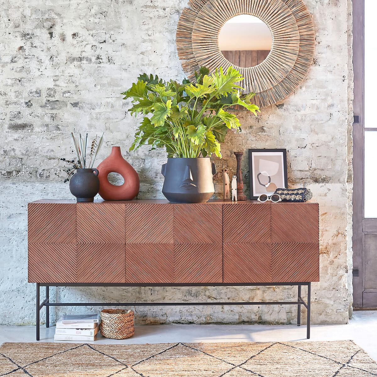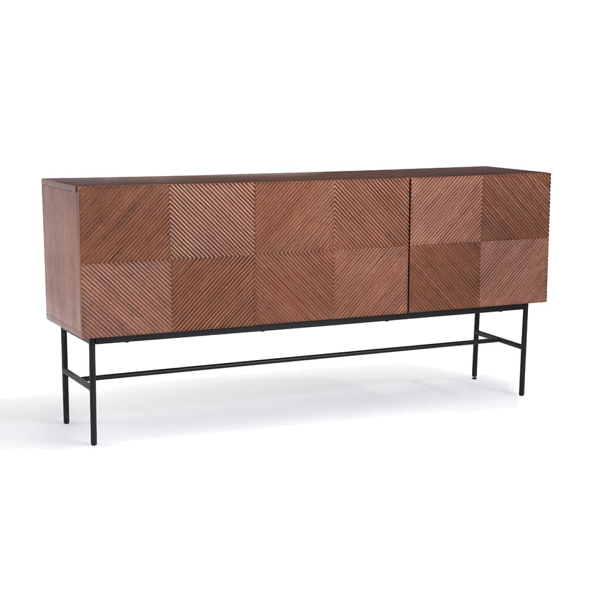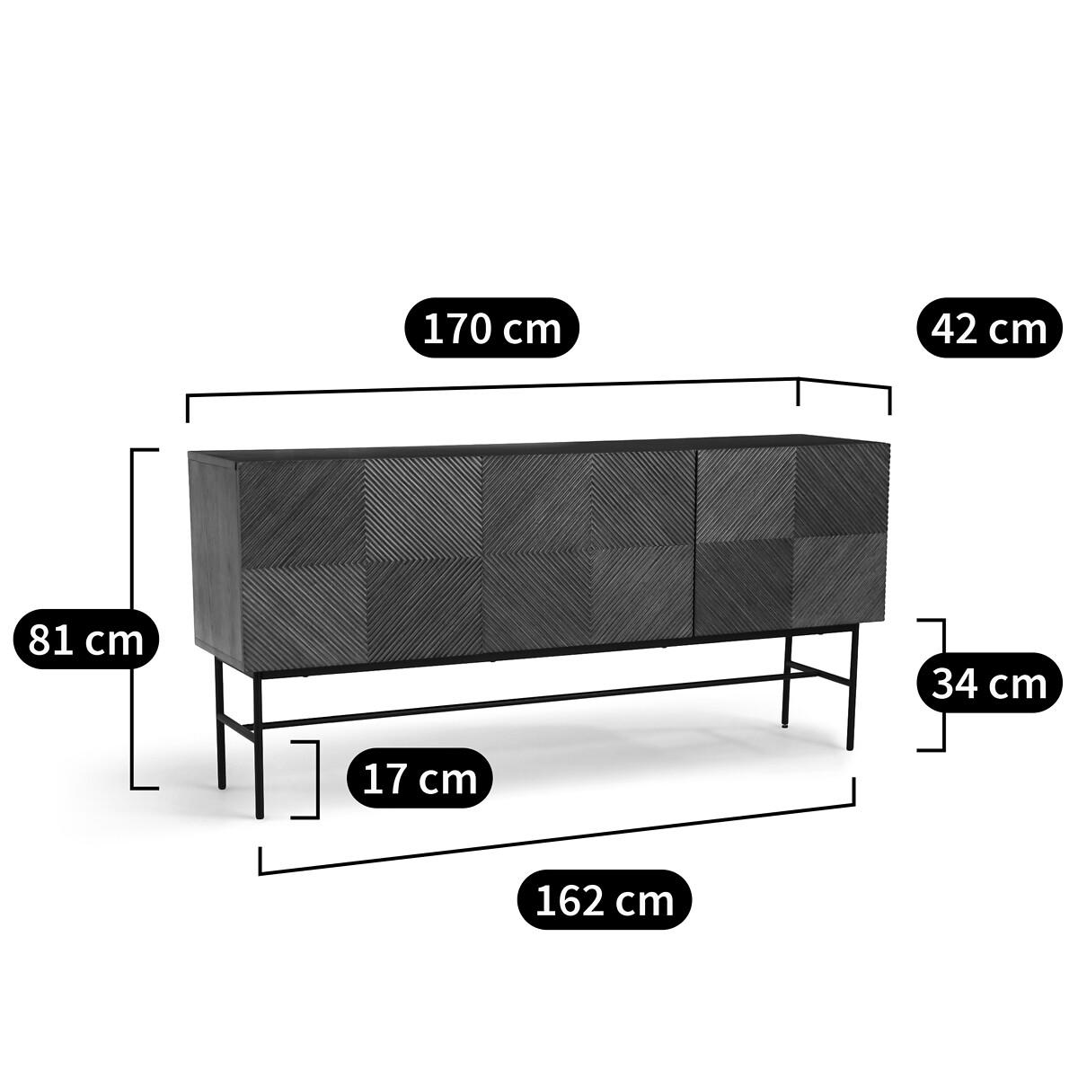 A facade with a traditional pattern in raised wood and a steel "H" base: the Jerem range revisits the art of cabinetmaking and the craftsmanship spirit, in a contemporary style. Its generous size offers a good storage capacity. Product Details • Assembled unit in oak veneered MDF, walnut stained, nitrocellulose varnish finish • Graphic design on the facade veneered with oak strips, stained walnut • 3 doors with soft closing hinges • 2 vertical dividers • 3 storage compartments, with removable and adjustable shelf • 6 compartments • Bevel cut on the top of the doors for easy opening • "H" base in steel tube, black paint, epoxy finish • Plastic feet padsDimensions. Overall • Width: 170cm • Height: 81cm • Depth: 42cm. Usable space • Useful dimensions of a compartment (excluding shelf): L54 x H34 x D37cm • Useful dimensions of the base: L162 x H34 cm (H17cm with central bar) Delivery:Sold with feet to be attached. Available for home delivery. Note! Please check that all access points are large enough to accommodate your delivery (doors, stairs, lifts). • WOOD FROM SUSTAINABLY MANAGED FORESTS. FSC® certified wood comes from forests that are environmentally, socially and economically well managed. Dimensions and weight of parcel1 parcel • L178 x H59.5 x D49.2cm. 63kg