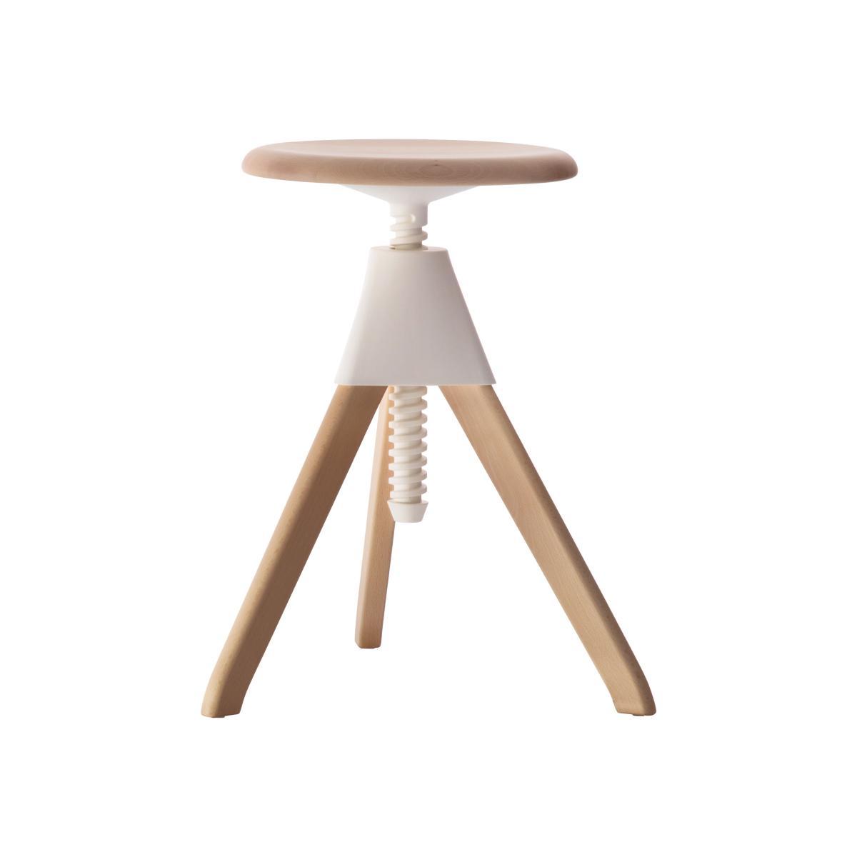TOM & JERRY is the redesign of a classic furniture typology: the workshop stool. The three-legged stool (in two different heights) is made of solid beech wood with mechanical parts in self lubricant plastic. Due to its smooth-running mechanism it is easy to adjust and convenient to climb. The stools make a versatile addition to working, recreational and private environments alike: an office canteen, the health food restaurant or the kitchen counter at home. It's the working stool of an architect or a scientist, the resting place of a museum guard, telephone stool, valet in a changing room, seating for children at kindergarden.