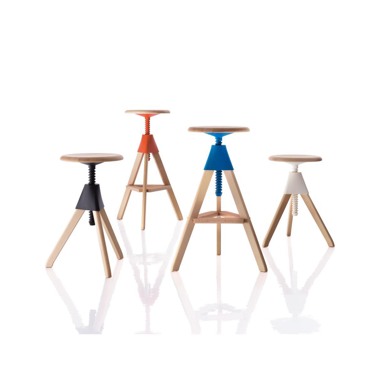 You’ll love the hybrid style of this stool, halfway between contemporary design and industrial style! The famous German designer Konstantin Grcic gives us his cheerful, fun and colourful reinterpretation of the classic workshop stool. Ingenious and very functional, Tom & Jerry has a swivel seat that’s adjustable in height. In this case, the screw mechanism, traditionally made of steel, is made of self-lubricating polypropylene. You’ll love the attractive mix of solid beech and coloured plastic. Tom & Jerry will prove indispensable in every room in the house!.