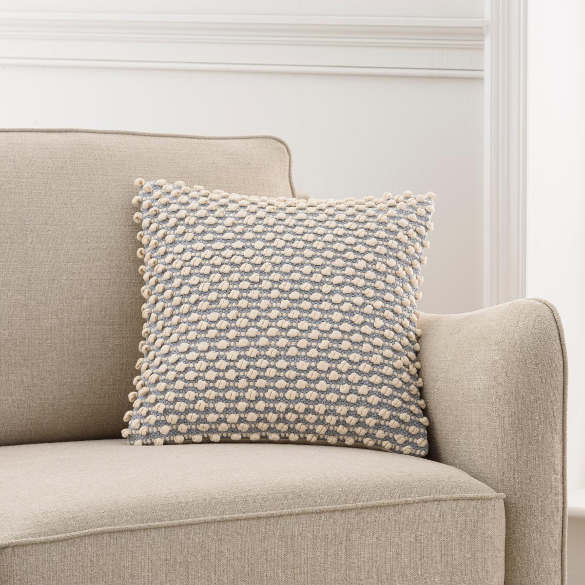 * Bobble design* Striped style* Zip fastening* Easy to clean Made with a woven bobble design and striped style, this bobble cushion will be a statement piece within any room of the house, that also complements an array of home decors with its beautiful, modern colourway. The plump cushion, has a choice of fillings - recycled polyester hollowfibre or feather, both secured by a zip, ensuring you can clean the cover easily.