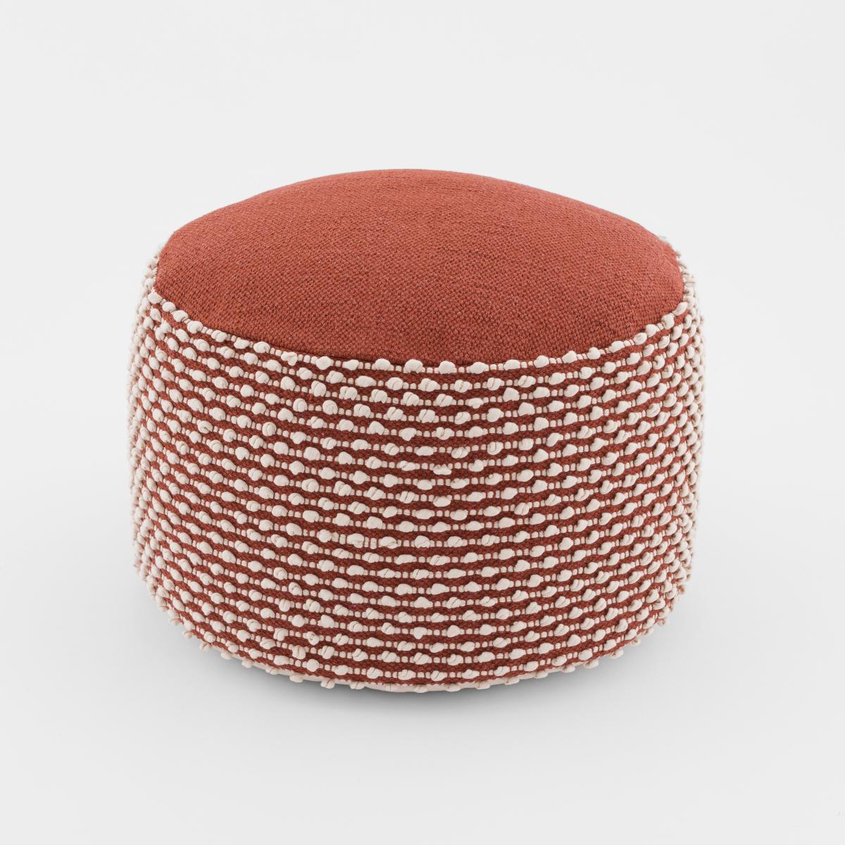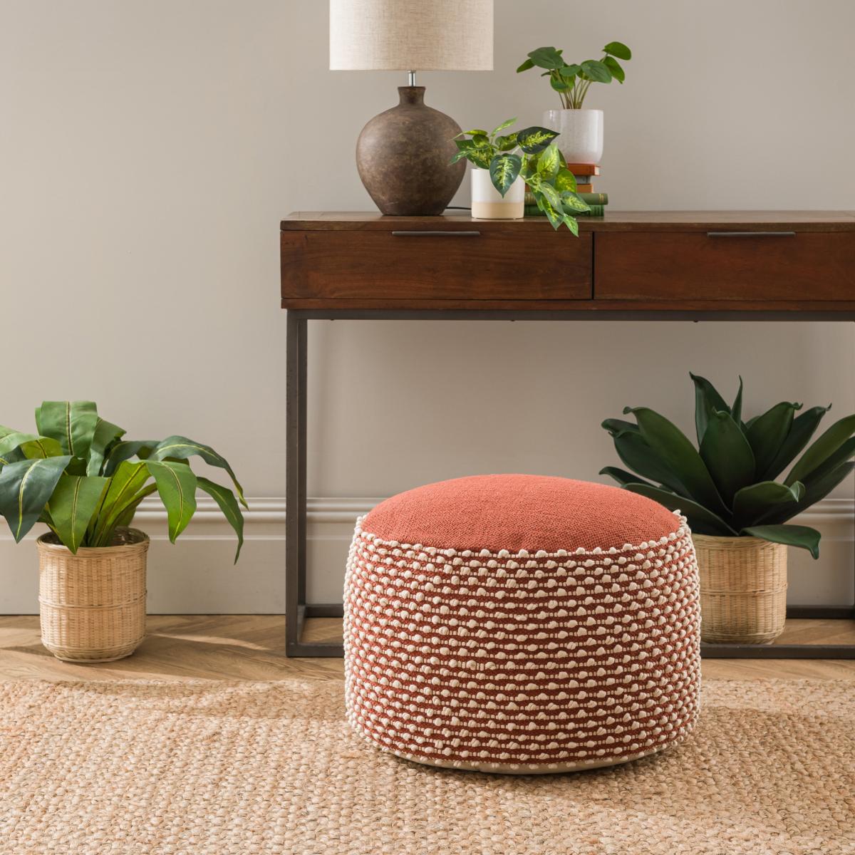 I love this little pouffe for its versatility and cheerful colour - perfect for adding a pop of warmth to both modern and eclectic interiors. Its round shape and textured fabric make it an inviting accent piece, ideal as a footstool, extra seating, or even a cosy spot to tumble onto with a book. It works particularly well in living rooms with warm earthy tones or natural materials, but can also brighten minimalist schemes with its vibrant but muted orange. Practical styling tips include pairing it with neutral-toned sofas or layered with a soft throw and cushions for a relaxed, inviting look. Its manageable size means it can be easily moved around to suit your needs while adding a touch of playful texture to your space.