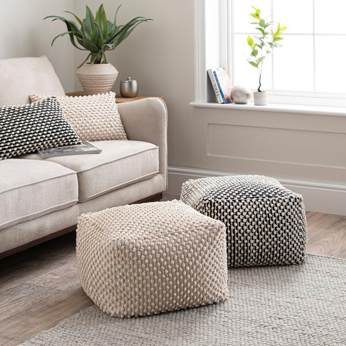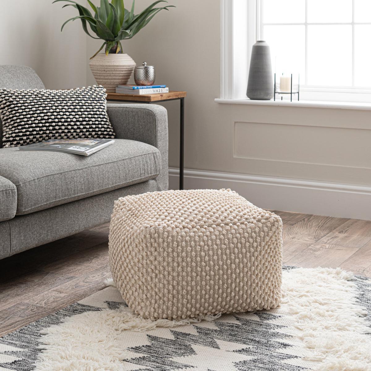 I love the Jersey natural bobble cube for its versatile and tactile appeal, making it a practical addition to various interiors. Its neutral tone and textured fabric lend themselves well to contemporary, Scandinavian, or cosy boho schemes, adding warmth and subtle pattern. It’s perfect as an extra seat or footrest in living rooms and lounges, especially in spaces that embrace layered textures and natural materials. Practical styling tips include pairing it with a soft throw or cushion for relaxed comfort, and placing it alongside a neutral sofa or armchair to create a casual, inviting vibe. Its simplicity and neutral palette make it easy to incorporate into most colour schemes, making it a functional yet stylish accent piece.