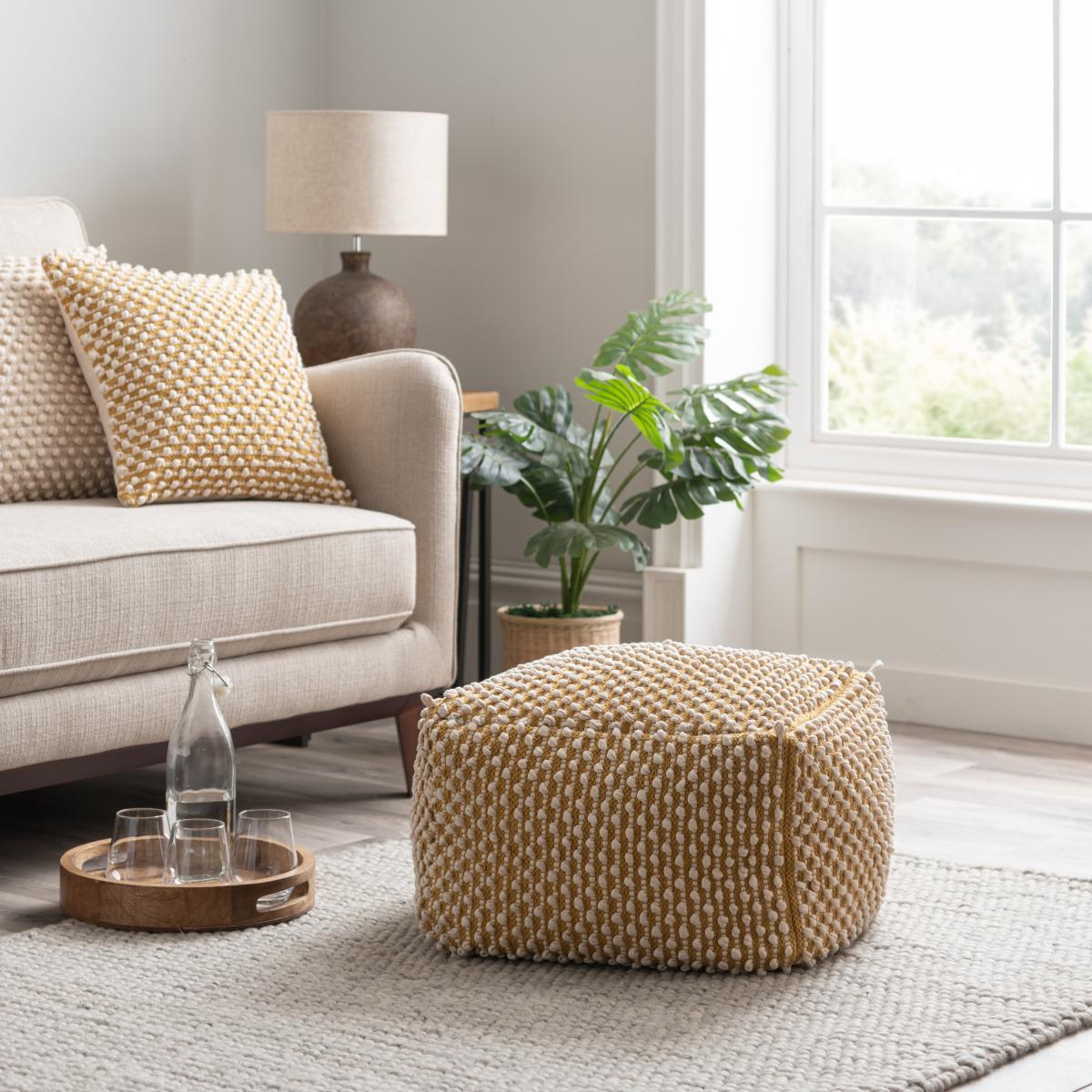 This stylish cube in a ochre colourway is crafted from a beautiful textured Jersey Bobble weave, which is incredibly soft to touch. Whether you rest your feet or tray on it, our Jersey Bobble cube will compliment your home style. Coordinate with matching cushions. Other colourways available.