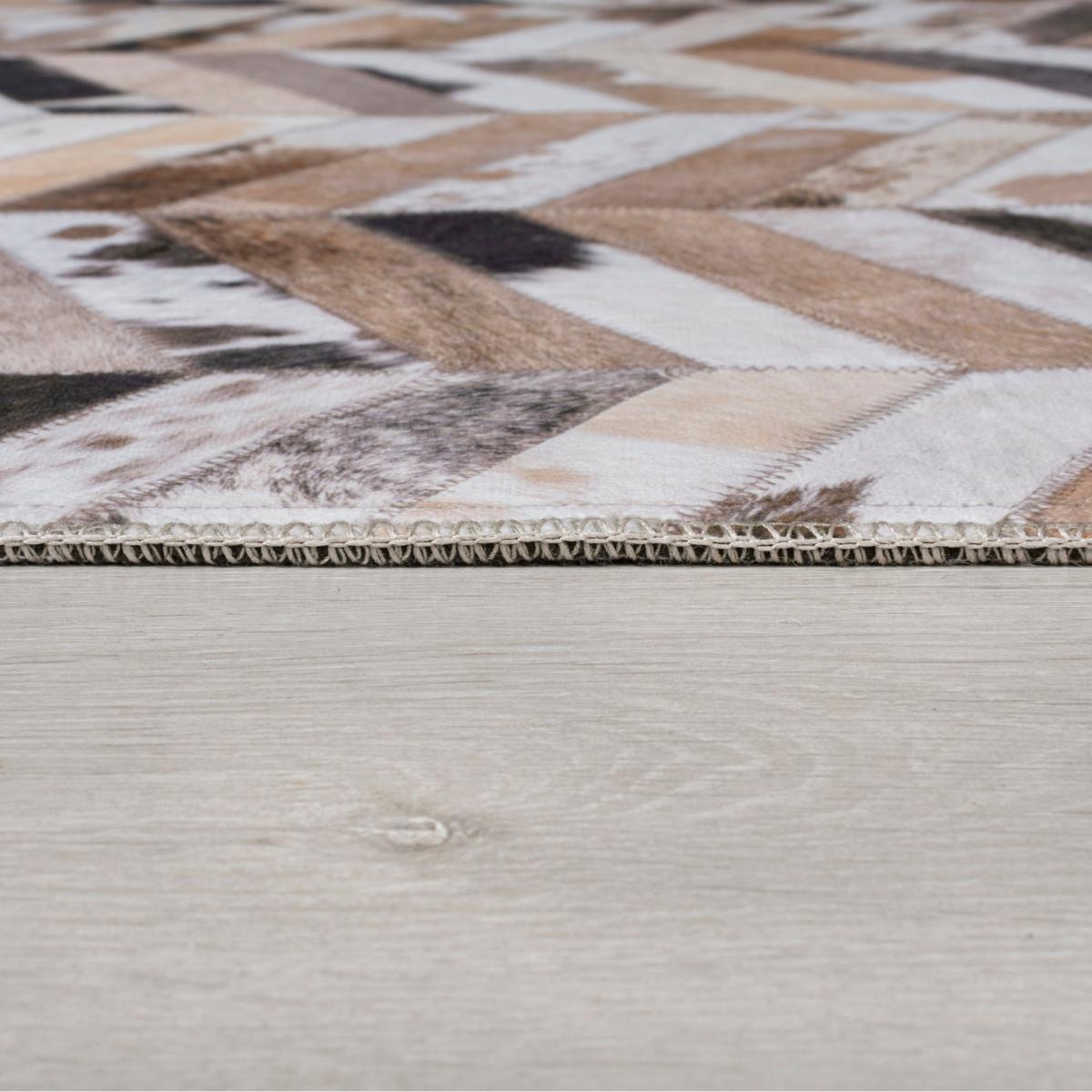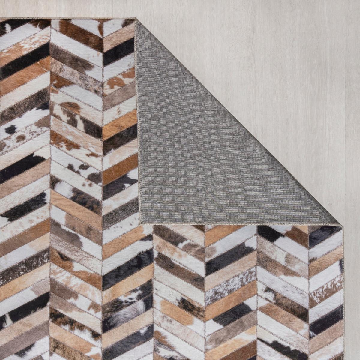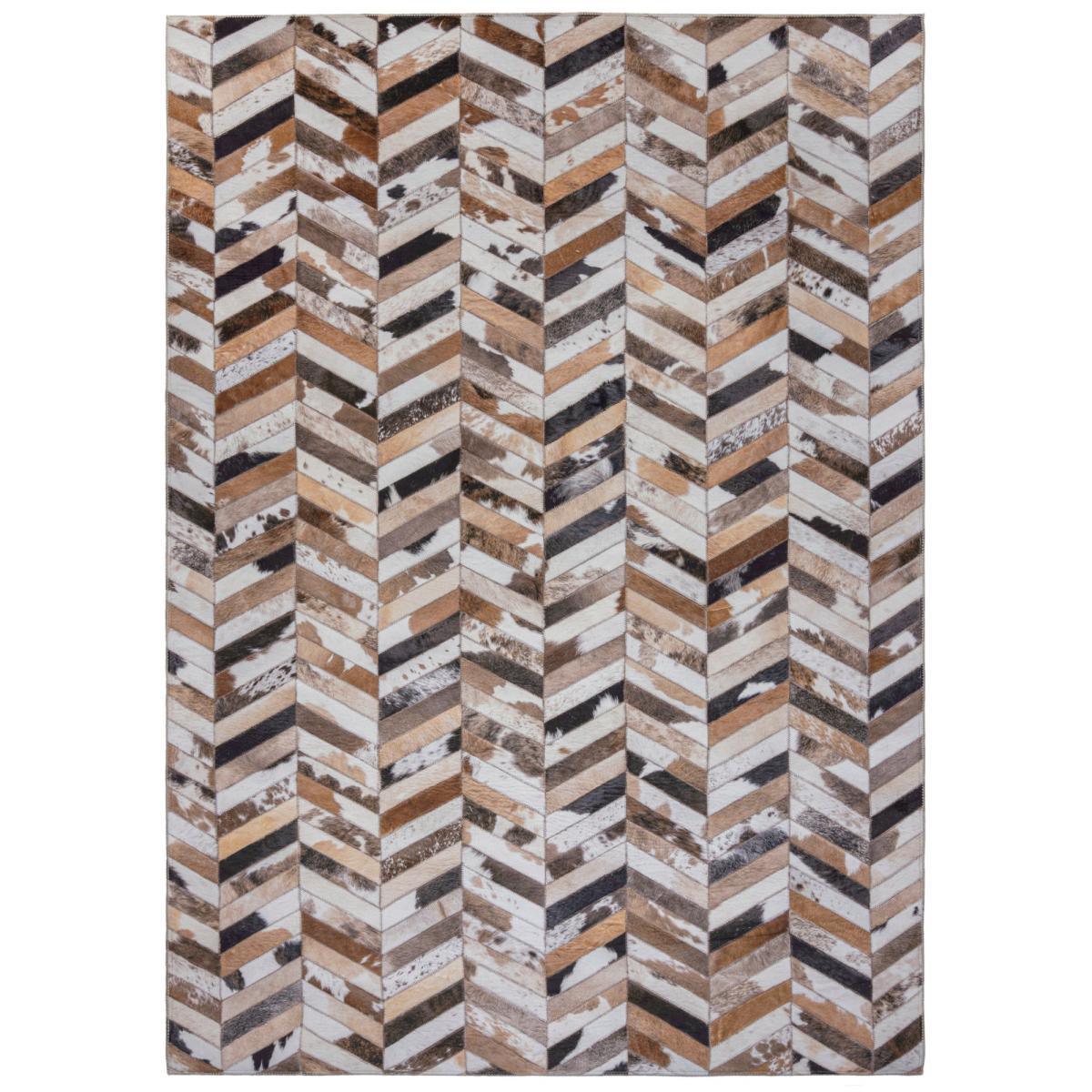 Walk on the wild side with the Jesse Faux Cowhide Rug. The popular faux hide looks in a chevron design compliments the natural colour palette for country style in your space. In 100% soft-touch polyester surface, the Jesse Faux Cowhide Rug has enhanced durability and the low-profile composition is perfect for high-traffic spaces and sitting under furniture. We love using the Jesse Faux Cowhide Rug in dining spaces. This is a machine-made rug. When opening, re-roll your rug pile out and leave in a warm room for 24hrs before putting in place, this will help to reduce wrinkles and curling from packing. A small amount of fibre loss is normal on a new rug. Do not pull any loose threads, please cut them carefully with scissors to remove. Avoid prolonged exposure to direct sunlight as this may cause fading of the colour. Turn your rug regularly to ensure even wear and to reduce pressure marks from furniture. Keep away from fire. Do not leave babies or children unattended.
