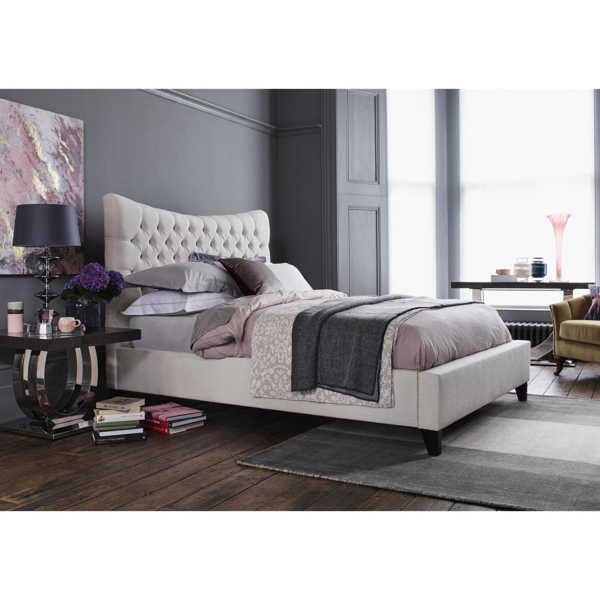 Beautifully curved and with handcrafted pleated and buttoned upholstery, the Jessie range of bedframes is the essence of contemporary luxury. Bedframes are extra wide, and designed to stylishly surround the mattress in unashamedly opulent contemporary style. Choose a static bedframe or opt for an ottoman bedframe which offers useful under bed storage – both styles are available in double, king and super king sizes and in a huge range of gorgeous fabrics and colours. Headboard comes as one single piece. The contemporary Jessie bedframe combines modern lines with traditional upholstery techniques. The result is perfection. With its curved silhouette and lavishly pleated and buttoned upholstered headboard, this gorgeous bedframe stylishly surrounds the mattress, adding extra width for a luxurious and contemporary look. And it’s so beautifully made. Both the frame and the upholstery are hand crafted, and it shows in the details. Choose from a wide range of fabrics, including velvets and wools, in an equally wide selection of colours both subtle and bright. The hand-made frame’s sprung slatted base supports any style of mattress, including pocket sprung and memory foam, and is available in double, king and super king sizes. The. British-made Jessie bedframe is part of the Jessie range which also includes an ottoman bedframe which incorporate useful concealed storage. Mattress available separately.
