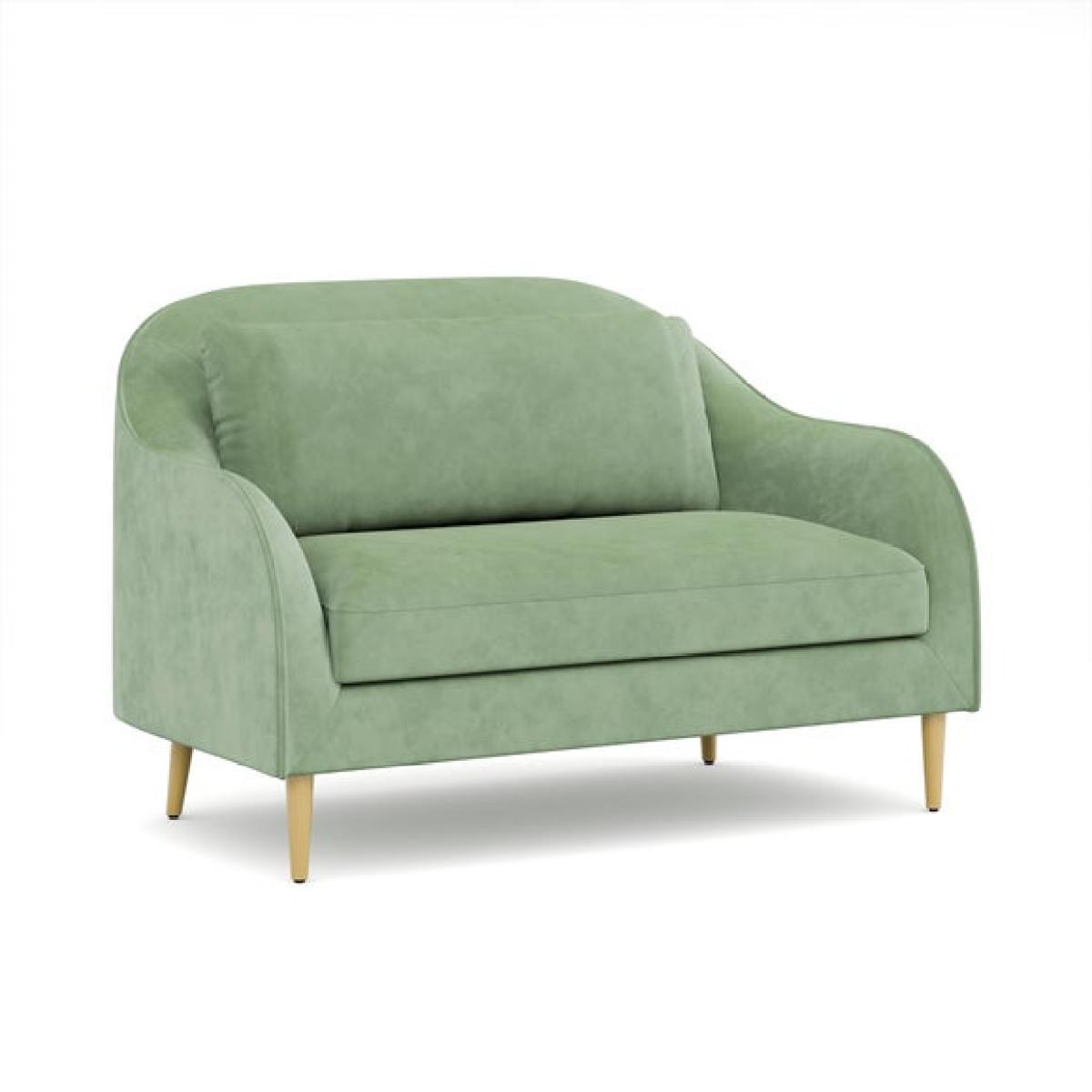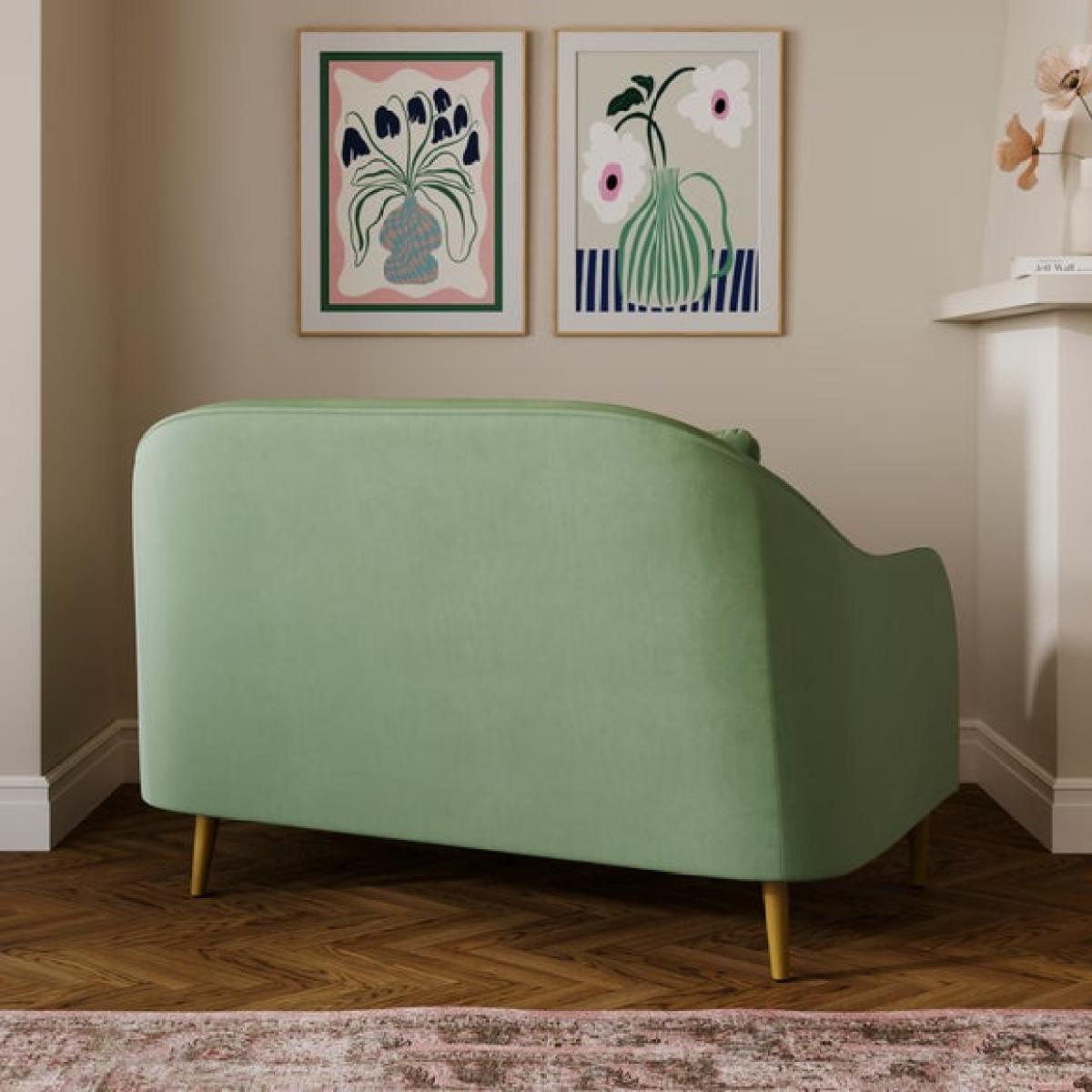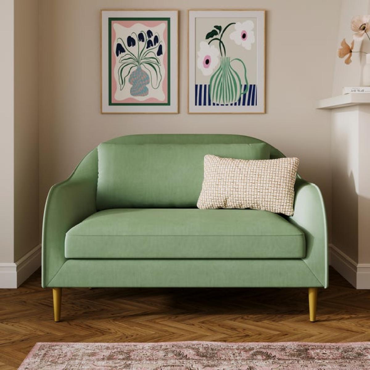 I love this little sofa for its versatility and retro-inspired charm. It works particularly well in modern, Scandinavian, or eclectic interiors where a pop of colour and playful silhouette add personality. Its soft green hue offers a fresh, calming vibe and pairs beautifully with neutral tones or bold accents like blush pinks or mustard yellows. Practical styling tips include adding textured cushions, mixing different fabric patterns, or even layering with a cosy throw for extra comfort. Positioned against a feature wall or tucked into a cosy corner, this sofa makes a practical yet stylish addition to smaller living spaces or as a statement piece in open-plan rooms.