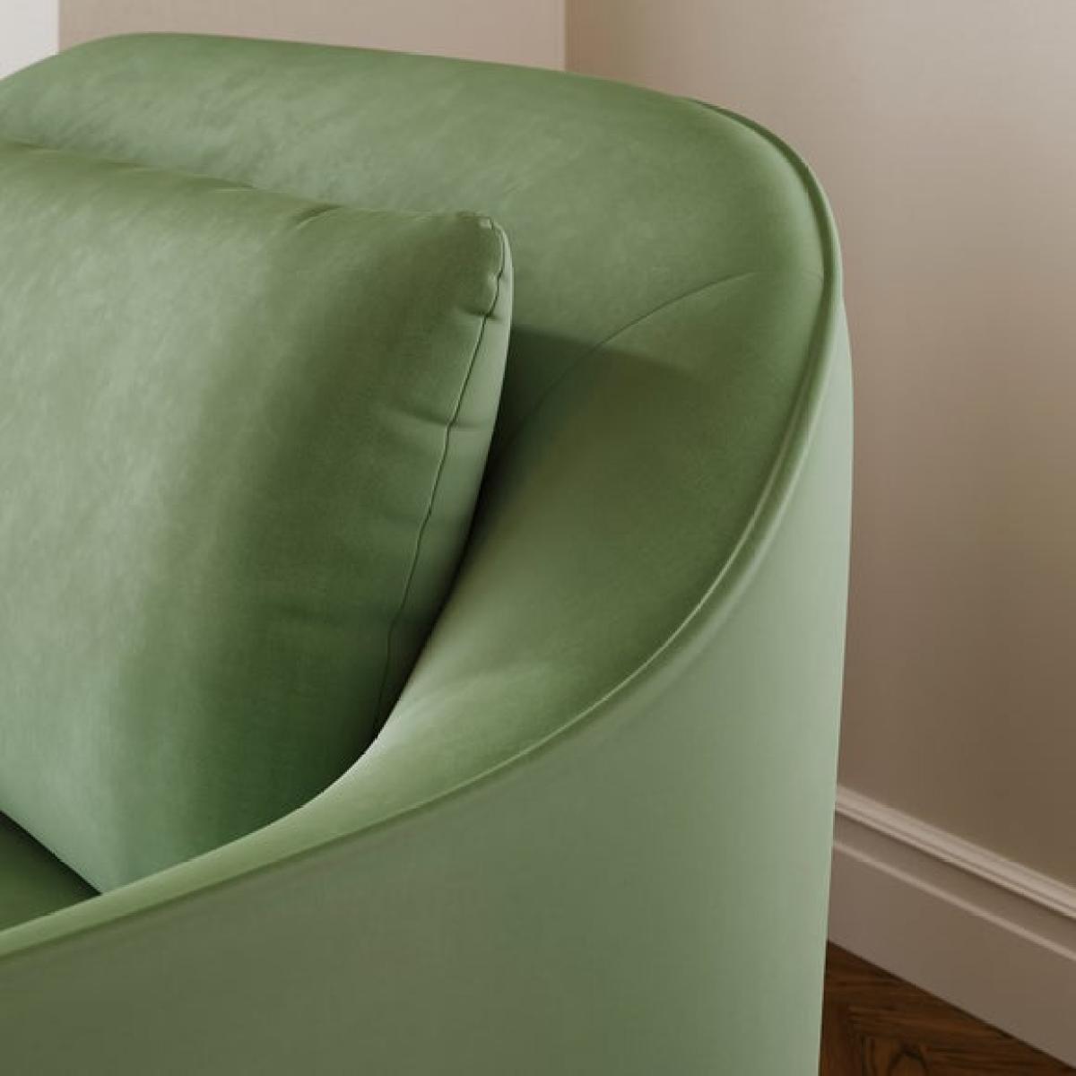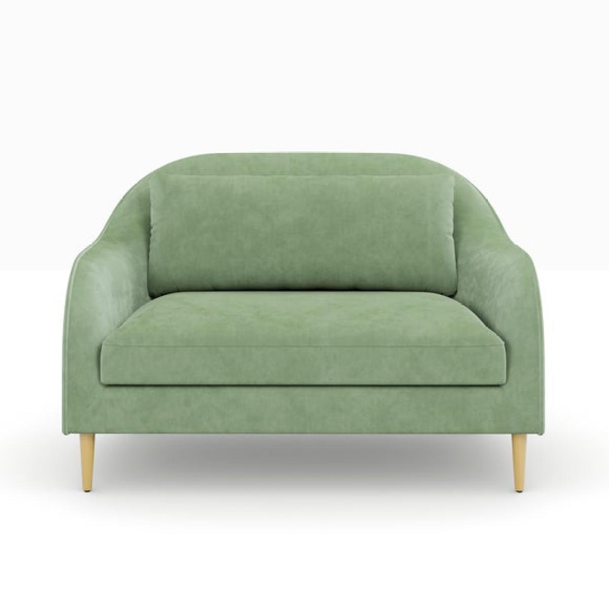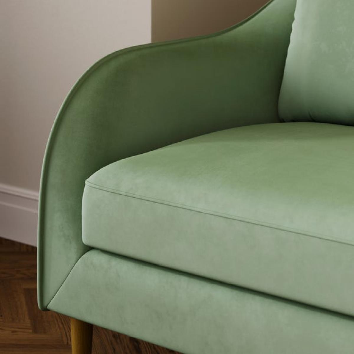 I love this little sofa for its versatility and retro-inspired charm. It works particularly well in modern, Scandinavian, or eclectic interiors where a pop of colour and playful silhouette add personality. Its soft green hue offers a fresh, calming vibe and pairs beautifully with neutral tones or bold accents like blush pinks or mustard yellows. Practical styling tips include adding textured cushions, mixing different fabric patterns, or even layering with a cosy throw for extra comfort. Positioned against a feature wall or tucked into a cosy corner, this sofa makes a practical yet stylish addition to smaller living spaces or as a statement piece in open-plan rooms.