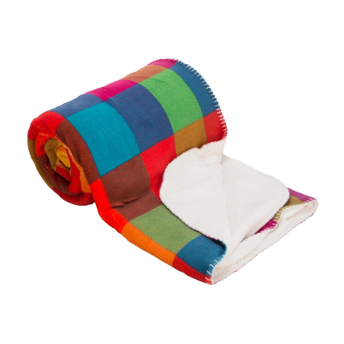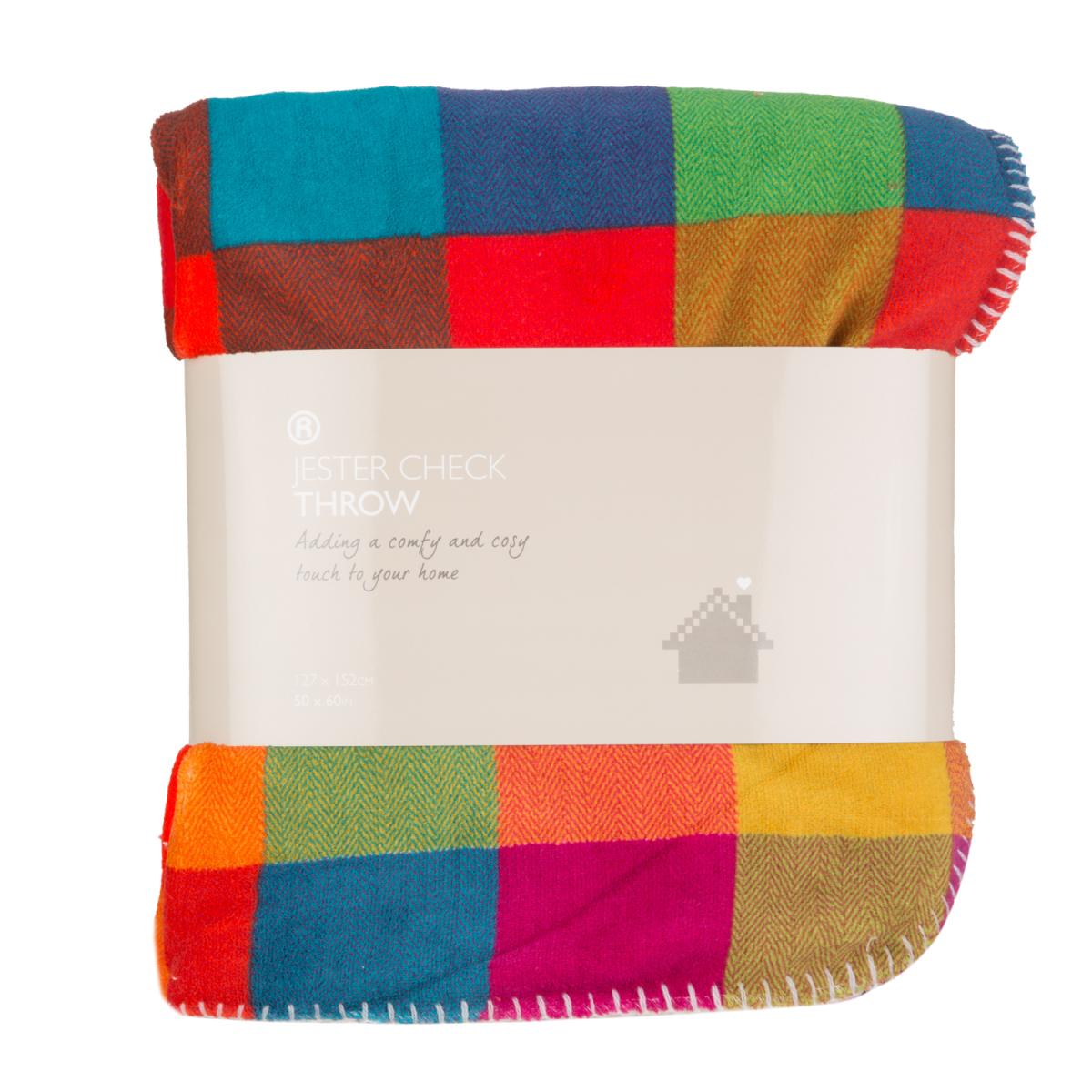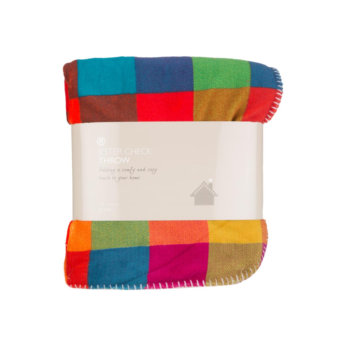 A vibrantly coloured square pattern of multiple hues gives this Jester Check Throw a cheerful and eye catching appearance. Featuring a rounded corners and reverse of thick woolly white fabric, this throw offers a snuggly and warm way to add bright and bold style to the room.