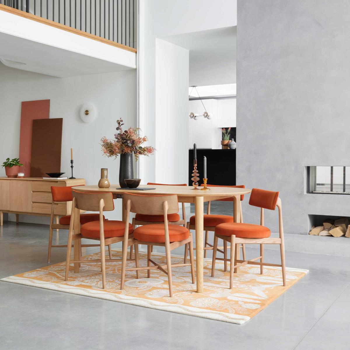 I’m a big fan of the Jethro extending oak table for its clean lines and solid oak finish, which slot effortlessly into Scandi-inspired, modern farmhouse or pared-back contemporary spaces. The smooth mechanism lets you go from an intimate round setting at 130 cm to a more sociable 170 cm in seconds, making it practical for both weekday breakfasts and weekend dinner parties. To style it, keep the look fresh with a simple vase of greenery or sculptural bowl in the centre, pair it with mixed-material chairs (think upholstered seats or rattan backrests) and anchor the area with a low-pile rug in a neutral tone to define the dining zone without overwhelming the natural wood.