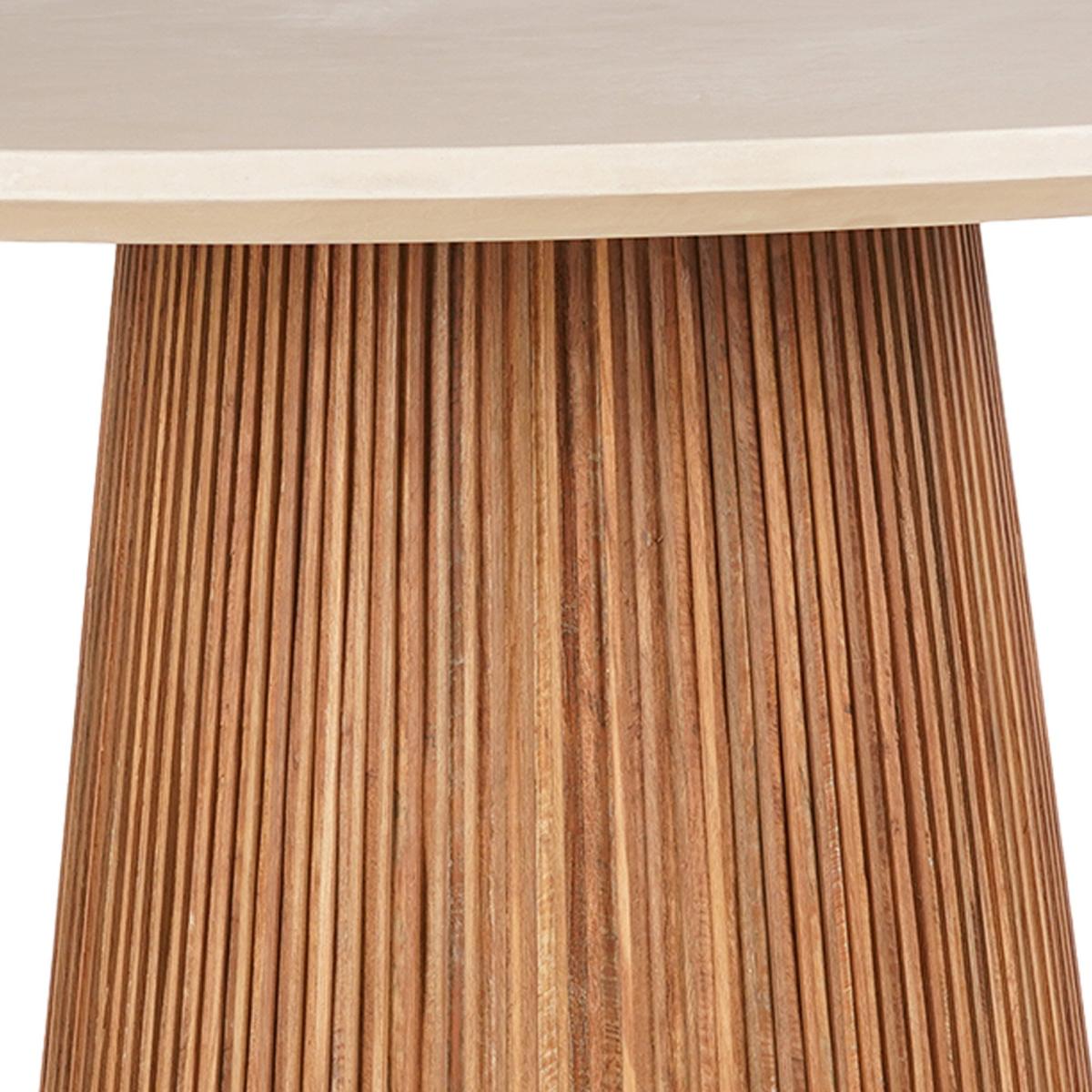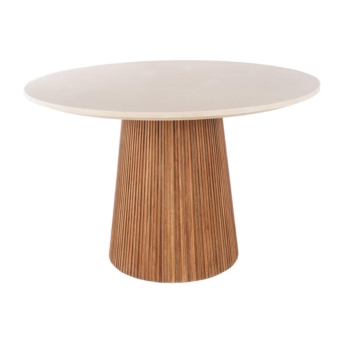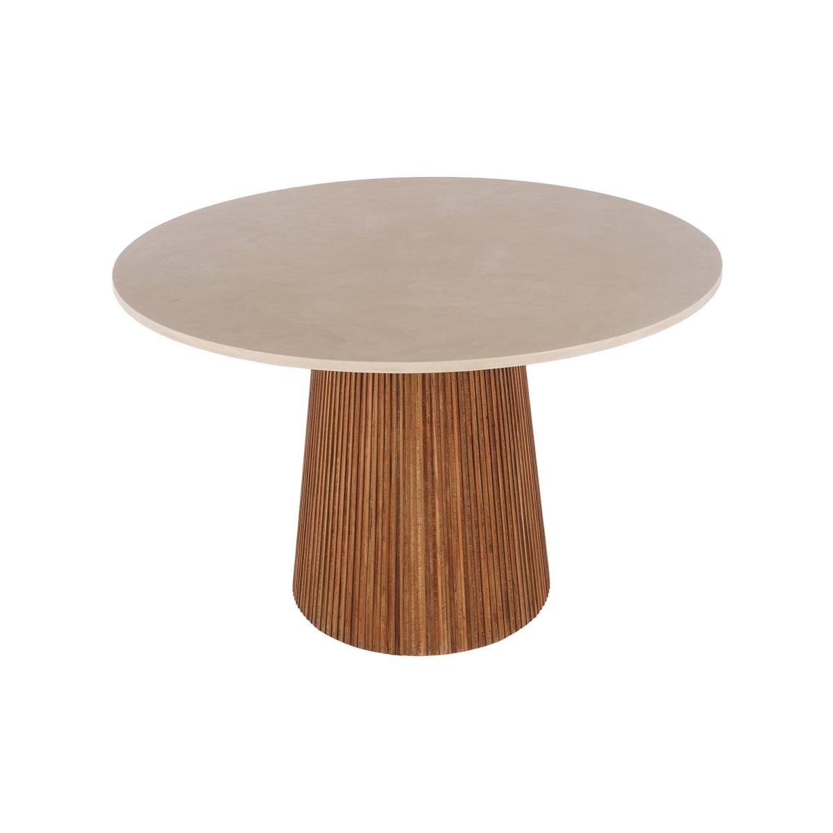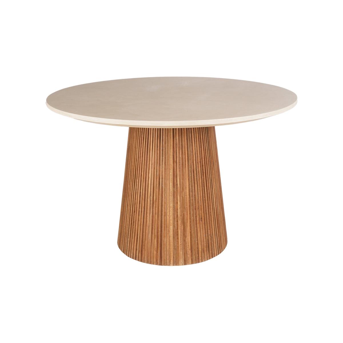 Elevate your dining space with the Jett Round Dining Table, a perfect combination of contemporary design and natural warmth. Featuring a 120 cm sand-finished mortex top, it provides the sleek appearance of stone with a smooth, durable surface that's easy to care for. The sculptural base, made from ribbed teak, adds texture, character, and stability, making the table both sturdy and stylish. Comfortably seating four and capable of accommodating up to six, this round table promotes connection and conversation. A timeless centrepiece, the Jett Round Dining Table is suitable for both everyday meals and special occasions.