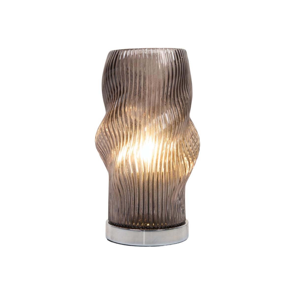 Infuse your indoor space with a hit of personality using this Jettson Table Lamp. Its unique, irregularly shaped glass shade features a smoky grey, ribbed finish that softly diffuses light to cast a welcoming glow. Ideal for nightstands, side tables, mantels or any dull corner in your home, this table lamp makes a decorative and functional addition to any decor.
