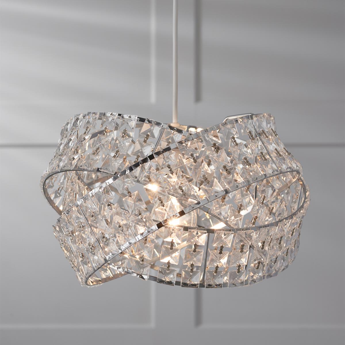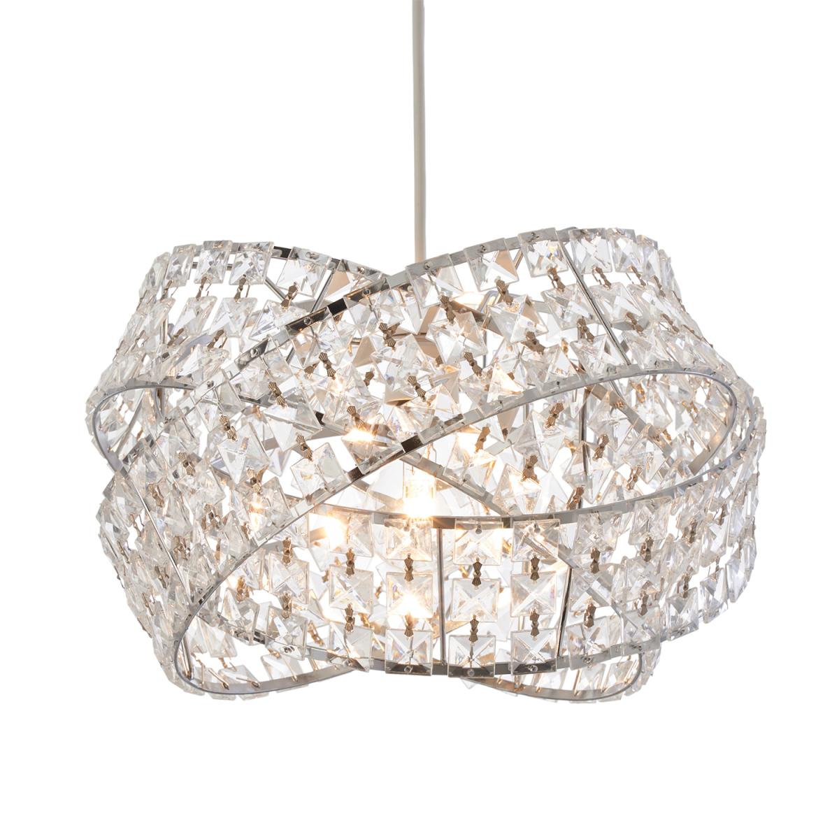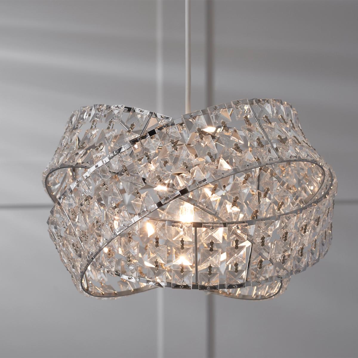 This glamorous Jewelled Twisted Pendant is formed from three interlinked rings, each with metal framing and a wall of square-shaped crystals. These rings encircle the bulb to create a stunning light display as the beams shine through every jewel.