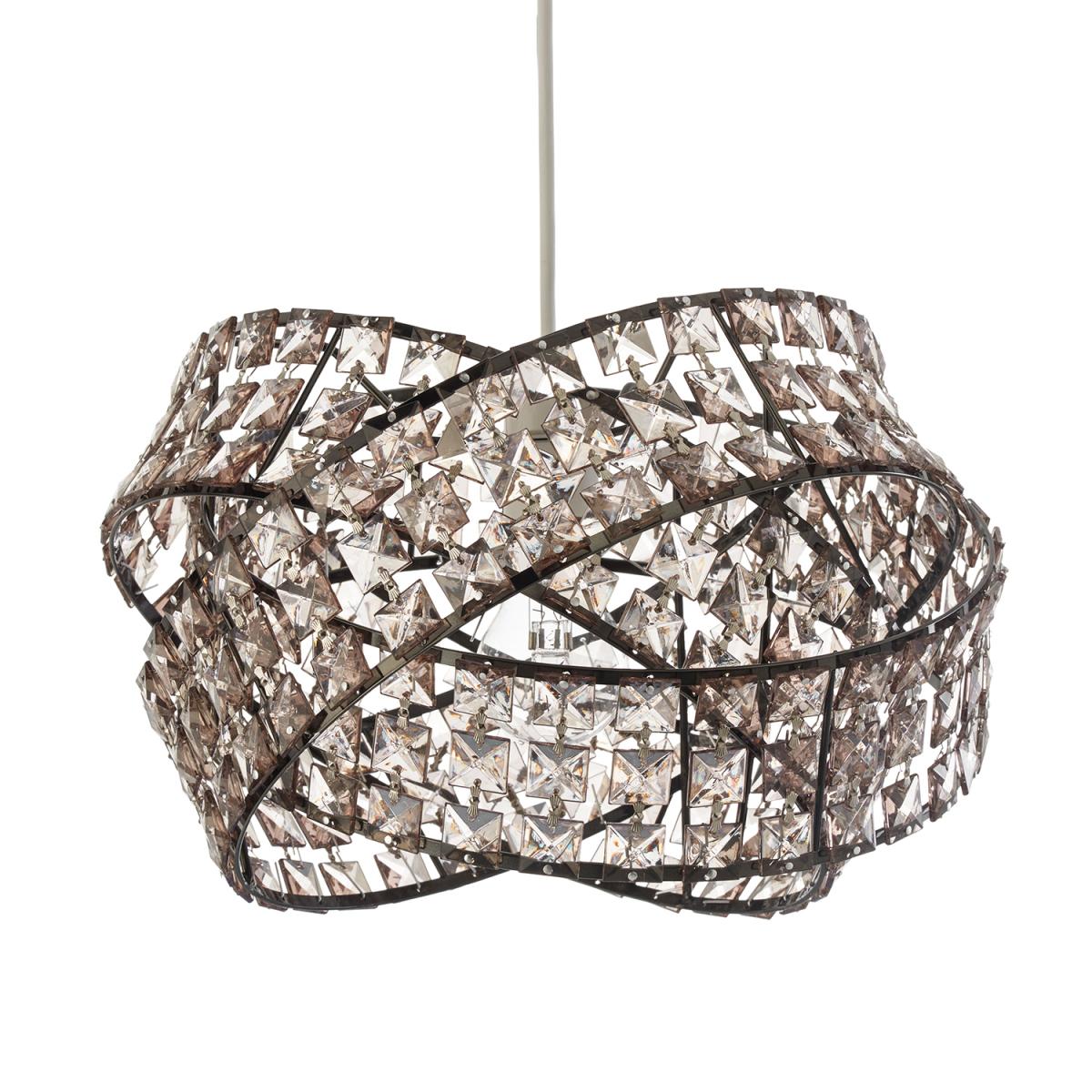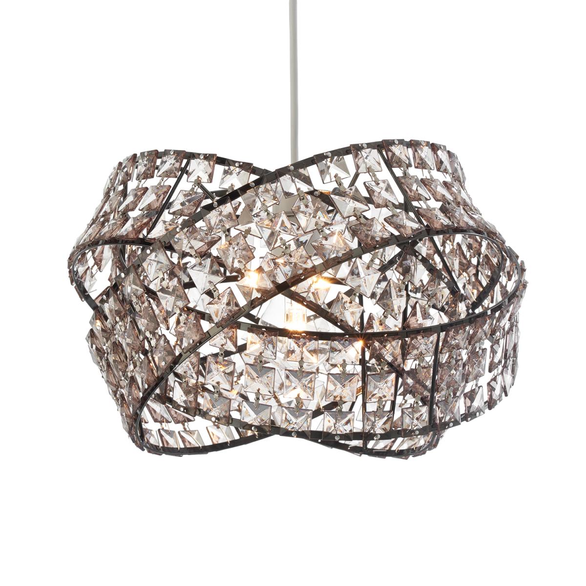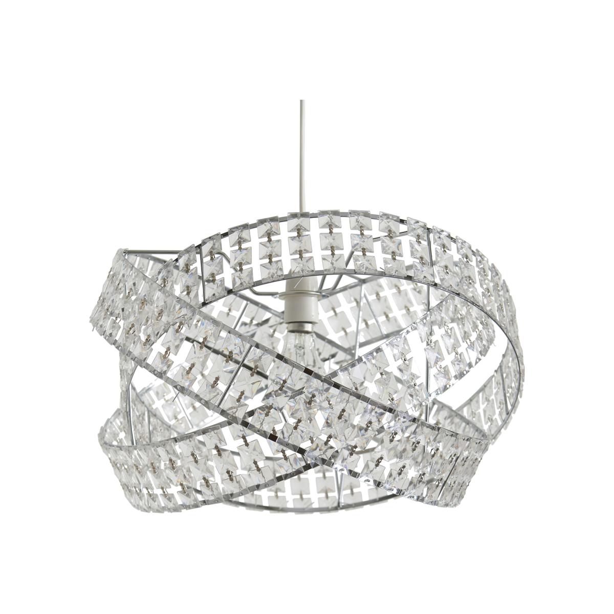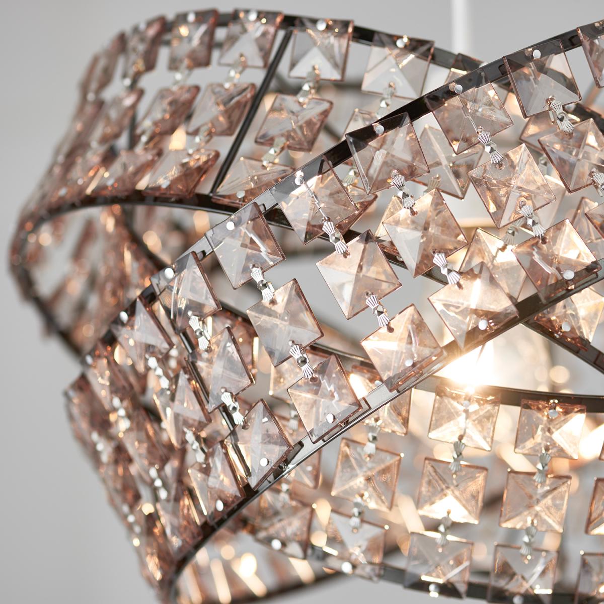 This glamorous Jewelled Twisted Pendant is formed from three interlinked rings, each with metal framing and a wall of square-shaped crystals. These rings encircle the bulb to create a stunning light display as the beams shine through every jewel.