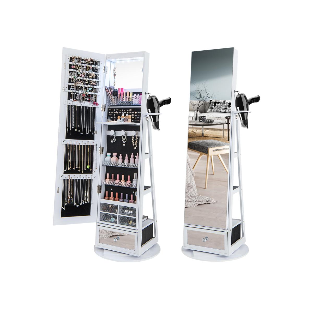 This incredible cabinet comes with a range of features that satisfy all your jewellery storage needs. There are 6 rows of earring racks, 3 rows of necklace hooks and 5 rows of ring slots with 1 foldable shelf. Additionally, you'll receive a hairdryer rack, an acrylic lipstick box, 3 bracelet rods, 2 detachable acrylic shelves, 4 acrylic drawers and 1 foldable non-woven fabric drawer at the bottom.