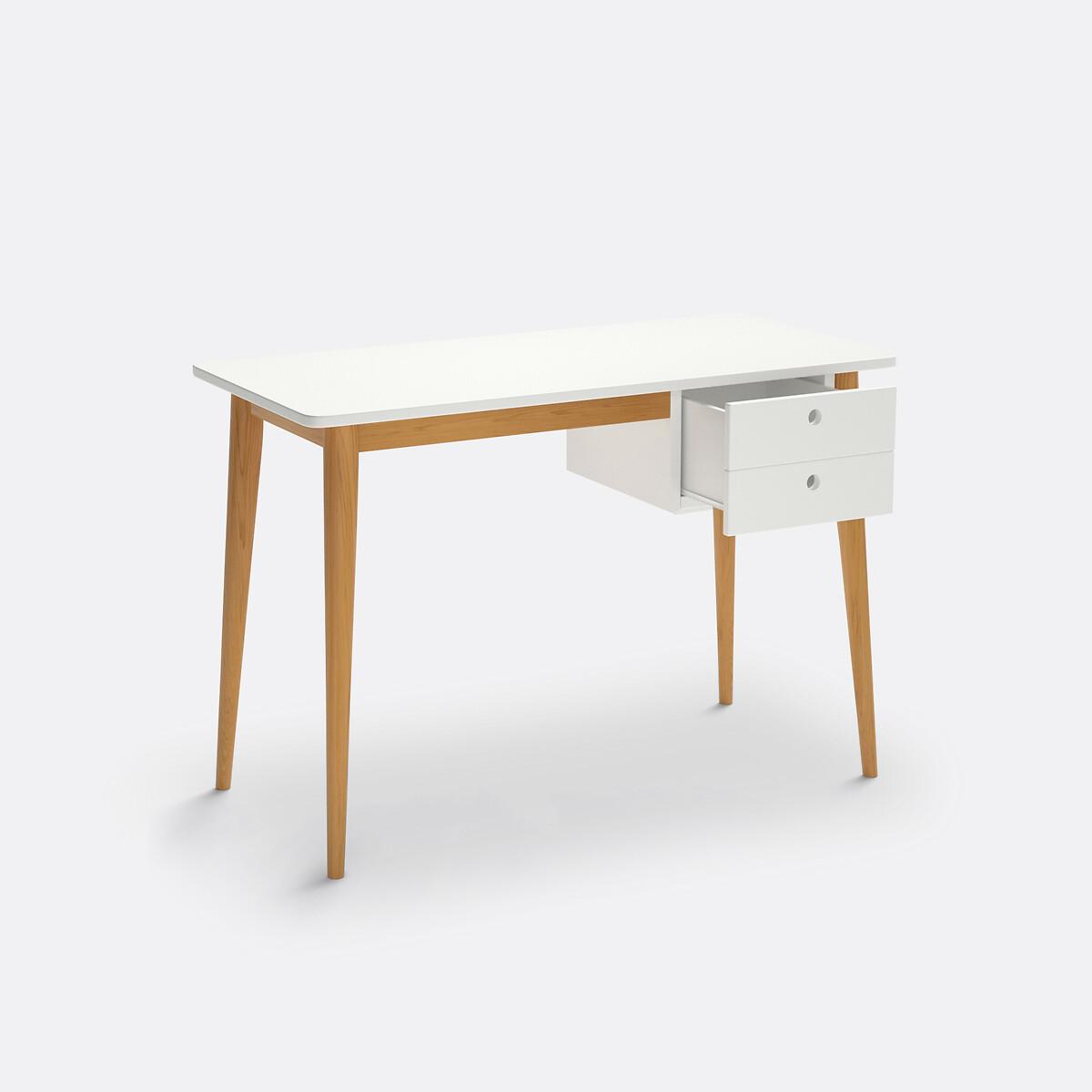 Jimi Scandinavian-style child's desk with solid pine legs. The Scandinavian styling creates an unusual and unique touch, meaning it fits perfectly into a child's bedroom. Product Details • 1 drawer • Solid pine tapered legs • Front and top in nitrocellulose lacquered MDF • Solid pine base • FSC® Mixed certified wood • Water-based varnish (or paint) finishDimensions. Total: • Length: 106cm • Height: 73cm • Depth: 50cm. Usable space • L23 x H15 x D38cmDelivery:. Assembly required. Available for home delivery. Note! Please check that all access points are large enough to accommodate your delivery (doors, stairs, lifts). • WOOD FROM SUSTAINABLY MANAGED FORESTS. FSC® certified wood comes from forests that are environmentally, socially and economically well managed. • WOOD FROM MORE SUSTAINABLY MANAGED FORESTS AND CONTROLLED SOURCES. FSC® Mix wood contains at least 70% FSC® certified and/or recycled wood, the remainder being FSC® controlled wood. Parcel Dimensions1 parcel • L120 x H57 x D19cm • 19kg