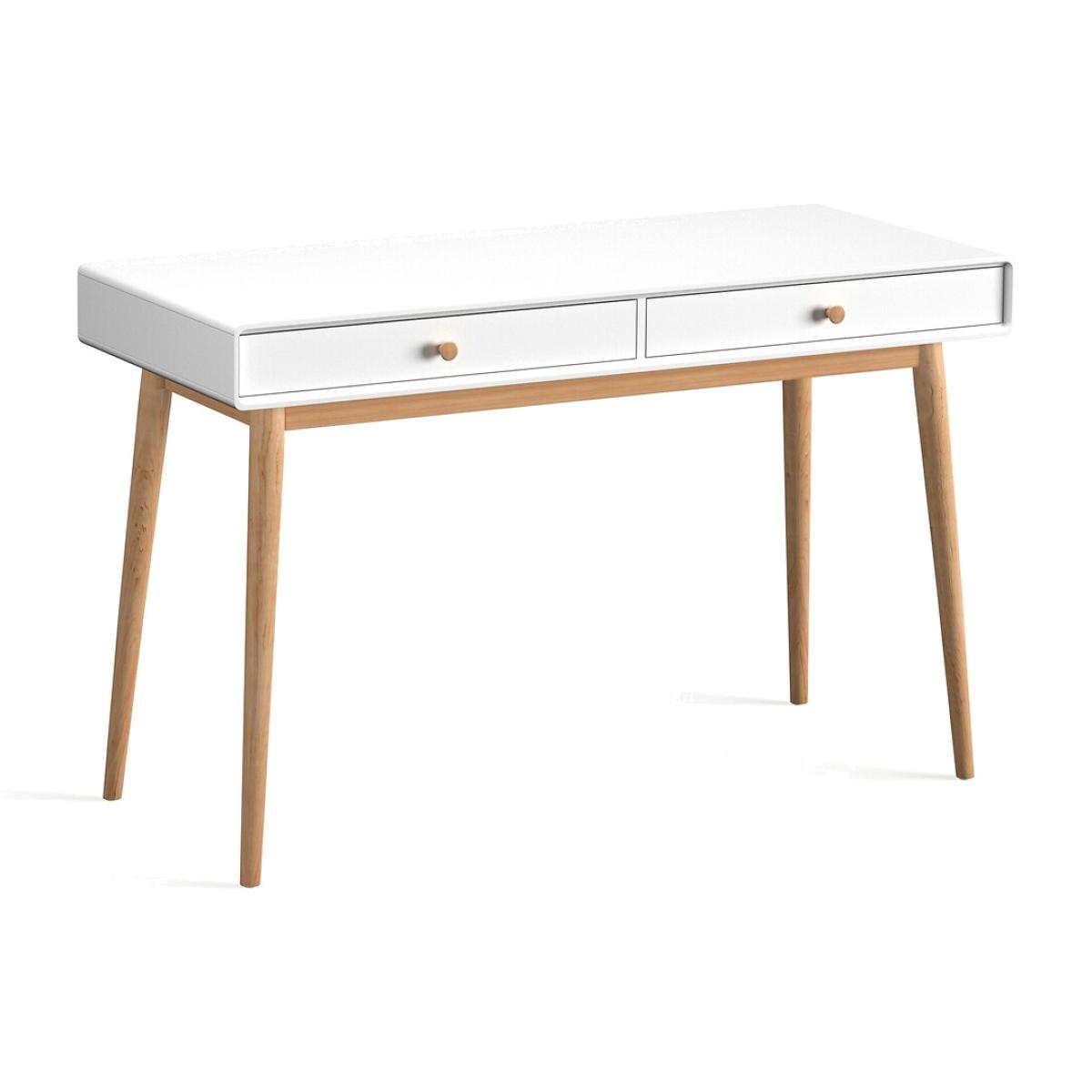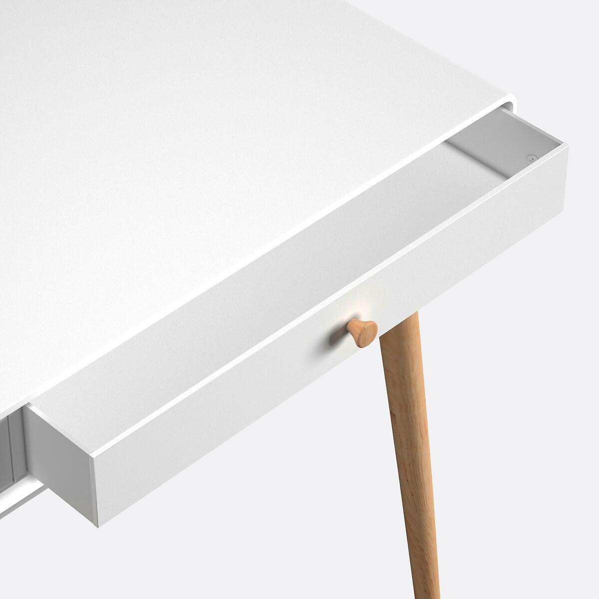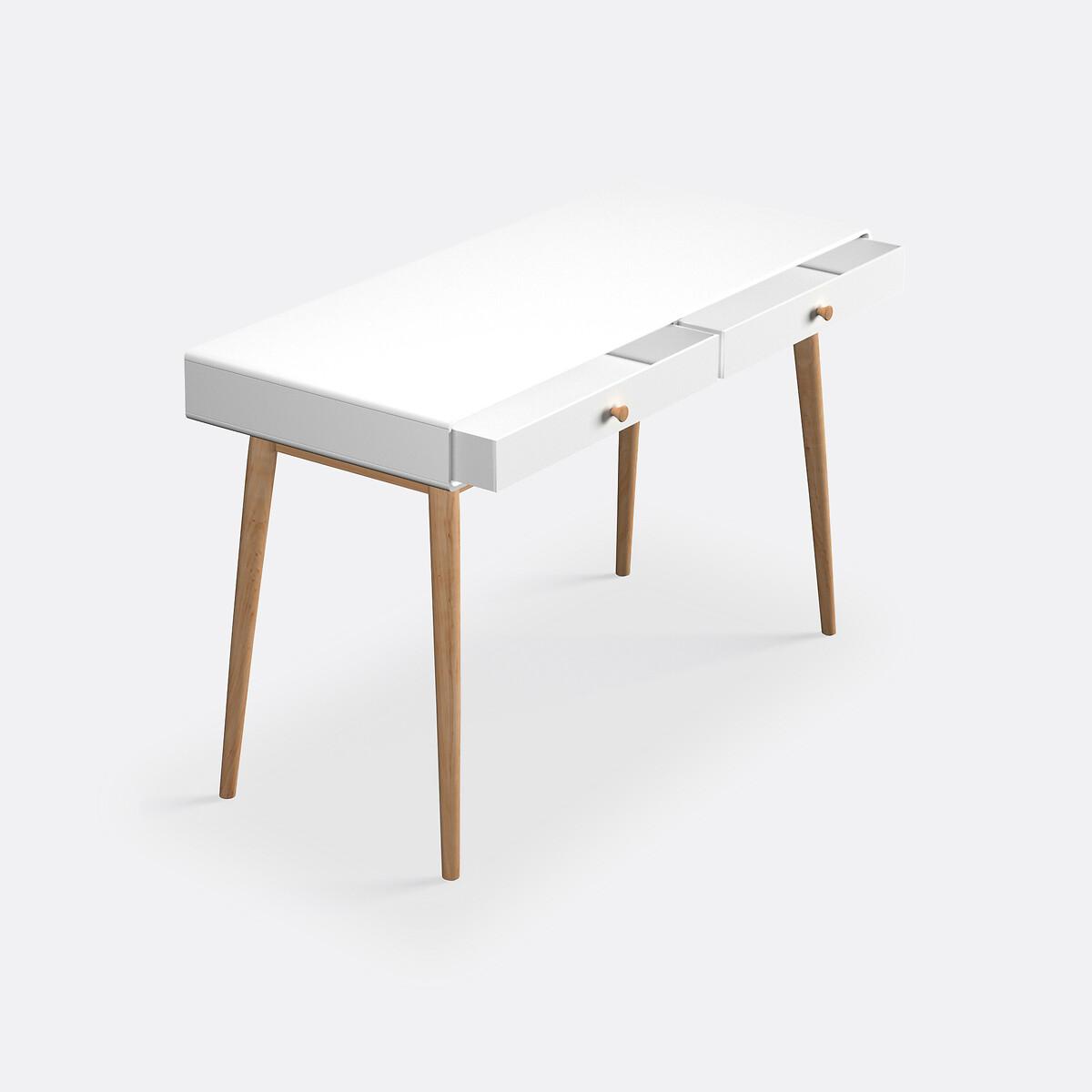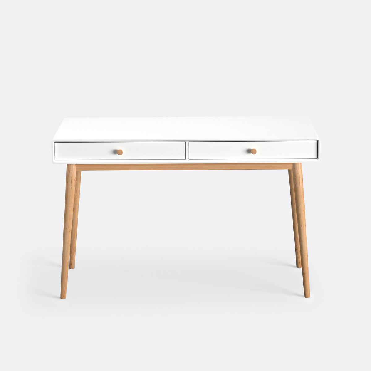Jimi 2 drawer desk. Bright, sleek and slender, this desk is a delight for any home, combining the best of retro and contemporary style – and offering useful storage space. Product Details • 2 drawers • Tapered legs • Pre-assembled body • Nitrocellulose varnish lacquered MDF box • Solid pine legs and drawer handles. Dimensions • Width: 120cm • Depth: 53cm • Height: 75cm • Dimensions. Useful dimensions for 1 drawer: 54.5 x 37.3 x 6cmDelivery:. This product is sold for self-assembly. Dimensions and weight of parcel:1 parcel • L130 x D63 x H20cm. • 28kg