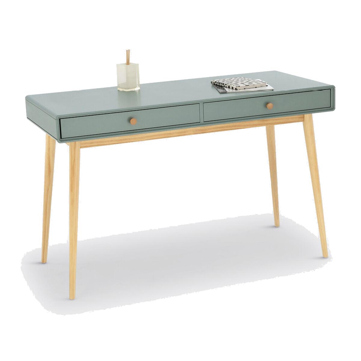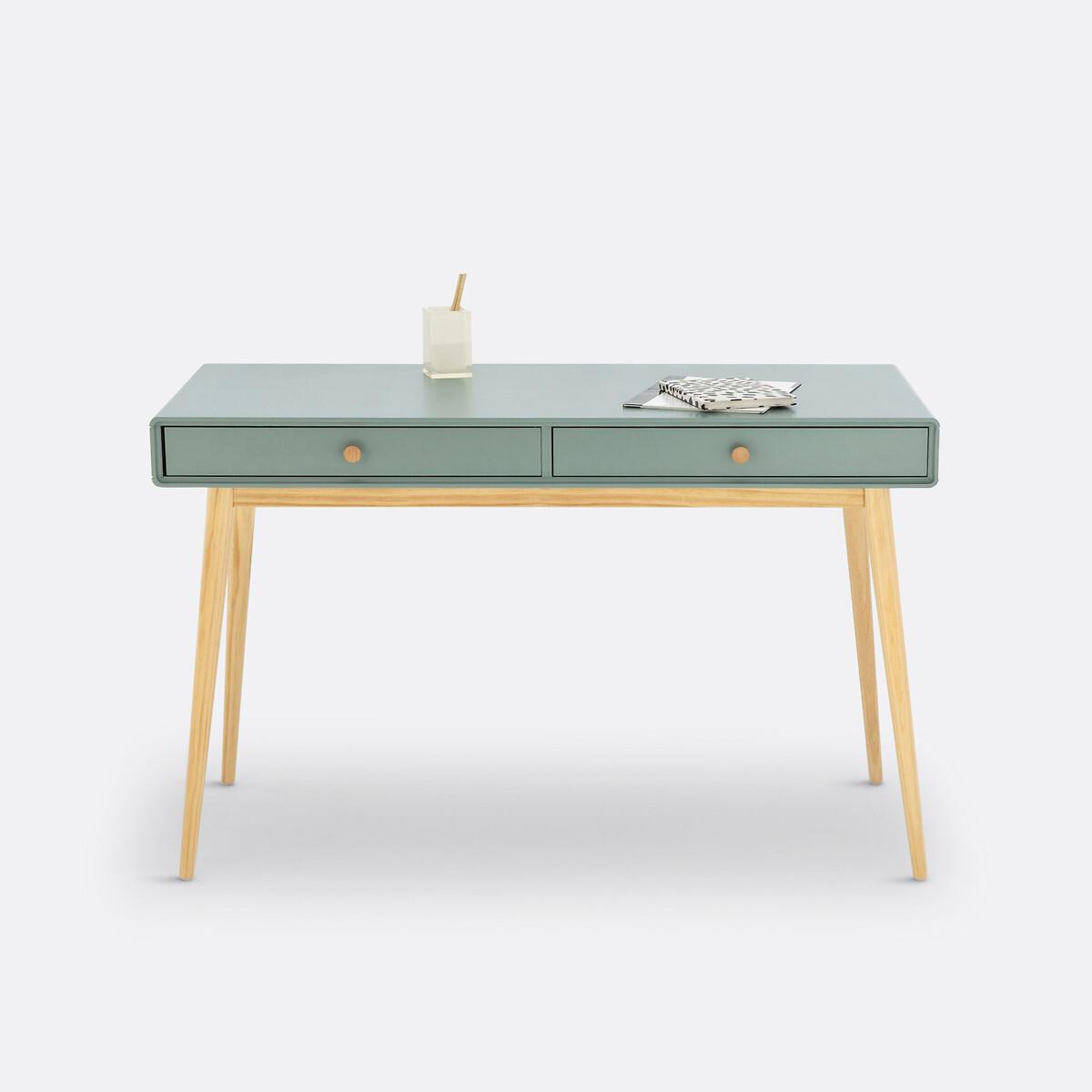 Jimi 2 drawer desk. Bright, sleek and slender, this desk is a delight for any home, combining the best of retro and contemporary style – and offering useful storage space. Product Details • 2 drawers • Tapered legs • Pre-assembled body • Nitrocellulose varnish lacquered MDF box • Solid pine legs and drawer handles. Dimensions • Width: 120cm • Depth: 53cm • Height: 75cm • Dimensions. Useful dimensions for 1 drawer: 54.5 x 37.3 x 6cmDelivery:. This product requires assembly. Available for home delivery. Note! Please check that all access points are large enough to accommodate your delivery (doors, stairs, lifts). • WOOD FROM SUSTAINABLY MANAGED FORESTS. FSC® certified wood comes from forests that are environmentally, socially and economically well managed. Dimensions and weight of parcel:1 parcelL13. 0 x D63 x H20cm.28kg