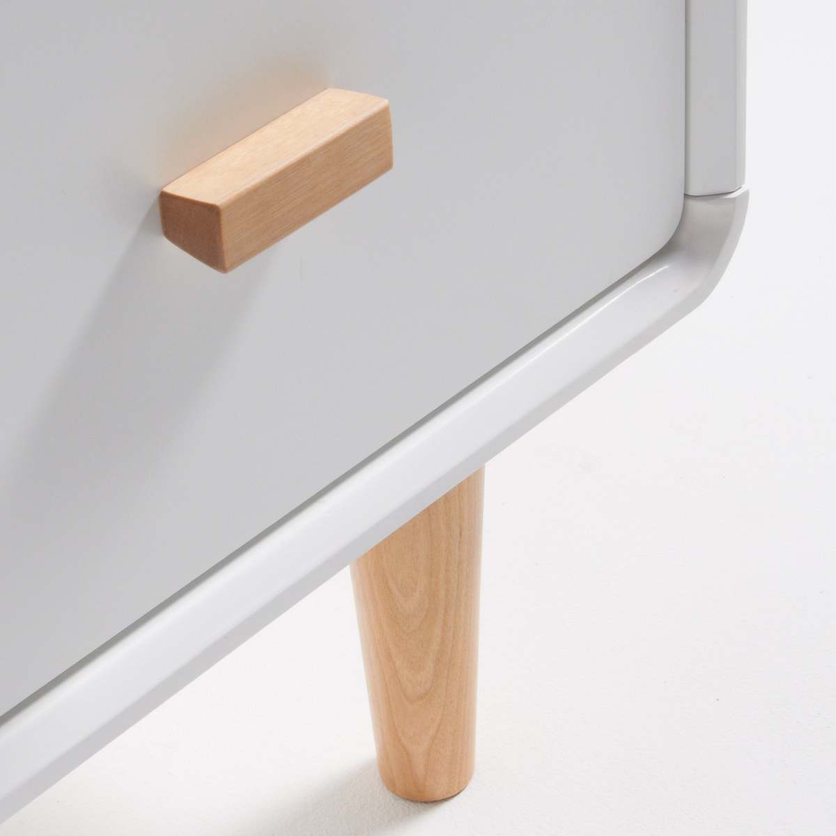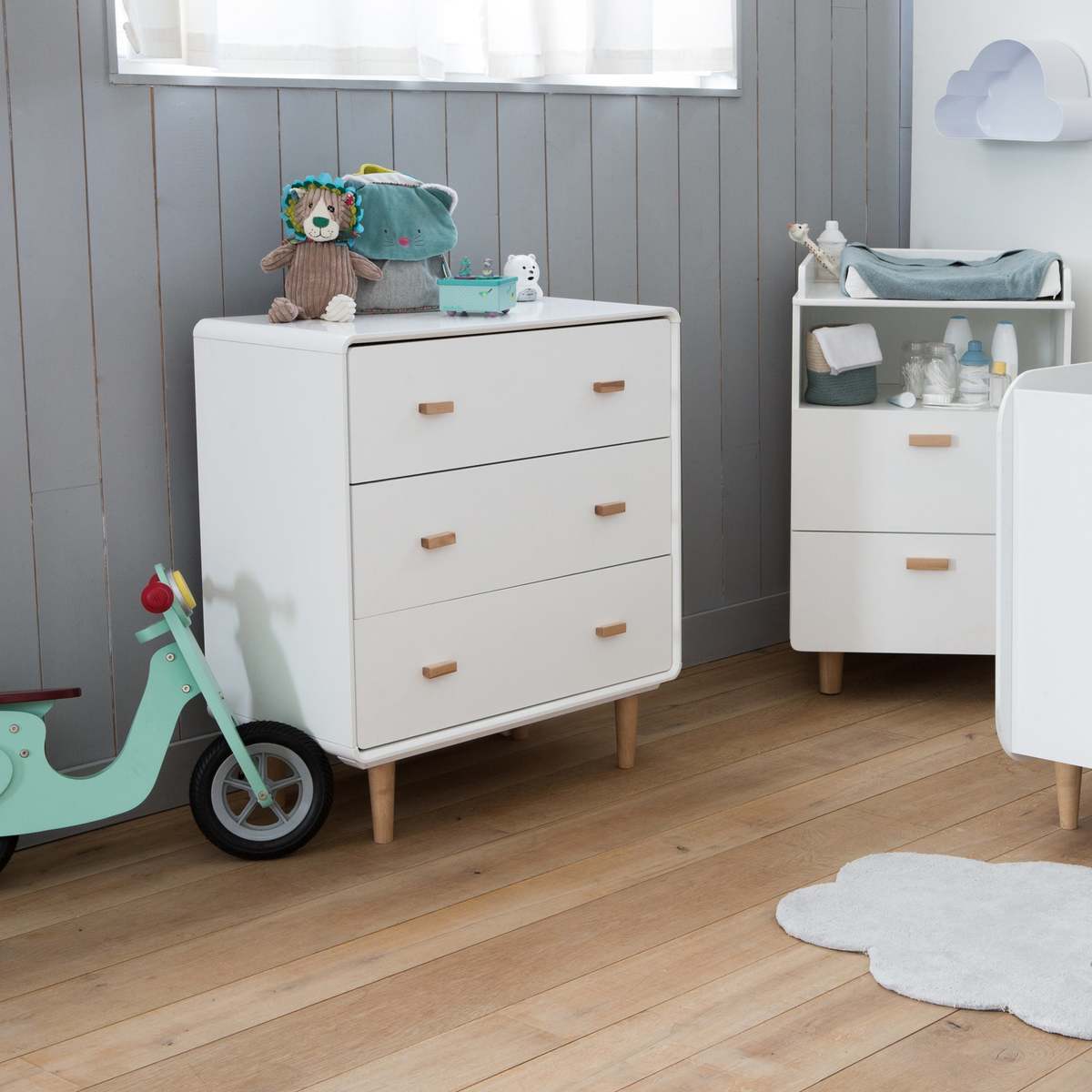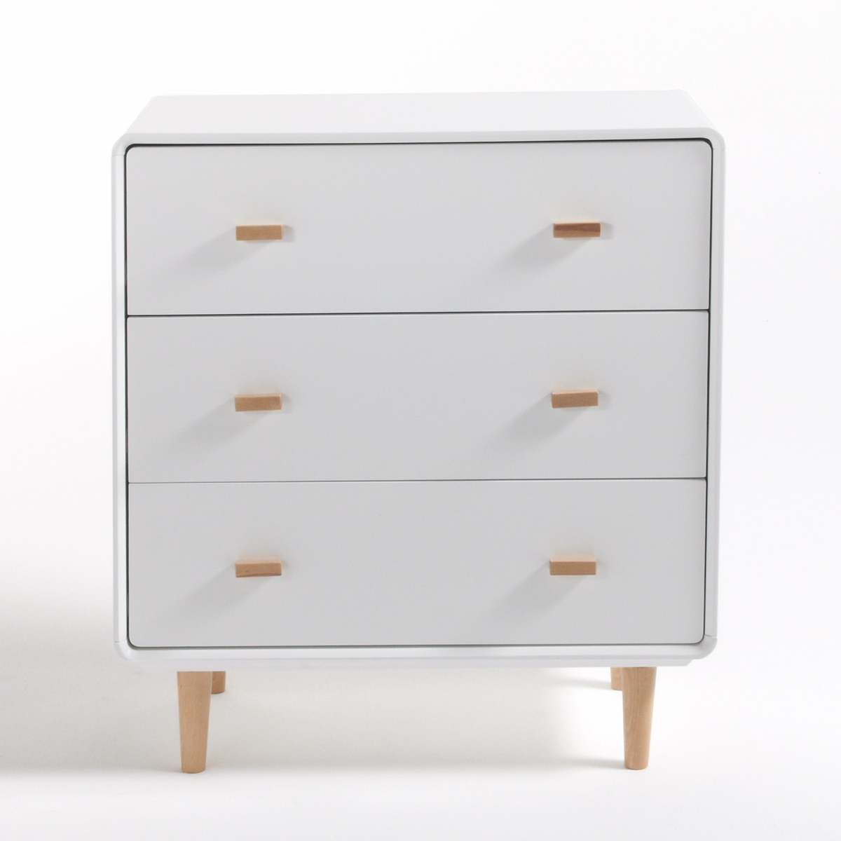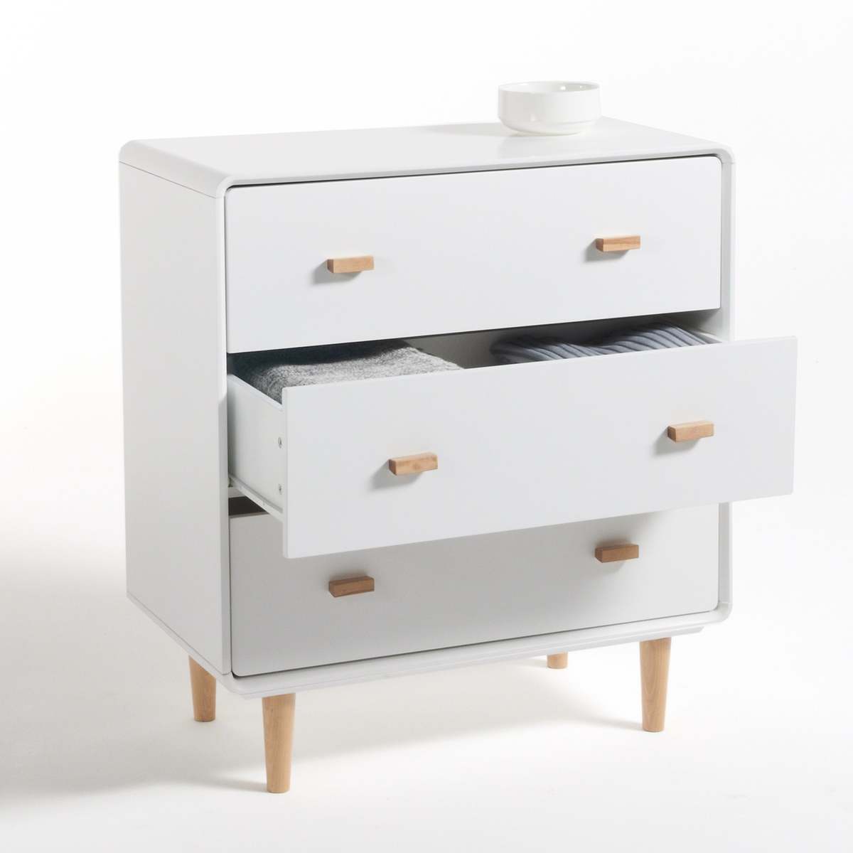 The Jimi 3-drawer chest follows the Scandinavian trend with its combination of white and light wood. It has a slight vintage look: with its tapered birch legs. Sleek and Scandinavian-inspired, this JIMI chest of drawers is a delight for any home.