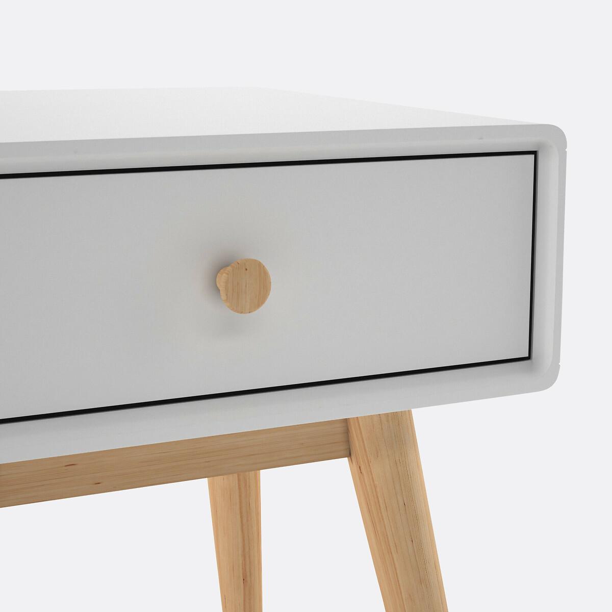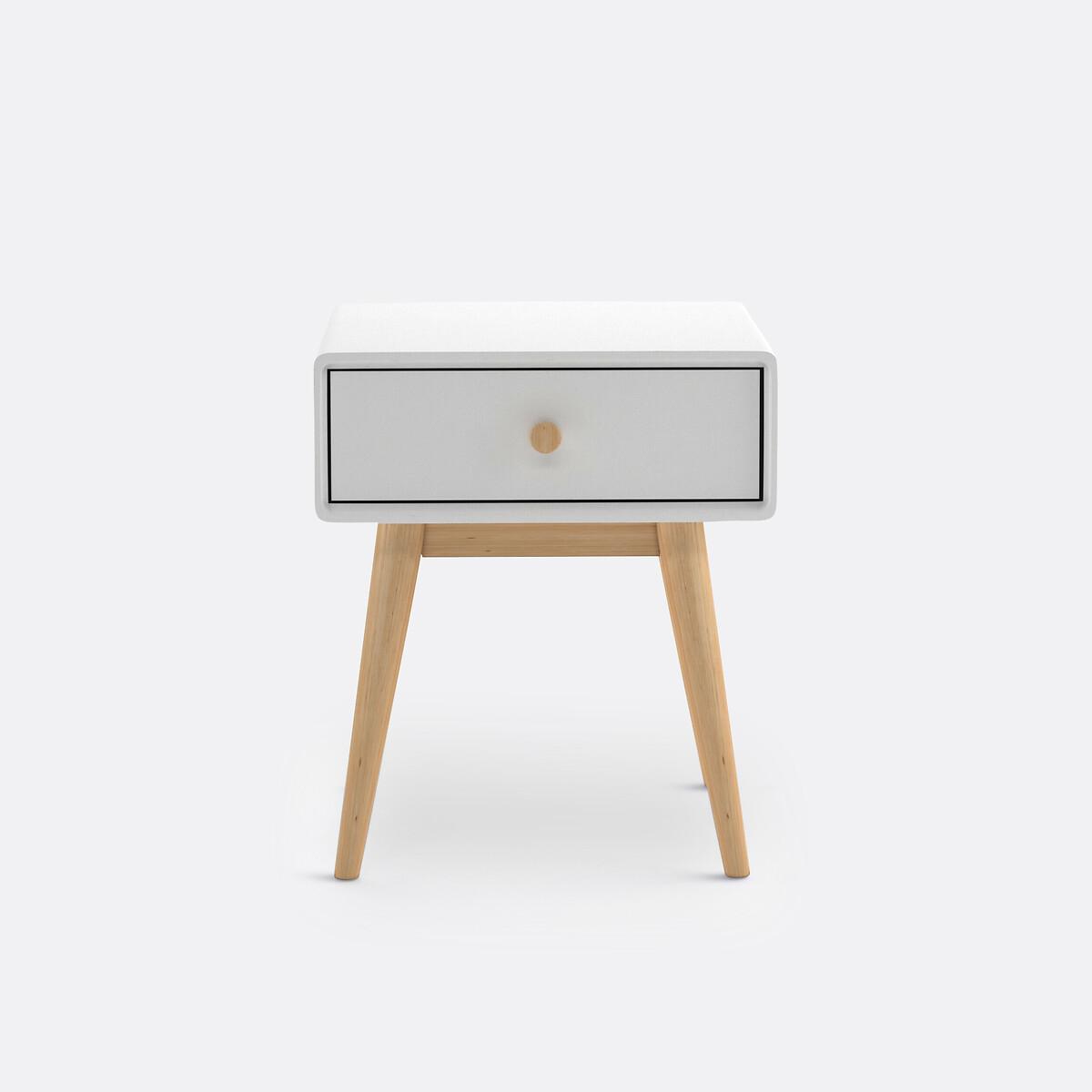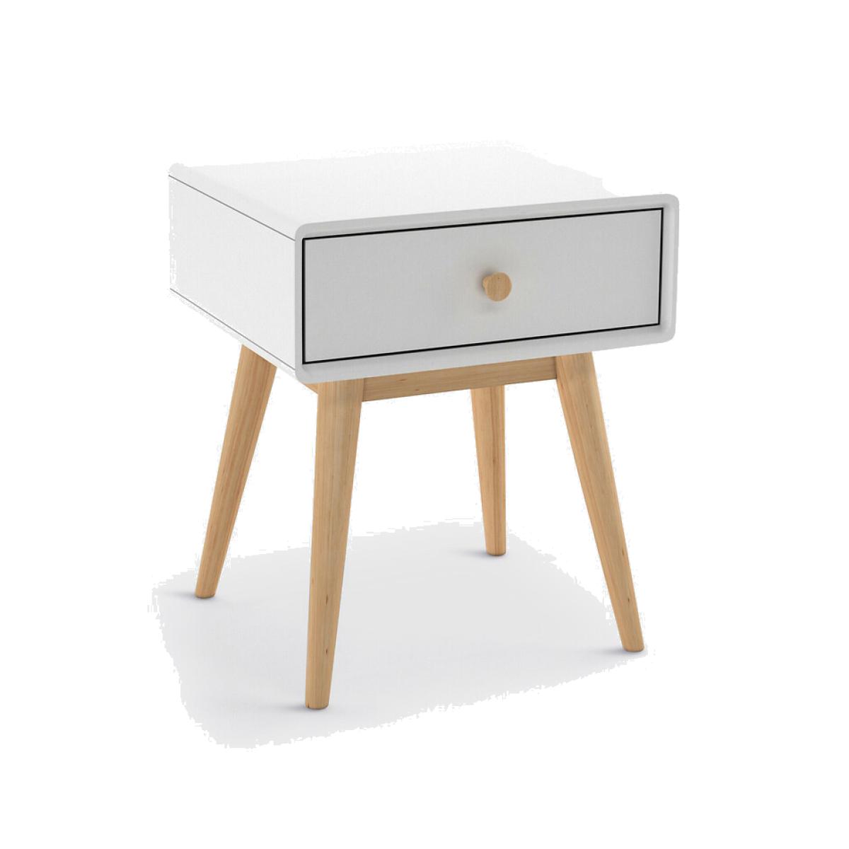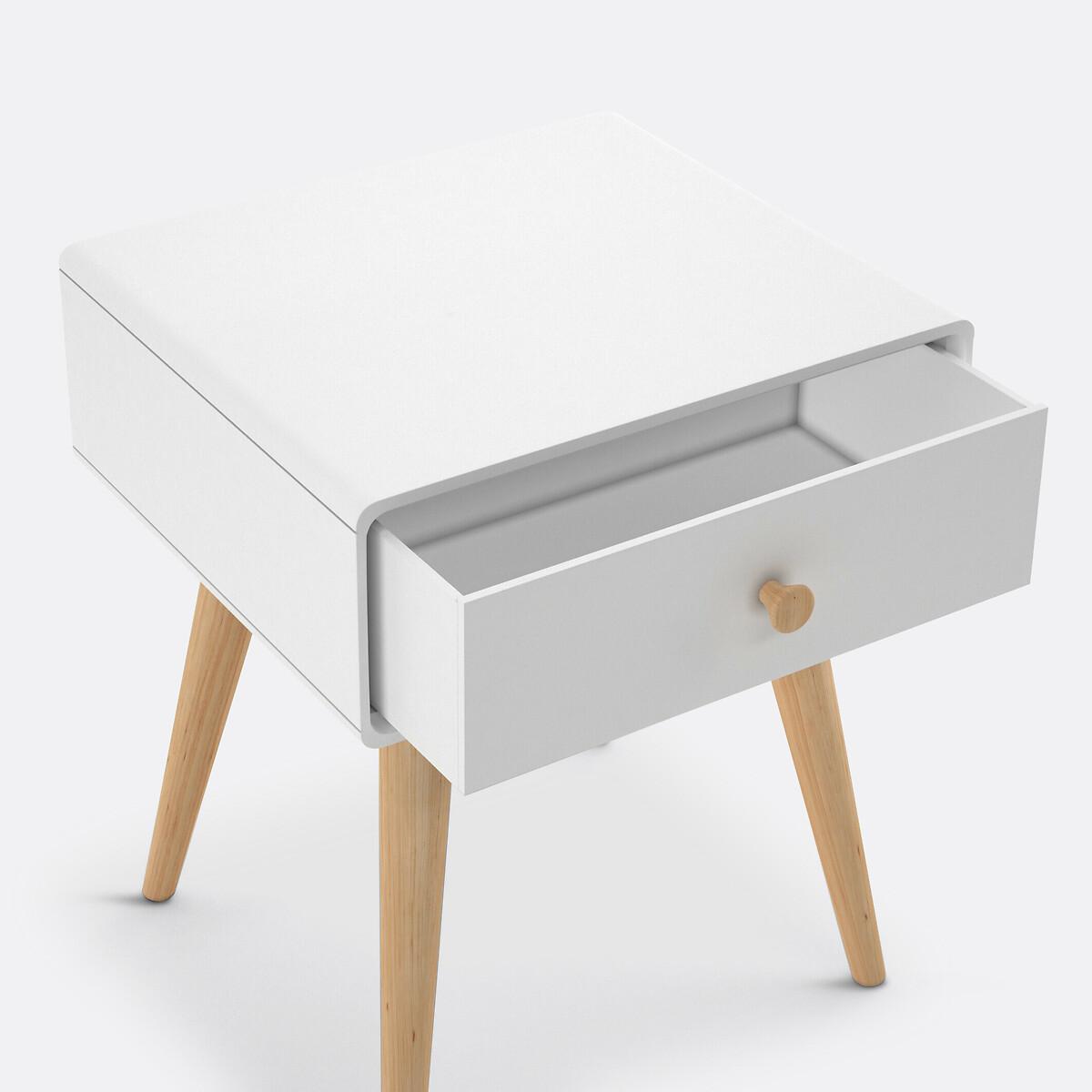 Jimi bedside table with 1 drawer. With its Scandinavian lines, this stylish bedside table is a delightful everyday item. Product Details • 1 drawer • Lacquered MDF. • Solid pine legs. • Nitrocellulose finishDimensions. Total: • Length: 40cm • Height: 47cm • Depth: 36cmDelivery:. This product requires assembly. Available for home delivery. Note! Please check that all access points are large enough to accommodate your delivery (doors, stairs, lifts). • WOOD FROM SUSTAINABLY MANAGED FORESTS. FSC® certified wood comes from forests that are environmentally, socially and economically well managed. Dimensions and weight of parcel: • L49 x H24,5 x D45 cm • 10kg