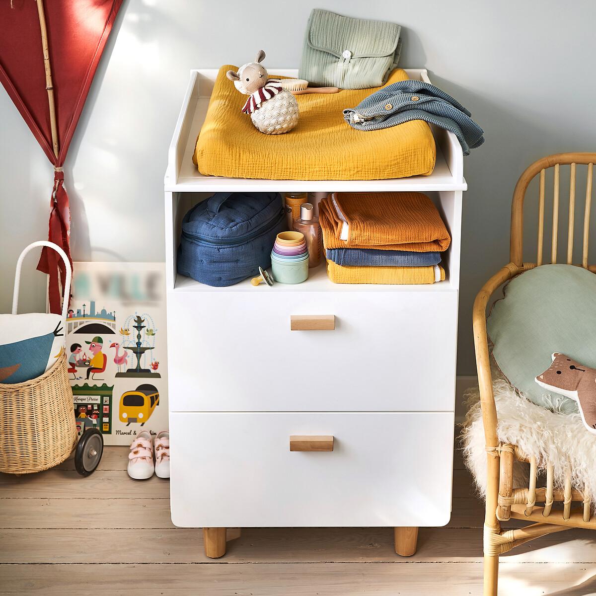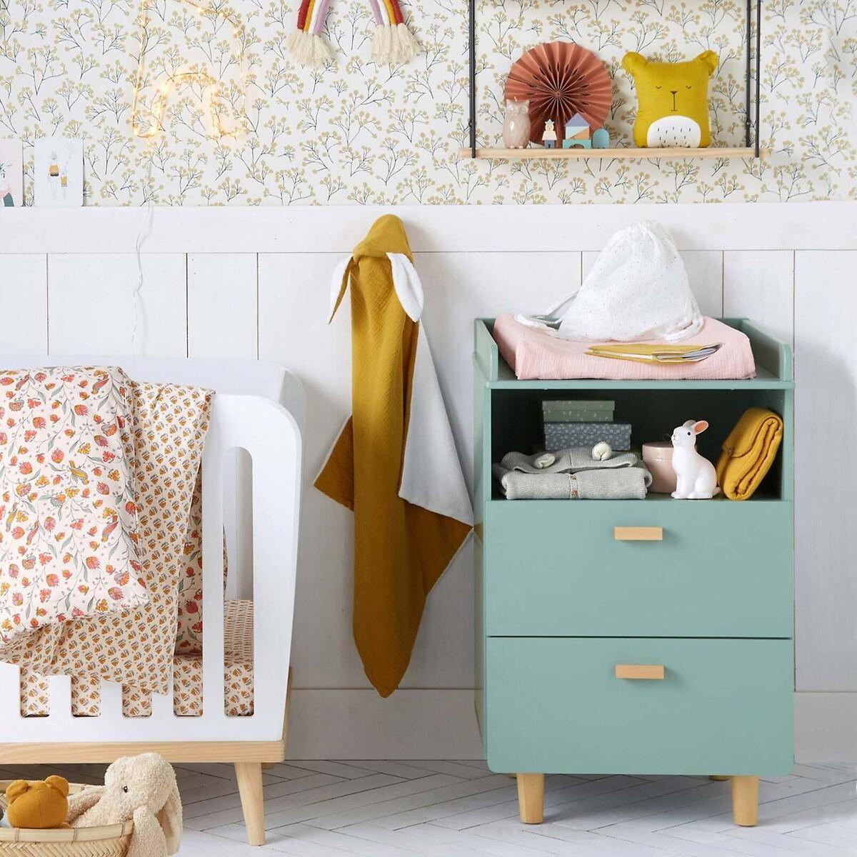 I love this changing unit for its clean lines and versatile design, making it a practical addition to a nursery or a contemporary child’s room. Its neutral colour palette allows it to seamlessly blend into various interior styles, from Scandi minimalism to modern eclectic. The open shelf offers easy access to essentials, while the pull-out drawers provide hidden storage, keeping the space organised. For styling, consider pairing it with neutral bedding and soft textiles for a calm atmosphere, or add a pop of colour with accessories like cushions or wall art. It works well in both small and larger nursery spaces, offering functionality without compromising on style.