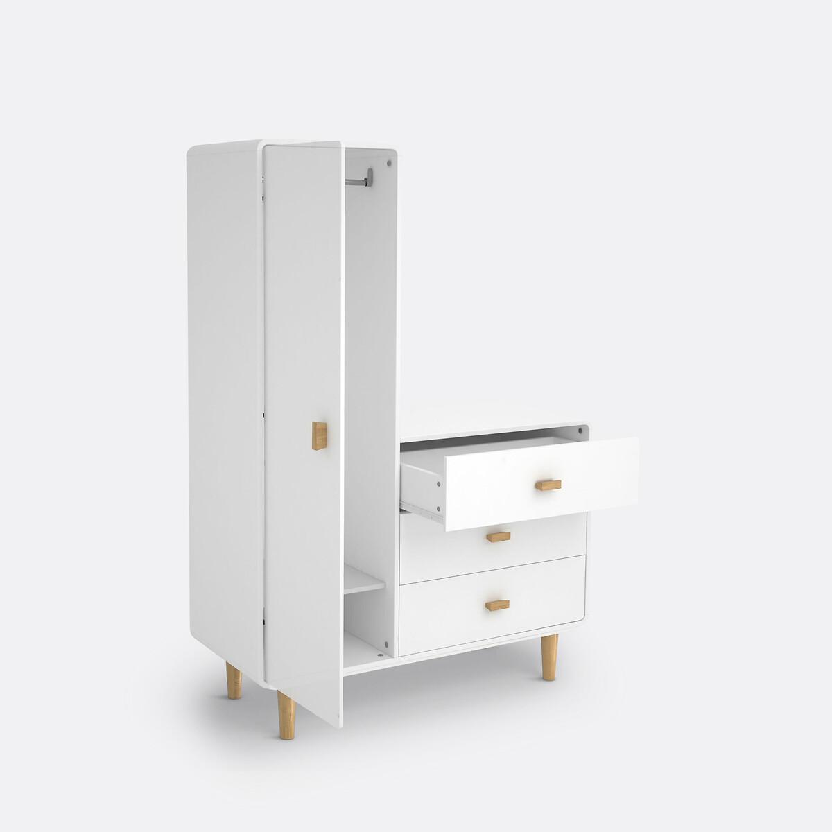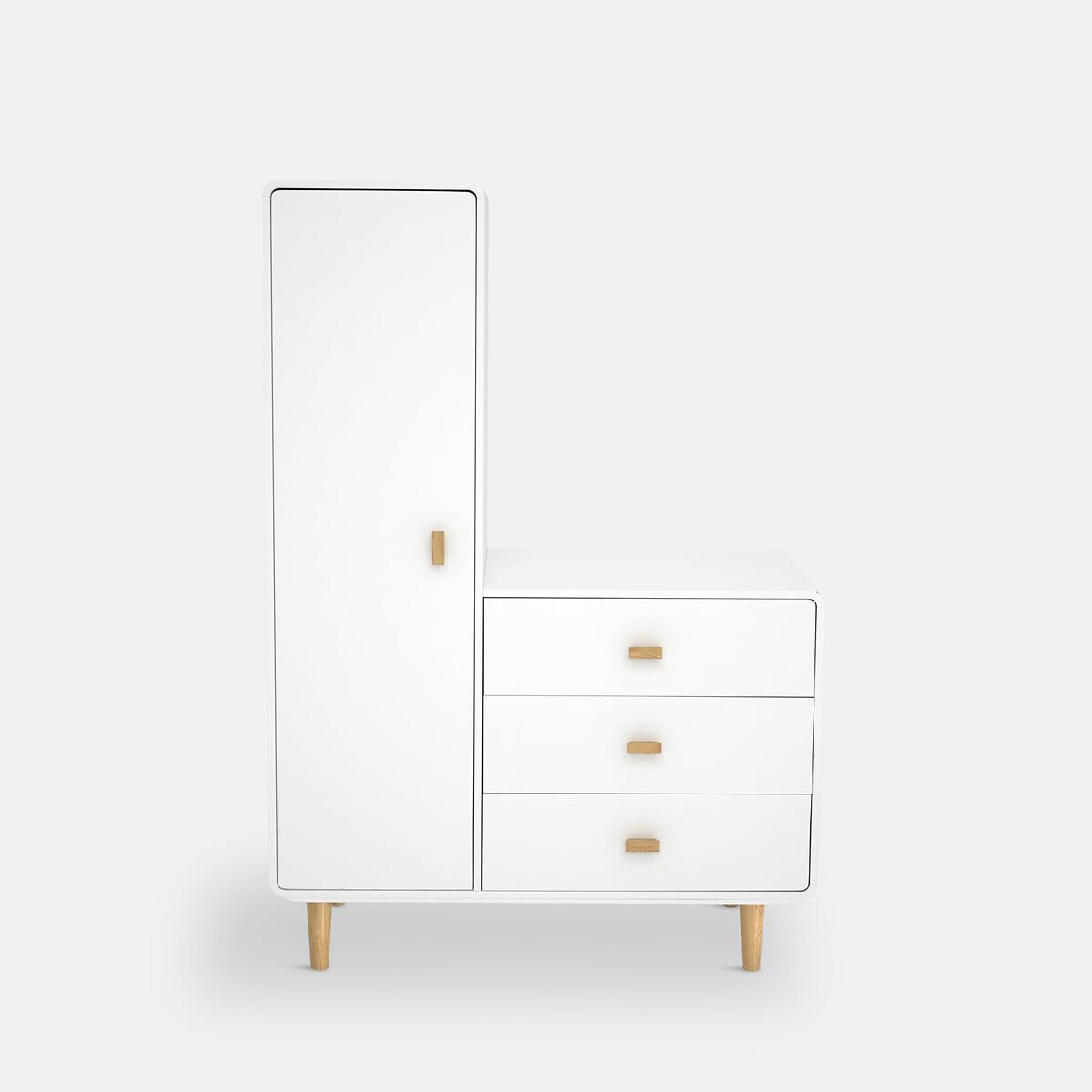 Jimi storage unit for children with 1 door and 3 drawers. A stylish storage unit with hanging space and drawers. This highly practical little wardrobe has lots of room for storage but takes up very little space. Product Details • 1 clothes rail, 1 door • 1 chest with 3 drawers • Tapered legs • MDF with nitrocellulose lacquered finish • Solid birch legs and handles. Dimensions • Width: 100cm • Height: 153cm • Depth: 45cm • Drawer dimensions:L53.5 x H9 x D33.5cmDelivery:. Assembly required. Available for home delivery. Note! Please check that all access points are large enough to accommodate your delivery (doors, stairs, lifts). • WOOD FROM SUSTAINABLY MANAGED FORESTS. FSC® certified wood comes from forests that are environmentally, socially and economically well managed. Parcel Dimensions:2 parcelsL14. 9 x H11.7 x D50 cm - 31.55 kgL11. 4 x H12.7 x D56 cm - 23.5 kg
