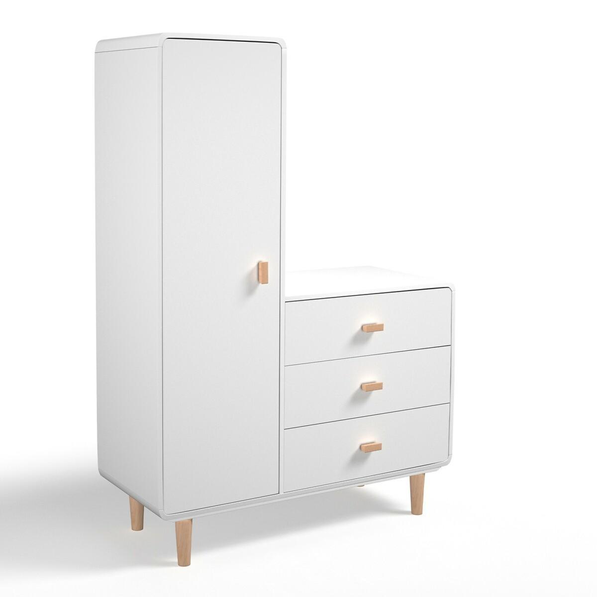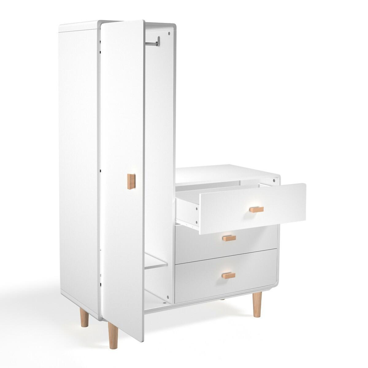 I really like this little wardrobe and drawers combo for kids' rooms because of its clean, minimalist design and functional versatility. It works well in both contemporary and Scandi-inspired interiors, adding a touch of understated style without overwhelming the space. Practical styling tips include pairing it with soft, muted bedding and playful accessories to keep the room looking fresh and inviting. It’s a great piece for creating designated storage zones, helping to keep clutter at bay while maintaining a neat, organised look. The natural wood accents on the handles and legs also add warmth, making it a versatile option for various colour schemes and interiors.