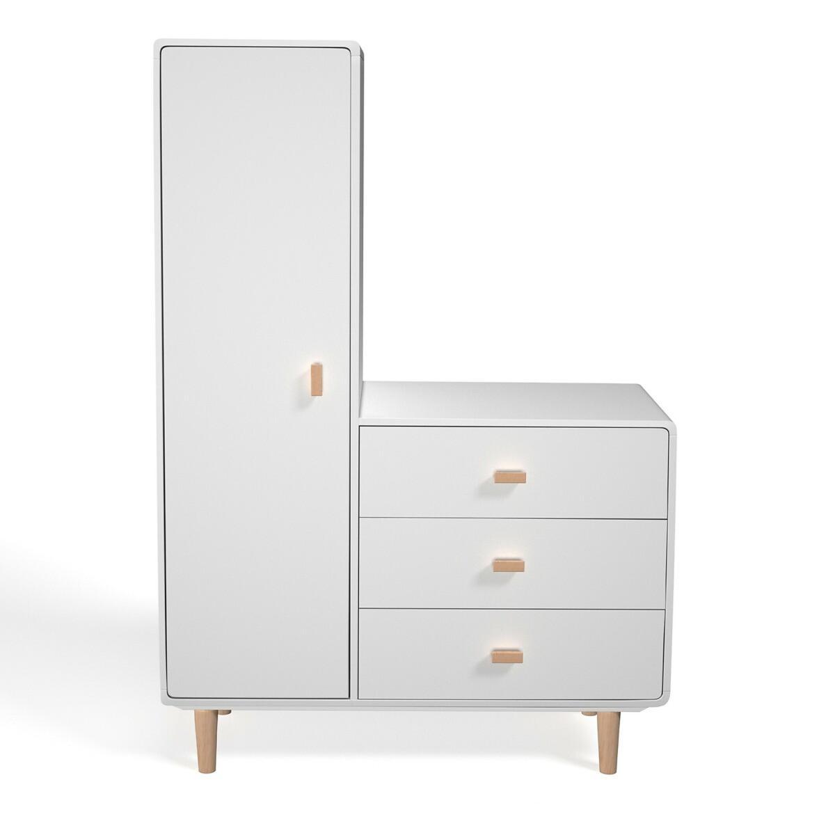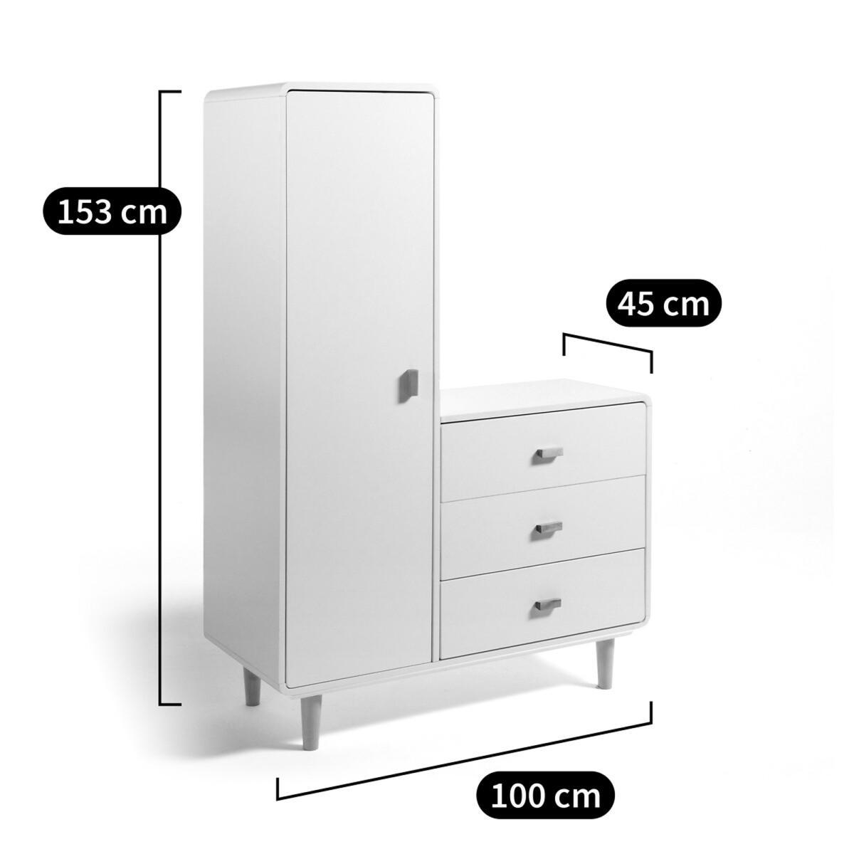 Jimi storage unit for children with 1 door and 3 drawers. A stylish storage unit with hanging space and drawers. This highly practical little wardrobe has lots of room for storage but takes up very little space.