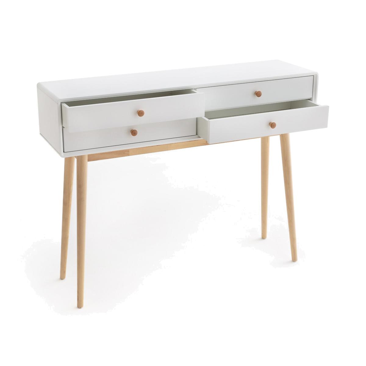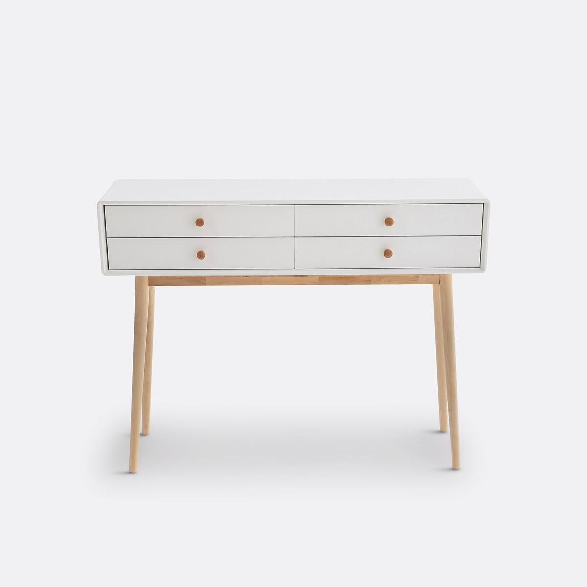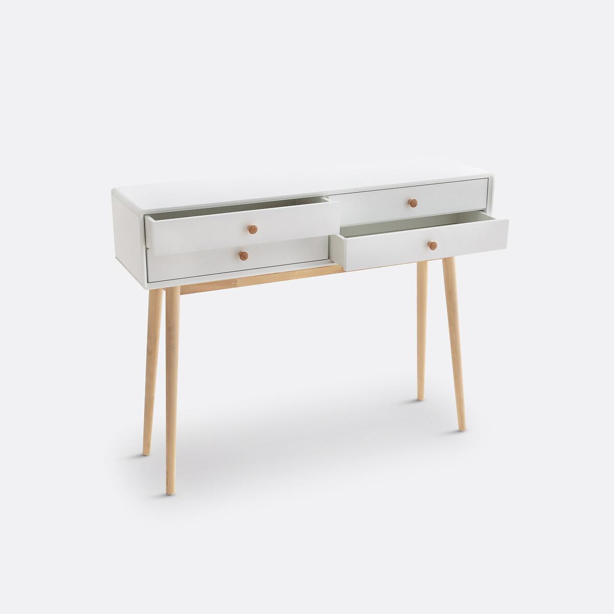 The Jimi console table with 4 drawers. Neo retro styling steps forward into the spotlight. Product Details • Unit assembled in MDF with white paint, nitrocellulose varnish finish. • 4 drawers, pine knob handles. • Tapered legs in solid birch, nitrocellulose varnish finish. • Plastic feet pads. Supplied with a kit for wall mounting. • Multiple drawers. • Only requires a little assembly (attaching legs).Dimensions • Length: 110cm • Height: 85cm • Depth: 30cm. Interior: • Drawers : L49.5 x H6.5 x D23.8cmDelivery:. Requires some assembly. Available for home delivery. Parcel dimensions and weight:1 parcel • 120 x 31 x 40cm • 28.5kg