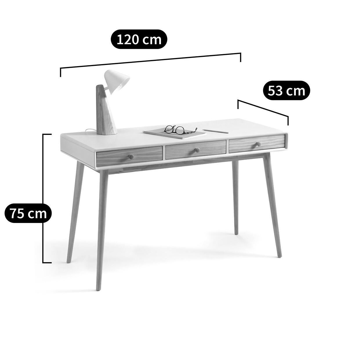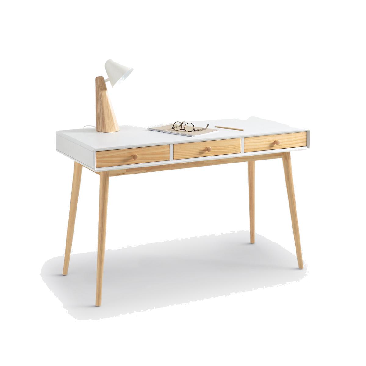 The Jimi 3-drawer desk. Sober and contemporary lines for this elegant Scandinavian-style Jimi desk that perfectly combines white and wood. Product Details • 3 drawers. • Tapered legs. • Wooden button handles. • Pre-assembled body. • Nitrocellulose finish lacquered MDF cabinet. • Base, knob handles and drawer fronts in solid pine, Nitrocellulose finish. • Melamine backingDimensions. Overall Width: 120cm. Height: 75cm. Depth: 53cm.Dimensions. Drawer 1 interior size : L34.9 x H6 x D37.3 cm. • WOOD FROM SUSTAINABLY MANAGED FORESTS. FSC® certified wood comes from forests that are environmentally, socially and economically well managed. Parcel Dimensions:1 parcelL13. 0 x H20 x D63cm.29kg. Home Delivery:Requires self-assembly. It will be delivered to your door!Note! Please check that all access points are large enough to accommodate your delivery (doors, stairs, lifts).