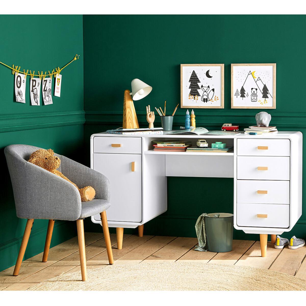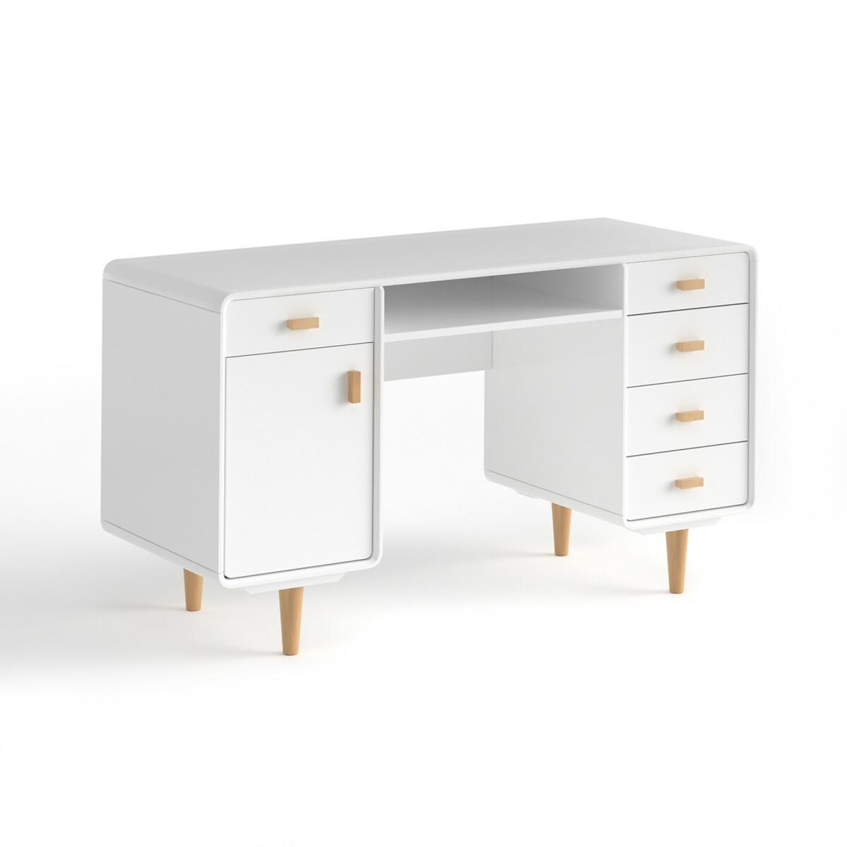 The Jimi double pedestal desk follows the Scandinavian trend with its mix of light wood and white. Cabinet on one side, drawers on the other.. It has a slight vintage look: with its tapered birch legs.