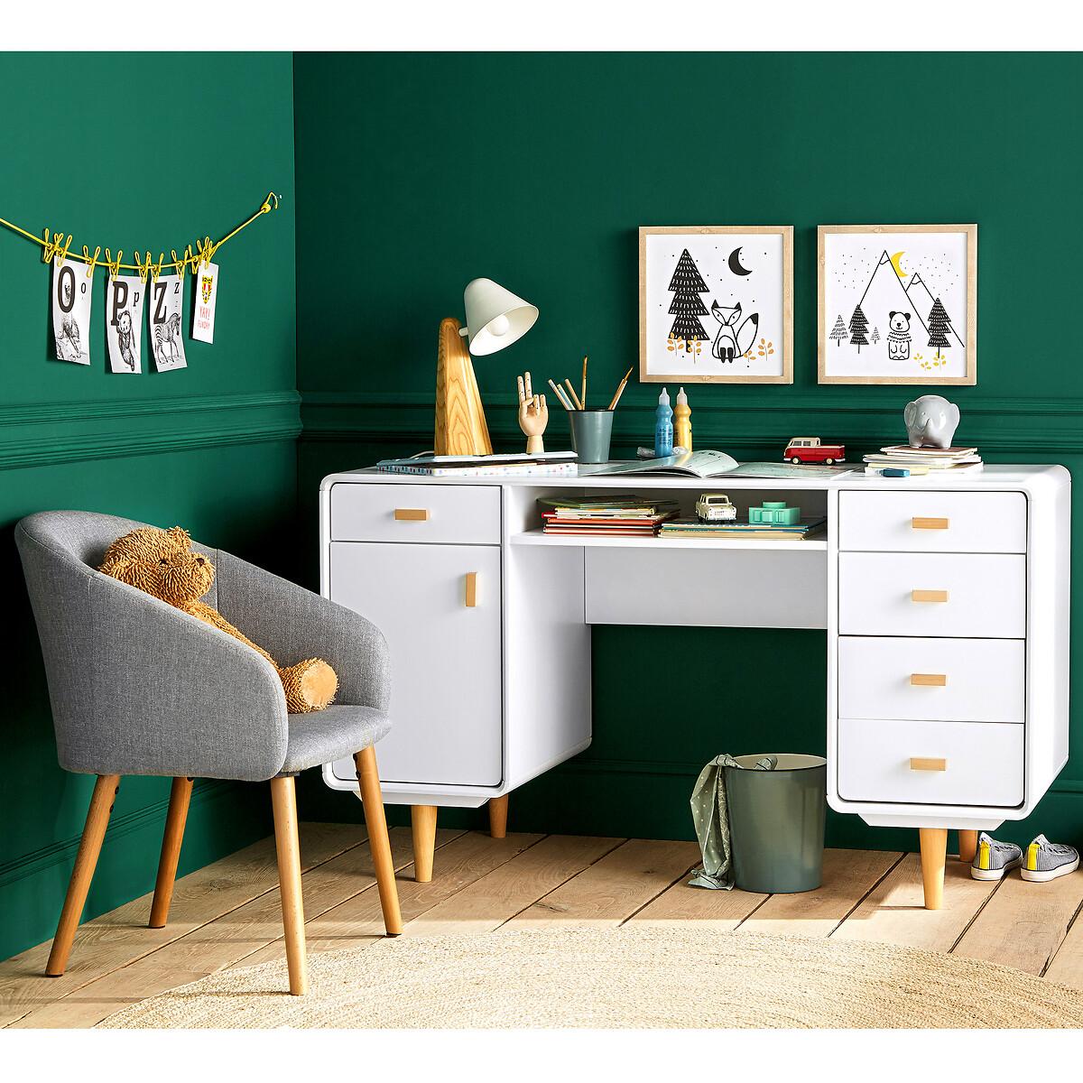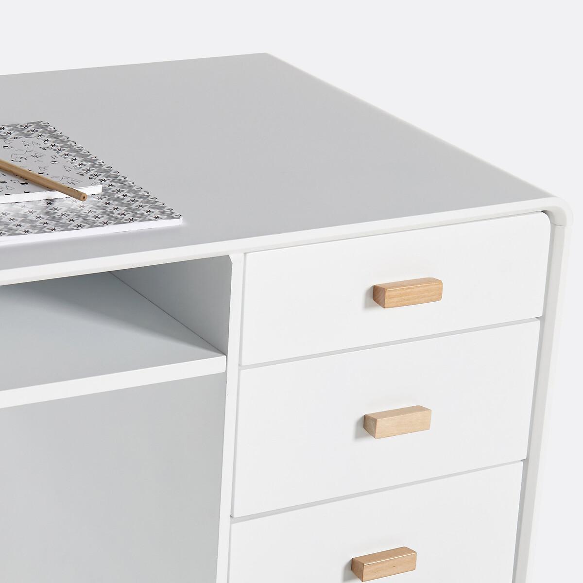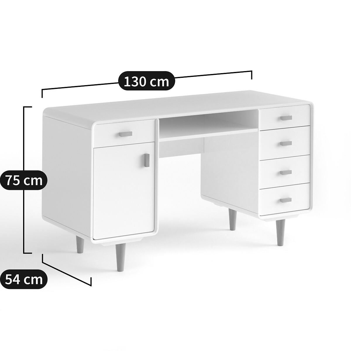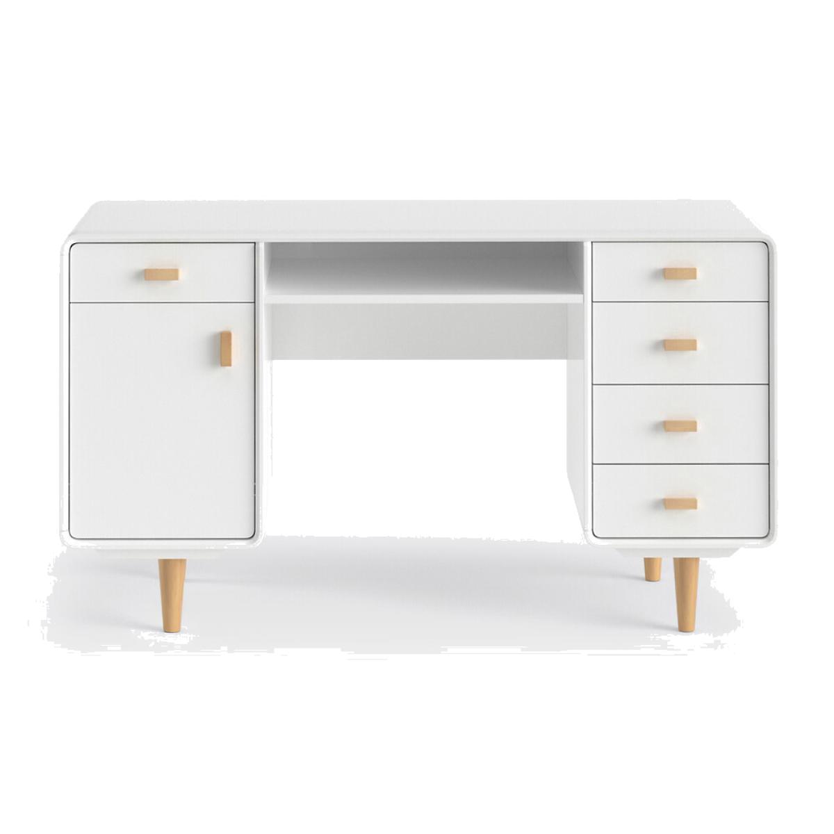 The Jimi double pedestal desk follows the Scandinavian trend with its mix of light wood and white. Cabinet on one side, drawers on the other.. It has a slight vintage look: with its tapered birch legs. Product Details • Double storage • 1 block with 1 drawer and 1 cupboard • 1 block with 4 drawers, plus a niche under the desktop • Tapered legs • MDF with nitrocellulose lacquered finish • Solid birch legs and handlesDimensions. Overall • Width: 130cm • Height: 75cm • Depth: 54cm • 1 Block L36 x H57 x D54 cm • Niche L58 x H9 x D49.4 cm. Usable dimensions: • Drawer: L.33.5 x H6 x D49 cm • Compartment: L58 x H9 x D48 cmDelivery:. This product requires assembly. Available for home delivery. Note! Please check that access points (doorways, stairways, lifts) are wide enough to accommodate your delivery. • WOOD FROM SUSTAINABLY MANAGED FORESTS. FSC® certified wood comes from forests that are environmentally, socially and economically well managed. Dimensions and weight of parcel: • 144 x 60.5 x 10.5 cm - 30.5 kg • 71.5 x 43 x 18.7 cm - 20.25 kg