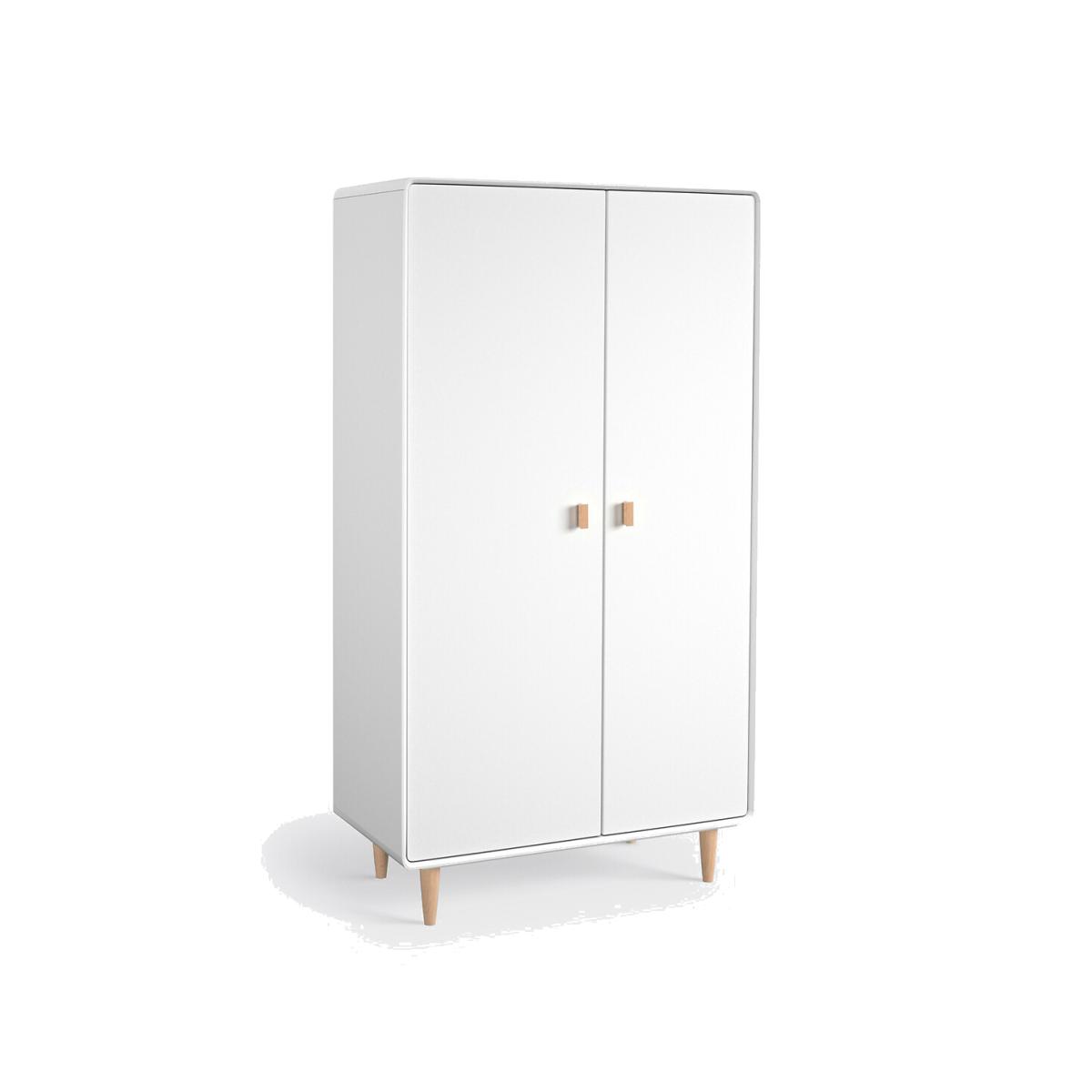 This Jimi 2-door wardrobe embraces the Scandinavian trend with its mix of white and light wood. It has a slight vintage look: with its tapered birch legs. Product Details • 1 side with hanging space and 1 shelf • 1 side with 5 shelves • Tapered legs • MDF with nitrocellulose lacquered finish • Solid birch legs and handlesDimensions. Overall • Width: 100cm • Height: 190cm • Depth: 52cmDelivery:. This product requires assembly. Available for home delivery. Note! Please check that access points (doorways, stairways, lifts) are wide enough to accommodate your delivery. • WOOD FROM SUSTAINABLY MANAGED FORESTS. FSC® certified wood comes from forests that are environmentally, socially and economically well managed. Dimensions and weight of parcel:3 parcels • L116 x H14.5 x D58.2 cm - 32.5 kg • L183 x H87 x D57.8 cm - 31.4 kg • L183 x H82 x D58.2 cm - 24.1 kg