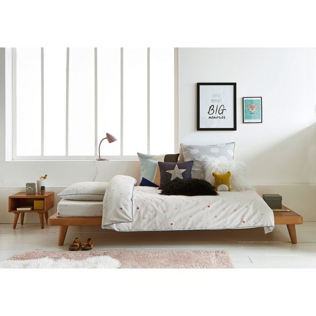 The light wood and tapered legs typical of the 1950s give the Jimi bed a vintage feel. The overhanging shelf can be positioned at the top of the bed as a bedside table or at the bottom to hold throws, pillows and blankets. Features. Tapered feet. Integrated solid pine slatted base. Product Details. Materials: Oak-stained solid pine with nitrocellulose varnish finish. Product range: Jimi. Brand: La Redoute Interieurs. Assembly information: Delivered for self assembly. Dimensions. Overall dimensions: L227 x D104 x H26 cm. Parcel size and weight. 2 parcels. L135.6 x H11.3 x D40.4cm, 38kg. L234.8 x H6.6 x D17.3cm, 17.33kg