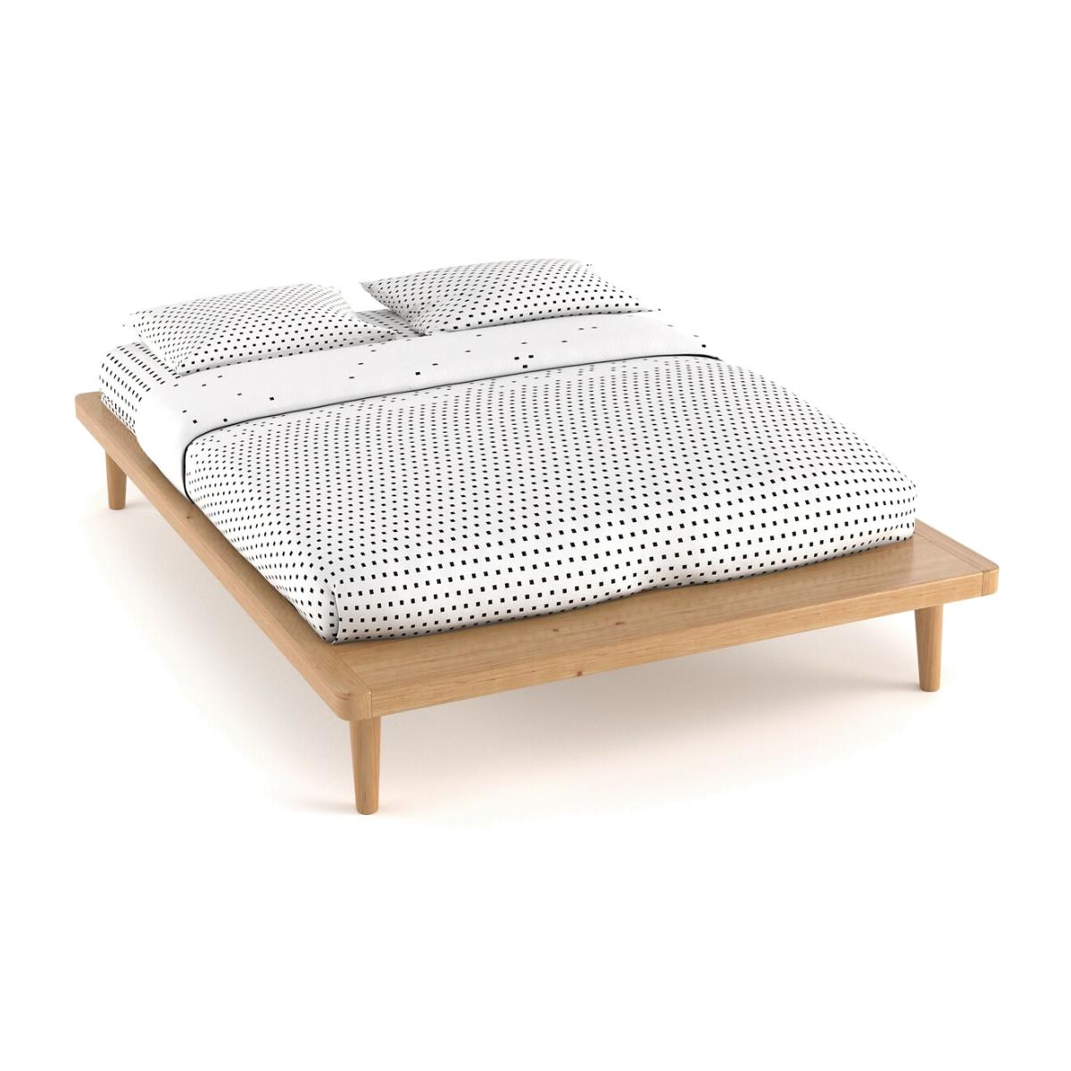 Jimi solid pine platform bed and base. Vintage style with its light wood and tapered legs typical of the 50s,The platform can be positioned at the top of the bed as a bedside table for a lamp, book or alarm clock, or at the bottom to hold throws, pillows and blankets. Product Details • Size 140 x 190cm (double) or 160 x 200cm (king) • Tapered legs • Slatted bed base in integrated solid pine • Oak-stained solid pine with nitrocellulose varnish finishDimensions. Double Size: • Width: 154cm • Height: 35cm • Length: 227cm. King Size: • Width: 174cm • Height: 35cm • Length: 237cmDelivery:. This product requires assembly. Available for home delivery. Note! Please check that all access points are large enough to accommodate your delivery (doors, stairs, lifts). • WOOD FROM SUSTAINABLY MANAGED FORESTS. FSC® certified wood comes from forests that are environmentally, socially and economically well managed.