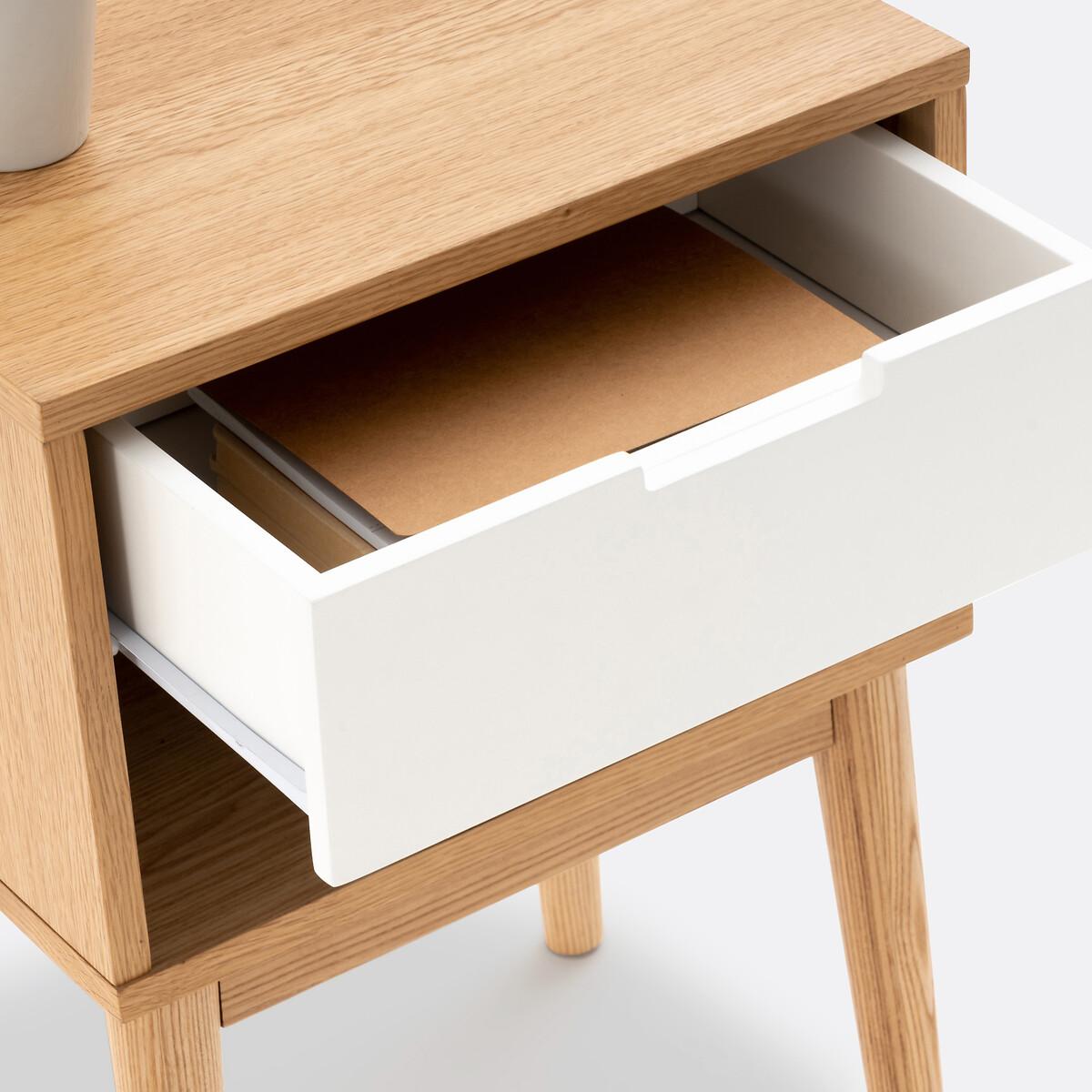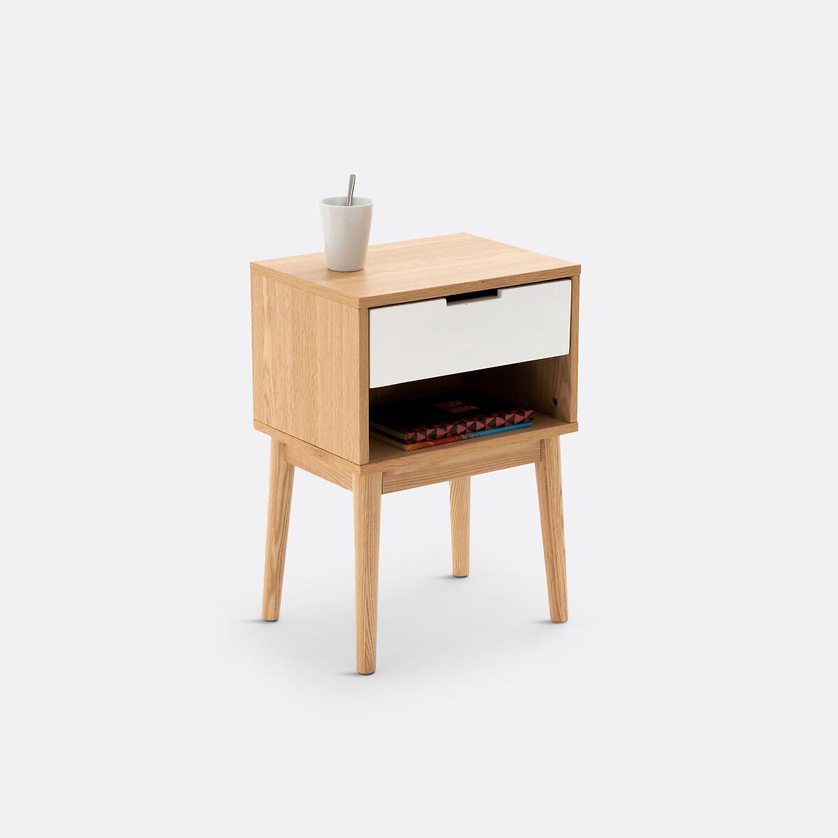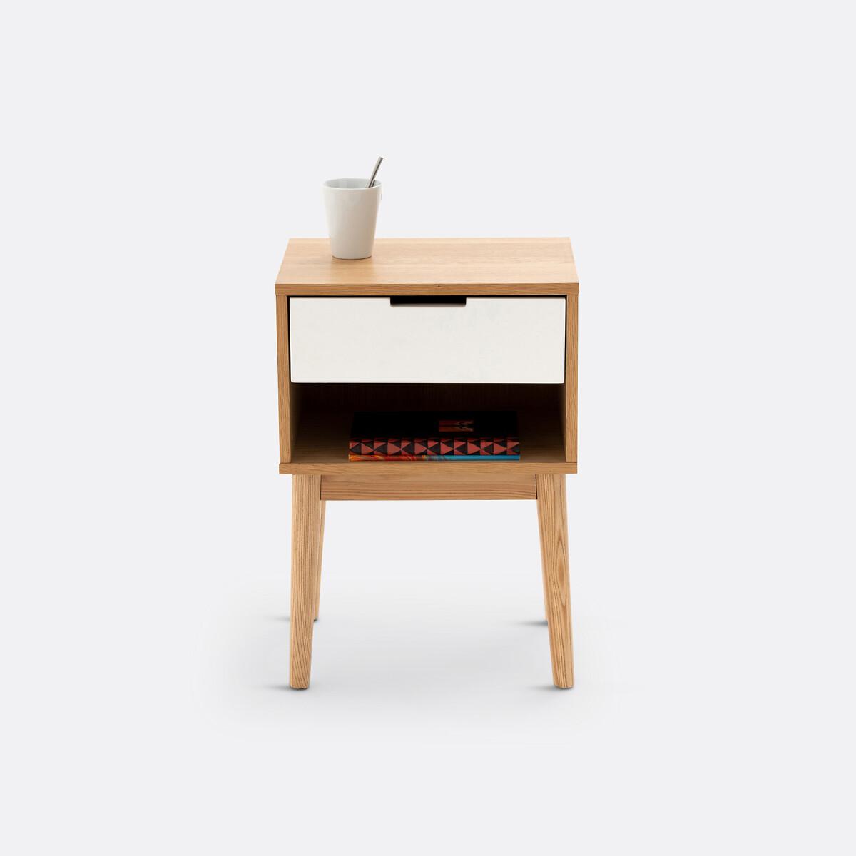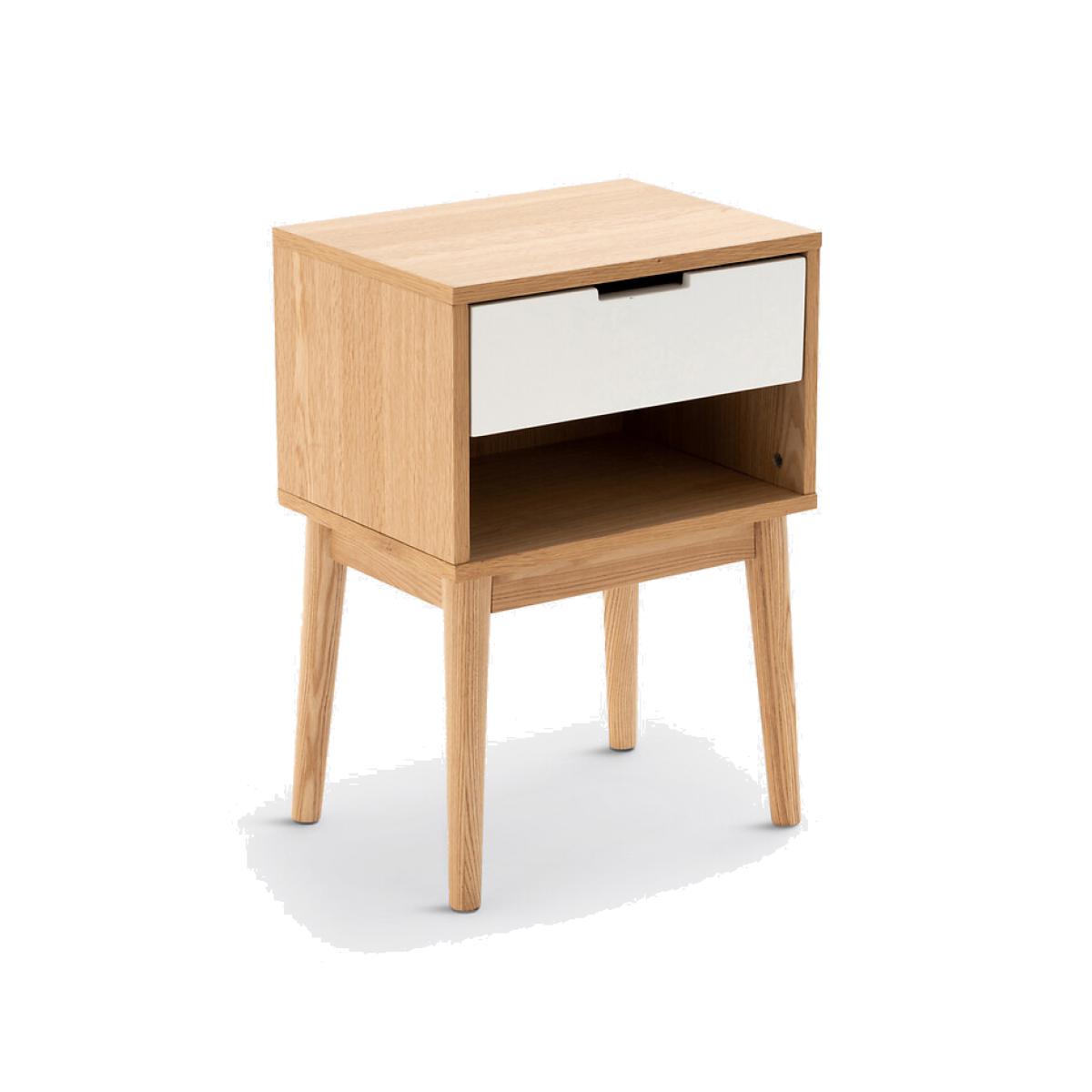 Jimi bedside cabinet with one drawer and one compartment. This bedside cabinet will bring a stylish look into your bedroom with its vintage look, combining light wood and white wood and its 1950's style tapered legs. Product Details • MDF with oak veneer and nitrocellulose lacquered finish • Solid ash legs • 1 drawer • 1 compartment • Tapered legs. The drawer and open compartment are suitable for storing books. Dimensions Overall • Width: 40cm • Height: 57cm • Depth: 30cm • Height of legs: 31cm. Usable space • Drawer:L31.7 x H7.4 x D22.5 cm • Compartment: L36.7 x H11.1 x D28.3 cm • Assembly required. • WOOD FROM SUSTAINABLY MANAGED FORESTS. FSC® certified wood comes from forests that are environmentally, socially and economically well managed. Dimensions and weight of parcel1 parcel • L50 x H21 x D40 cm. 10.1kg