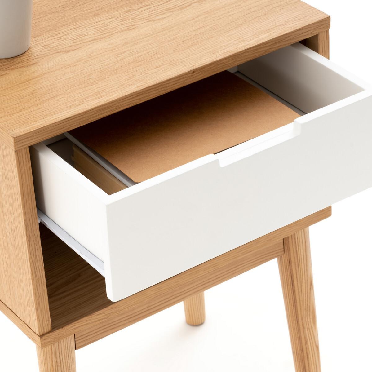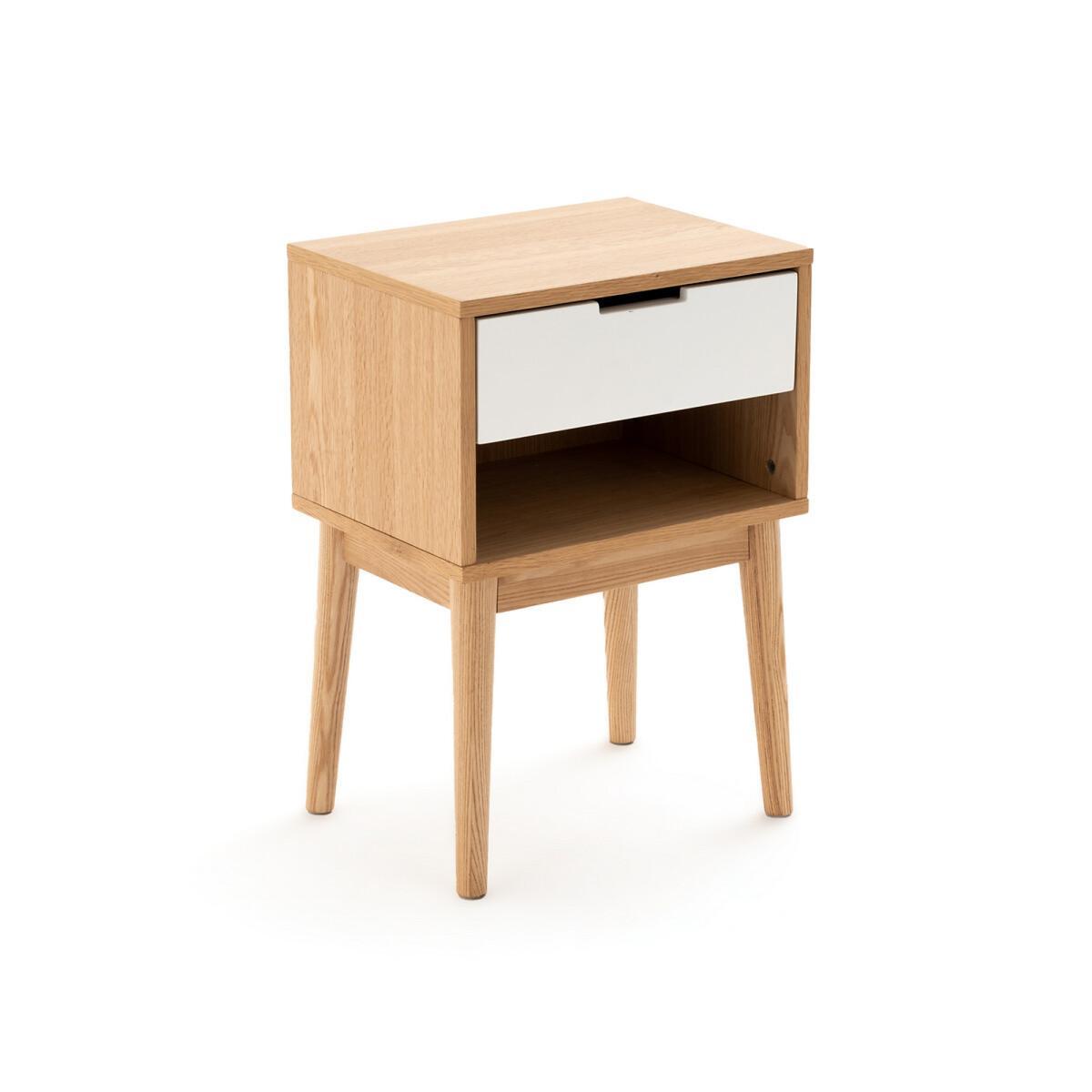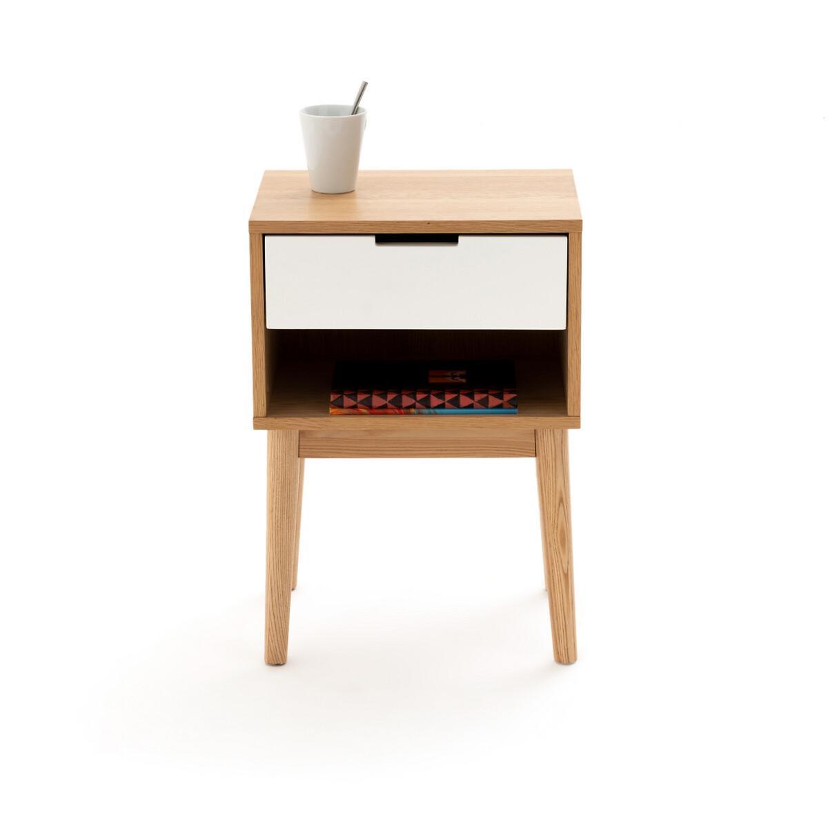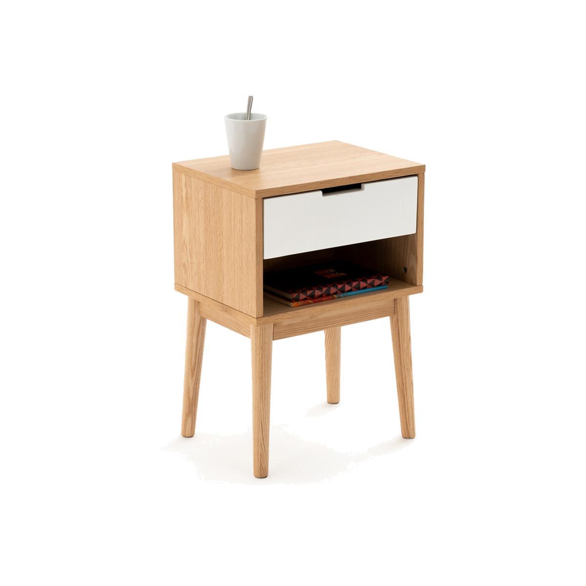 Jimi bedside cabinet with one drawer and one compartment. This bedside cabinet will bring a stylish look into your bedroom with its vintage look, combining light wood and white wood and its 1950's style tapered legs.