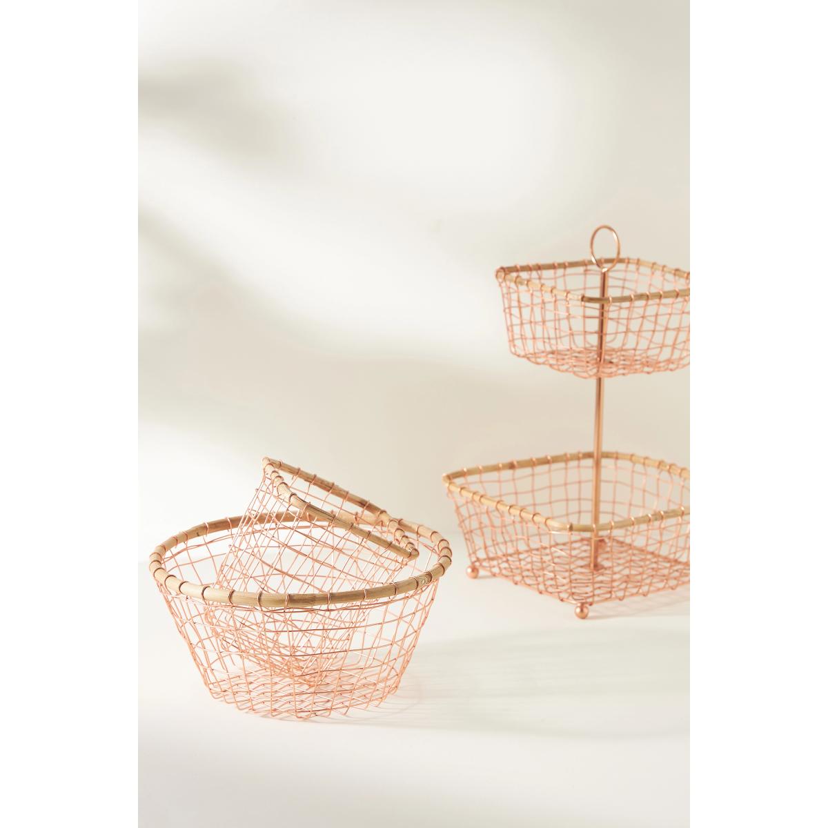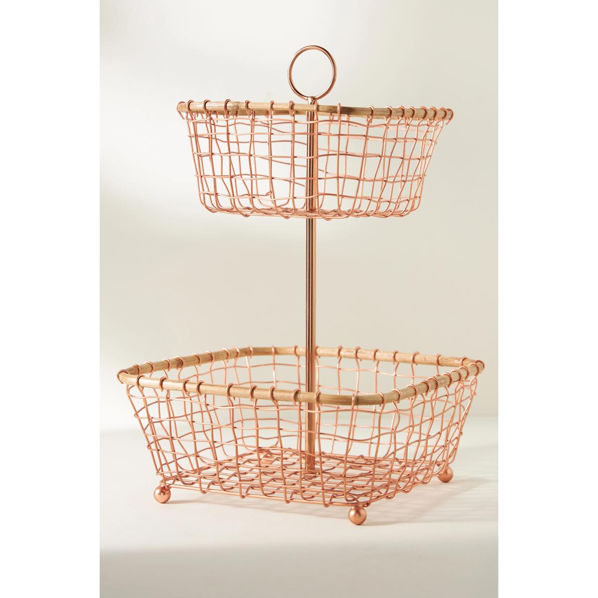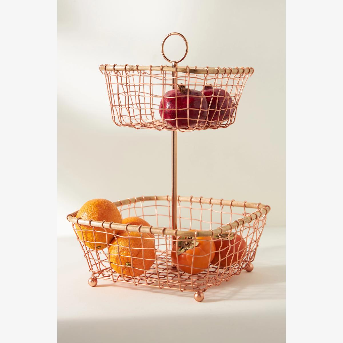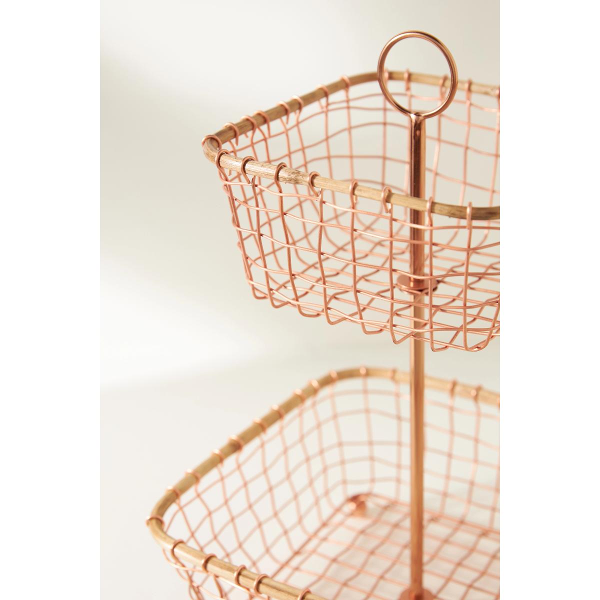 Store your farmer's market haul in this wire two-tier fruit basket. Whether placed on the table or displayed on the countertop, this piece combines both function and design. * Copper wire, cane * Due to the nature of this item, expect slight variation in the appearance of each unique piece * Wipe clean with damp cloth * Imported