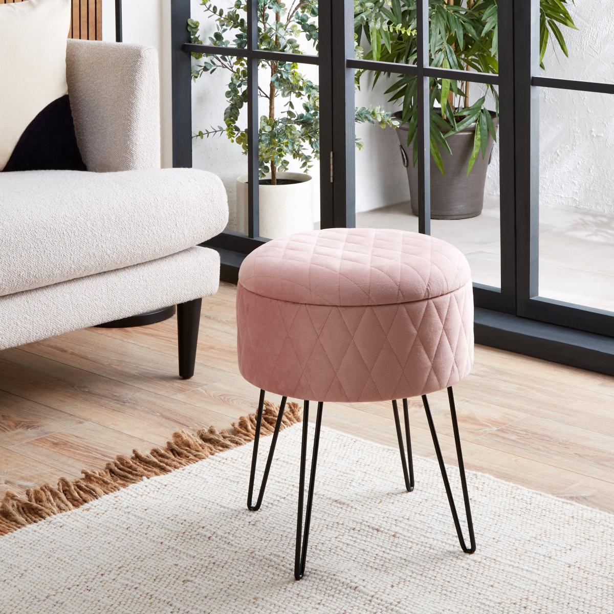 If you want to make a statement with your furniture, the Velvet Quilted Footstool is for you. The round frame structure and black metal hairpin legs are a modern take on classic home accents, while the soft touch velvet upholstery adds an unexpected luxurious twist to this footstool. Flip the lid to use as a table for drinks, snacks and much more!.