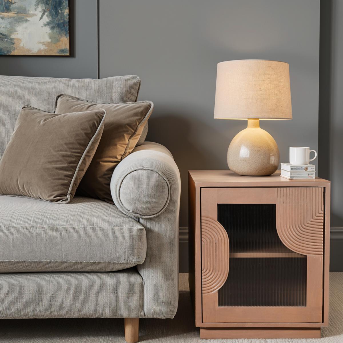 This SIDE TABLE is a statement piece that effortlessly blends modern aesthetics with rustic charm. Its fluted design and eye-catching geometric pattern make it a conversation starter, while its pale taupe finish adds a touch of warmth to any space. Crafted from durable mango wood, this piece offers ample storage with one shelf behind a glass door and is sure to elevate your decor.