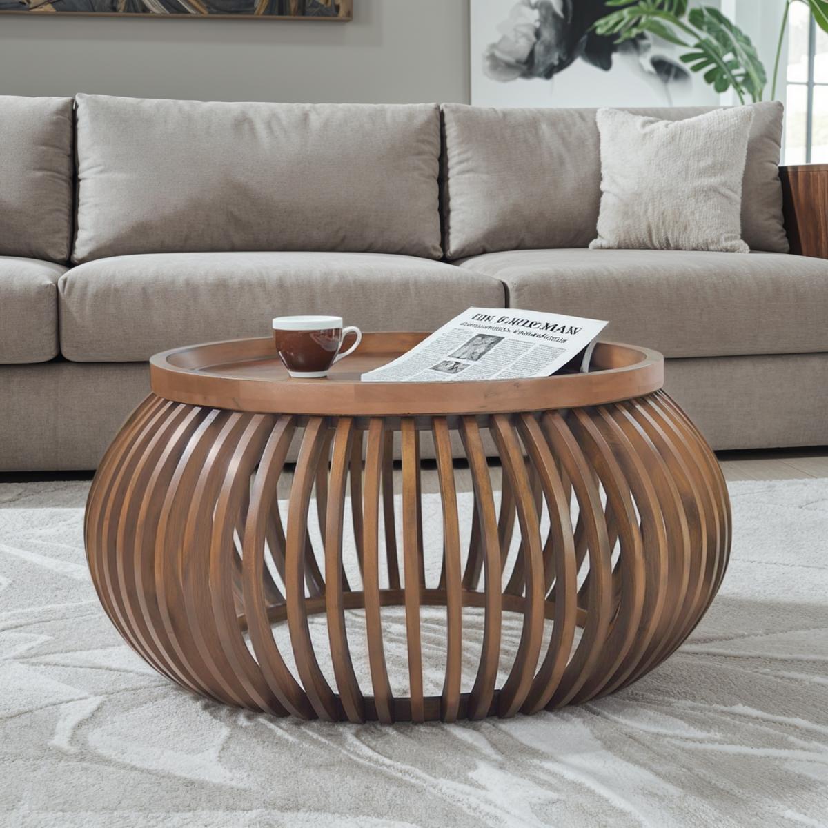 This small round coffee table is perfect for creating a cozy and inviting atmosphere in your living room. Its compact size and slatted design make it a versatile addition to any decor style, while its smooth finish is easy to clean.