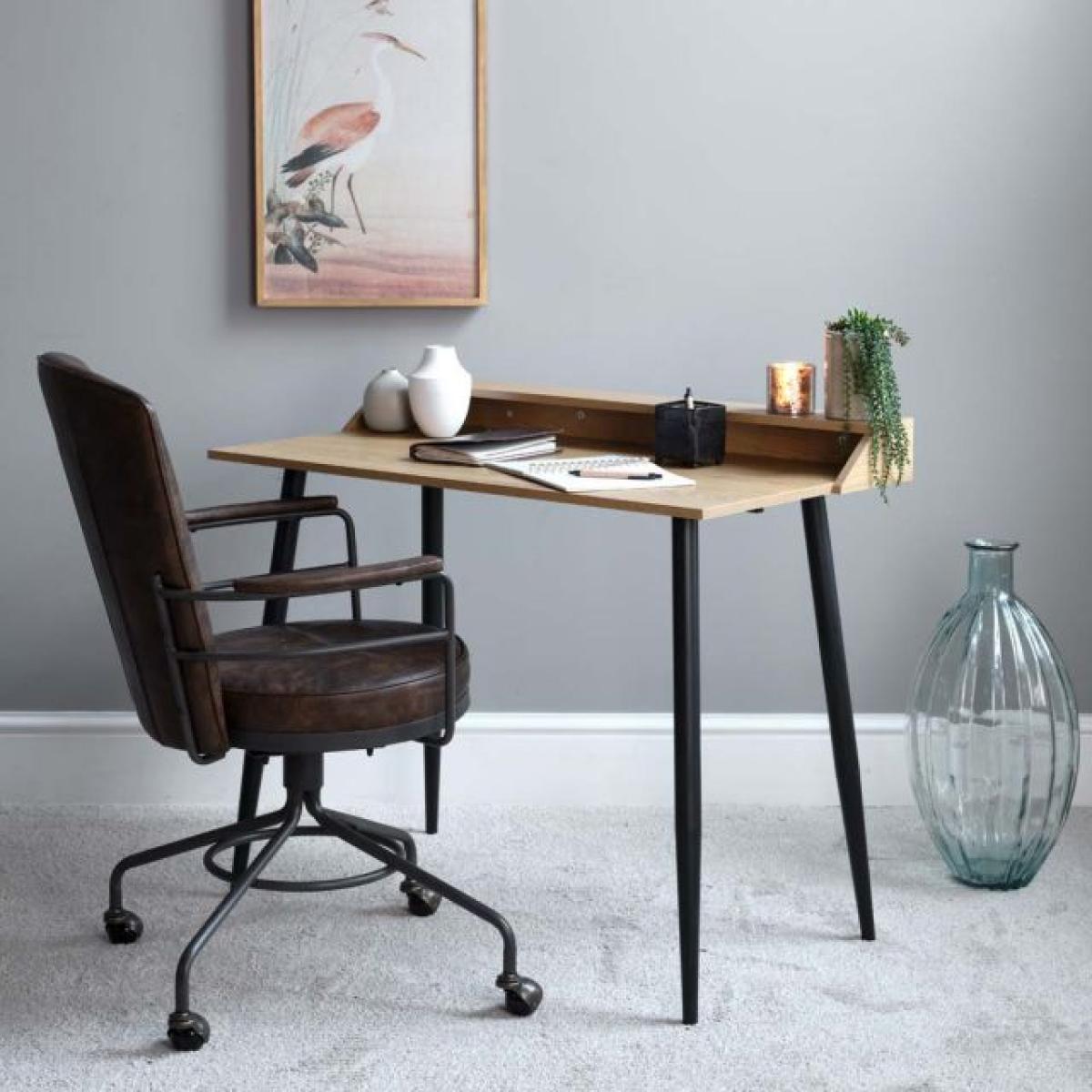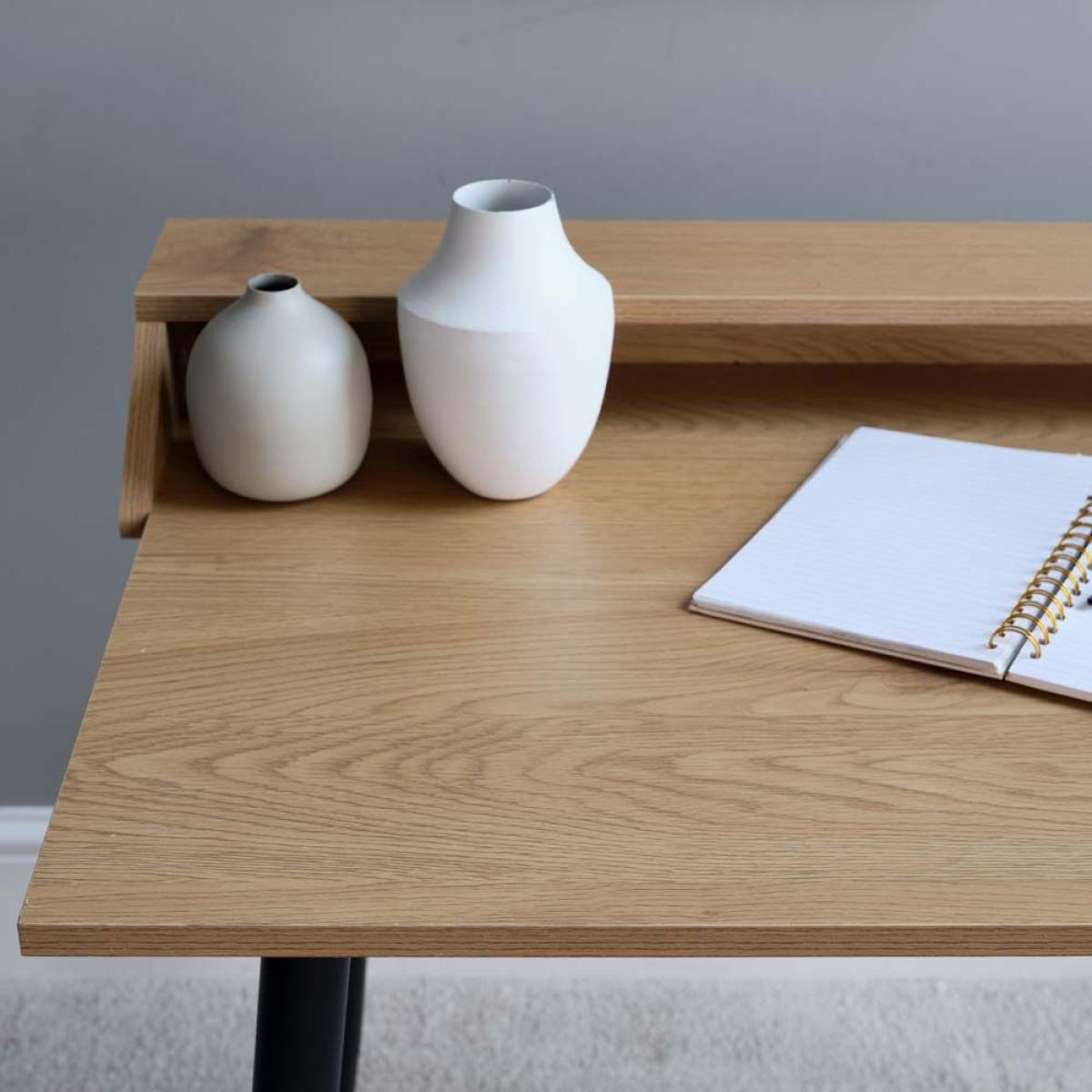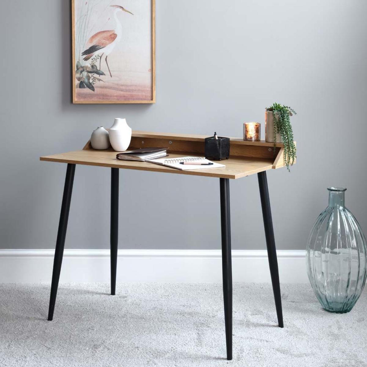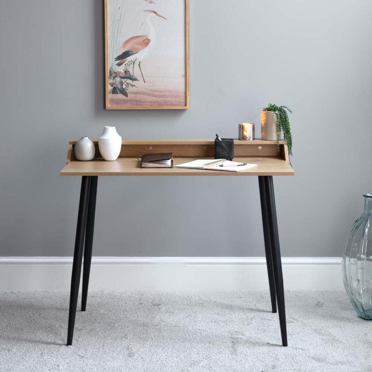 Simplicity and stylishness make our Joe desk the perfect option for your home office. Useful top shelf, modern lines and gently tapering legs give this desk a trendy feel, with a wild oak finish and matt black powder coated legs this desk will suit any contemporary home style.