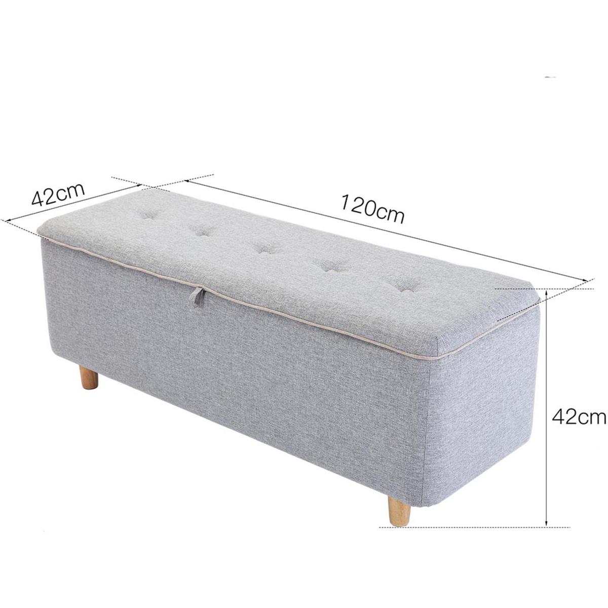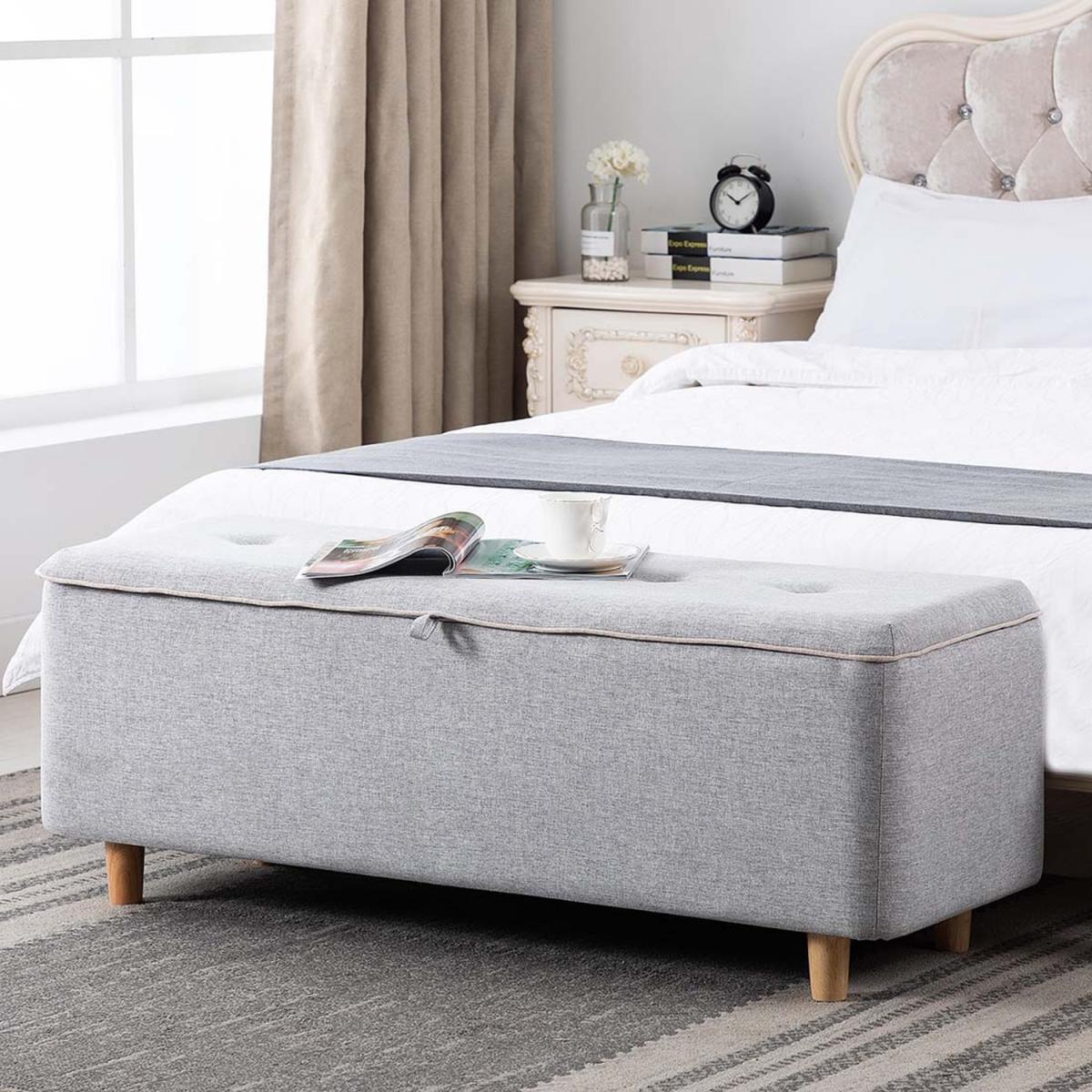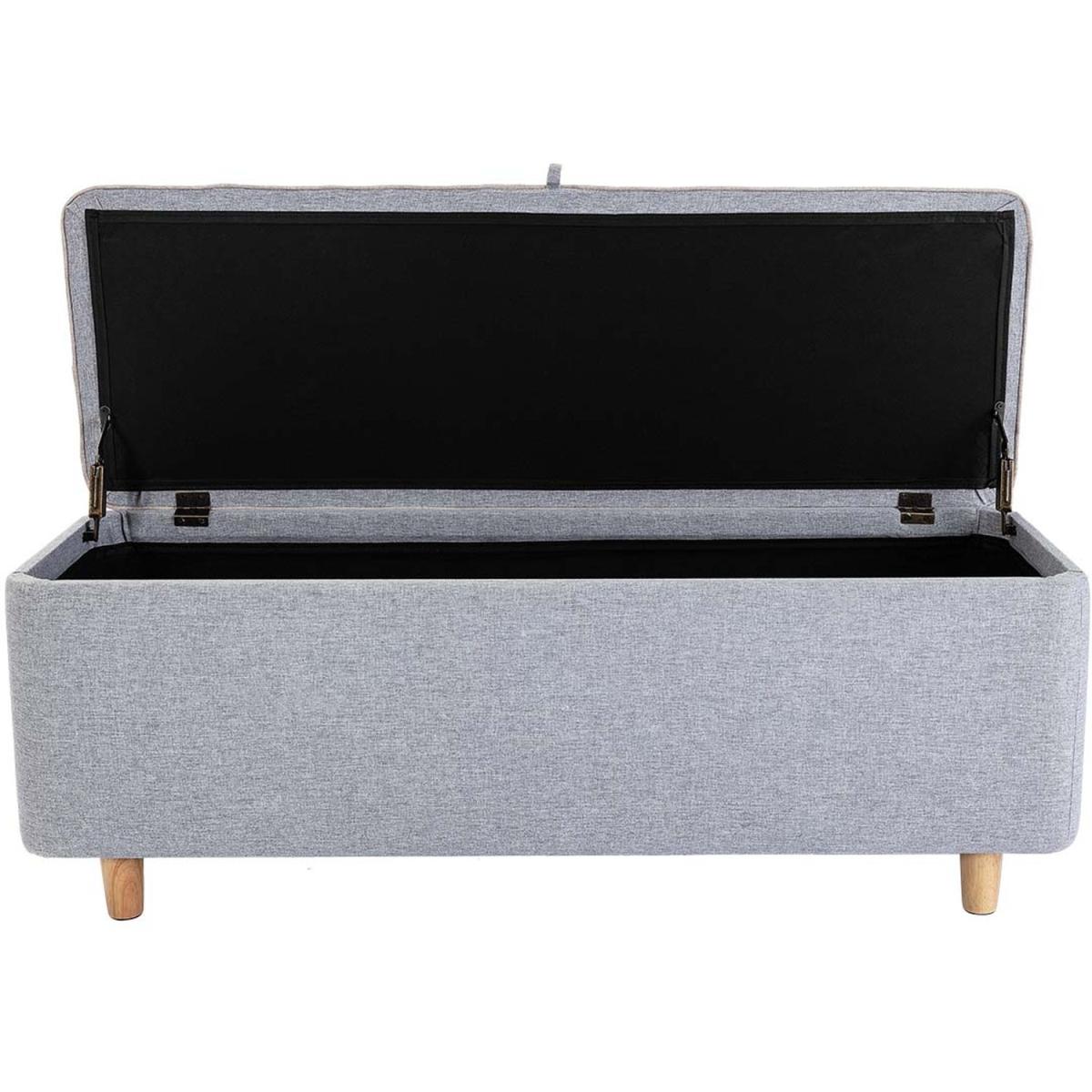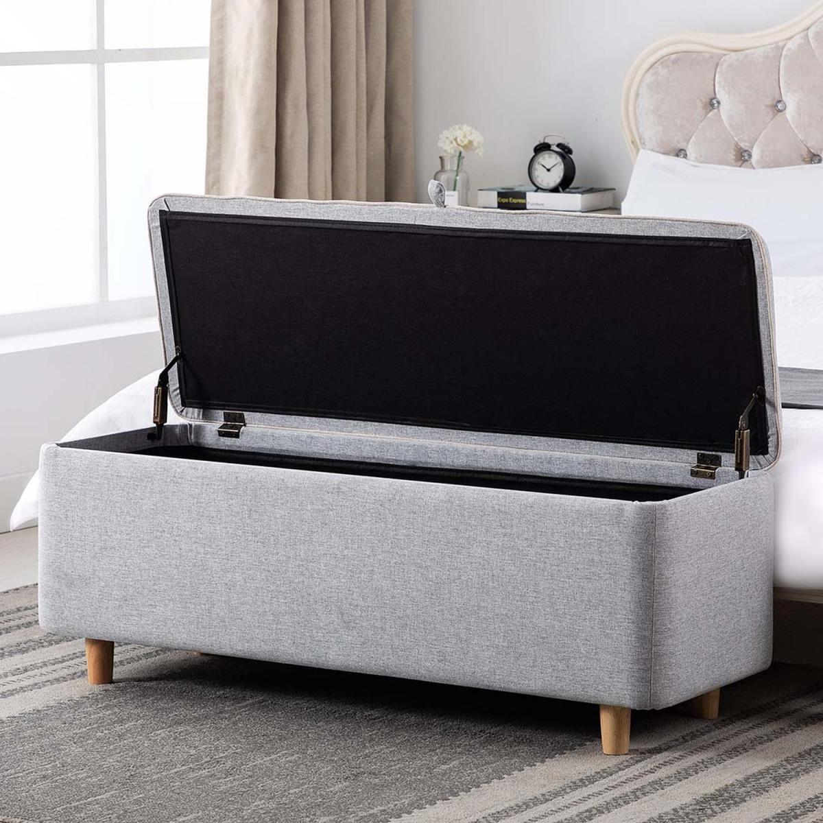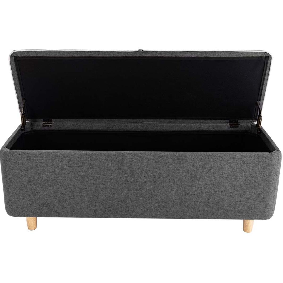 The contemporary Joel storage ottoman has a stylish linen cover and button detailing. With echoes of Scandinavian design, this end-of-bed bench has a padded seat and four sturdy rubberwood legs. The generous storage capacity makes this blanket box ideal for storing larger bed linen, pillows and duvets. A useful addition to any home, this modern storage ottoman is available in Grey, Blue and Charcoal, and will blend in with various interior styles.
