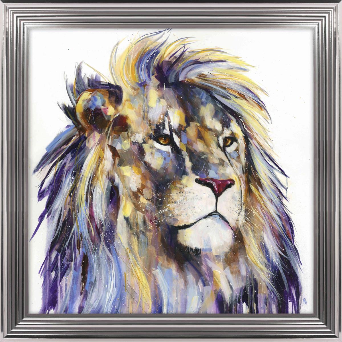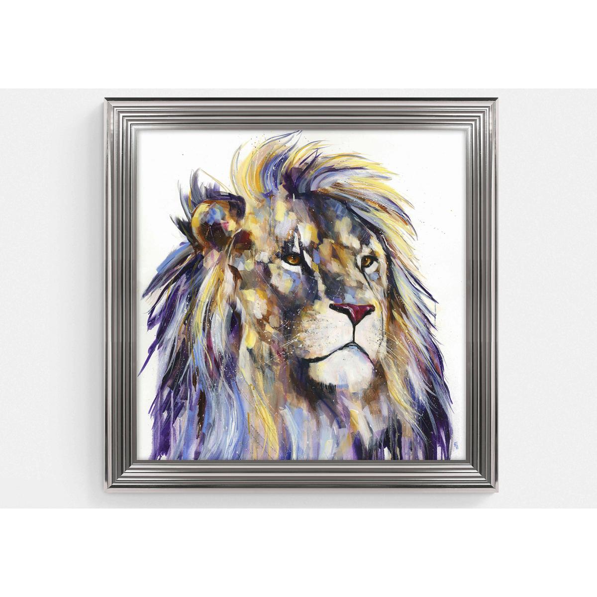 The expressive modern style of this framed picture gives the lion depicted a quiet majesty. Reproduced from original artwork by Louise Luton. Why you'll love it This large framed picture perfectly captures the lion’s expressive power. Vibrant modern style in bright pastels. Reproduced from original artwork by Louise Luton. Hand-finished with acrylic paints for a dynamic textured look. Contemporary ribbed metallic frame. A Furniture Village online exclusive. Made in the UK. This framed picture is part of the Furniture Village home accessories collection. What you need to know Supplied with a metal hanging fitting and nylon cord. Indoor use only. Dimensions Height: 95 cm (38 in). Depth: 3.5 cm (2 in). Width: 95 cm (38 in).