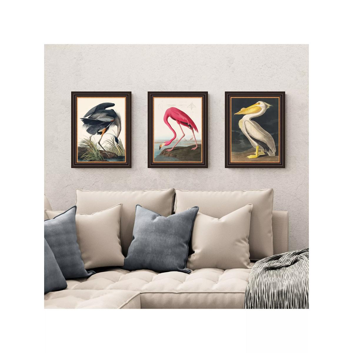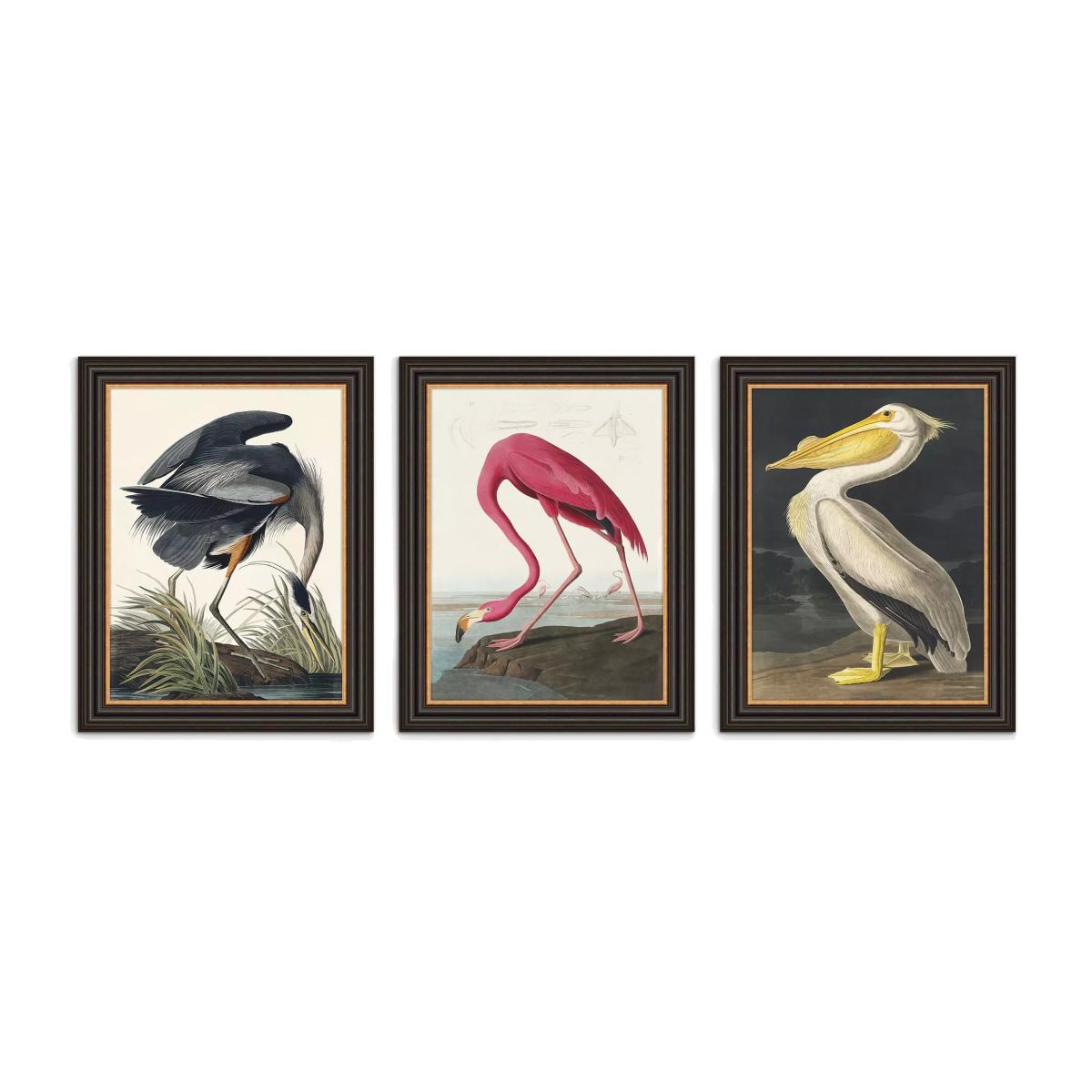 Trio of reproduction prints of vintage illustrations by renowned American ornithologist and painter John James Audubon. The set includes a Great Blue Heron, an American Flamingo and an American White Pelican, all in traditional-style black and antique gold frames, unglazed and finished with a hand-applied artist's texture gel. They arrive ready to hang on your wall. John James Audubon (1785-1851) was a self-trained American artist, naturalist and ornithologist. His combined interests in art and ornithology turned into a plan to make a complete pictorial record of all the bird species of North America. Have you thought about wall hooks and fittings?