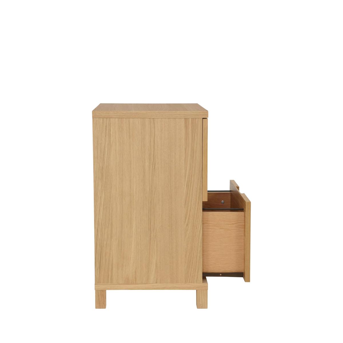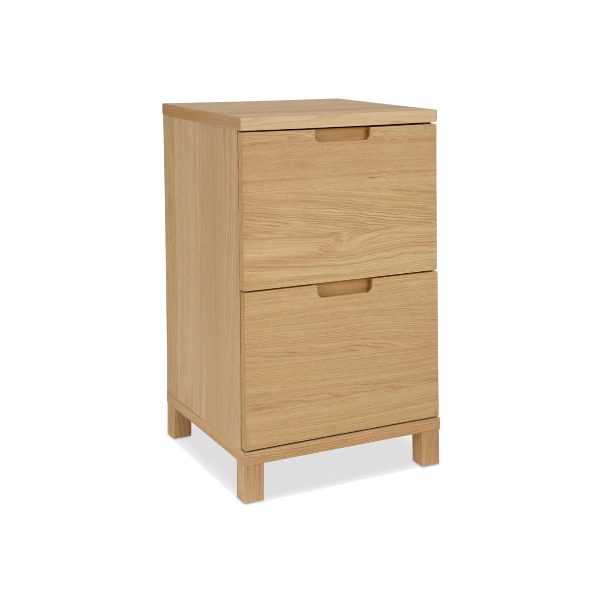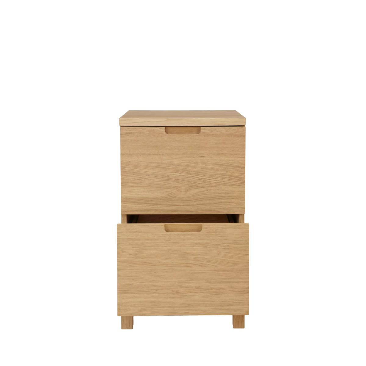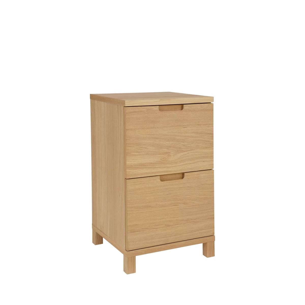 This FSC oak veneered chipboard filing cabinet fits neatly into your home office to provide stylish and practical storage. It includes two deep drawers, providing ample room to store unwanted clutter and runners in each drawer for A4 hanging files. Please note that A4 suspension hanging files must be no more than 330mm wide for use with this cabinet. Want to see it first? You may want to see and get a feel for the furniture in one of our shops before ordering. We'll be able to tell you where the range you'd like to view is on display.