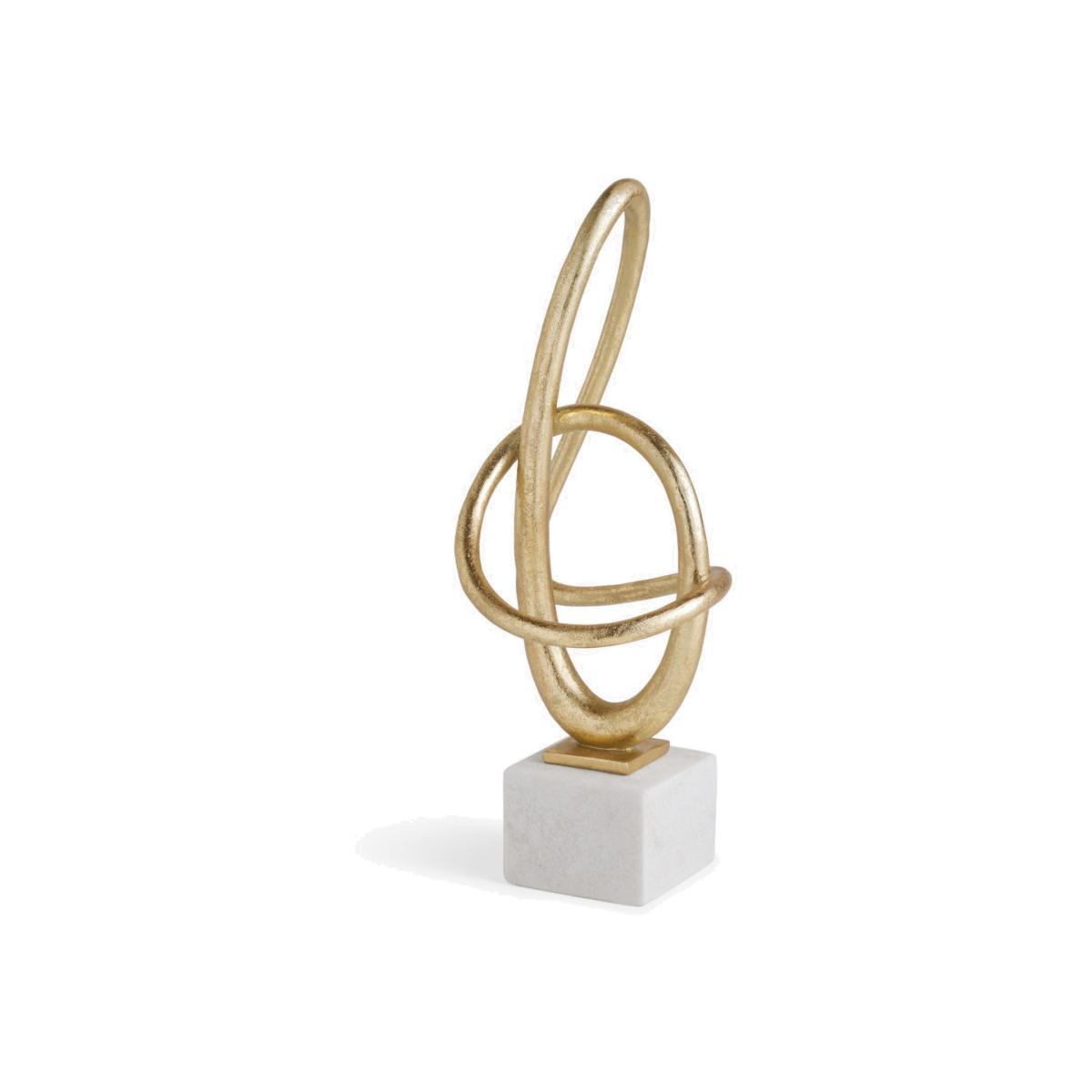 This abstract sculpture has a brass finish and is set on a marble base. Place among books, on a shelf or table to add a decorative touch to a room.
