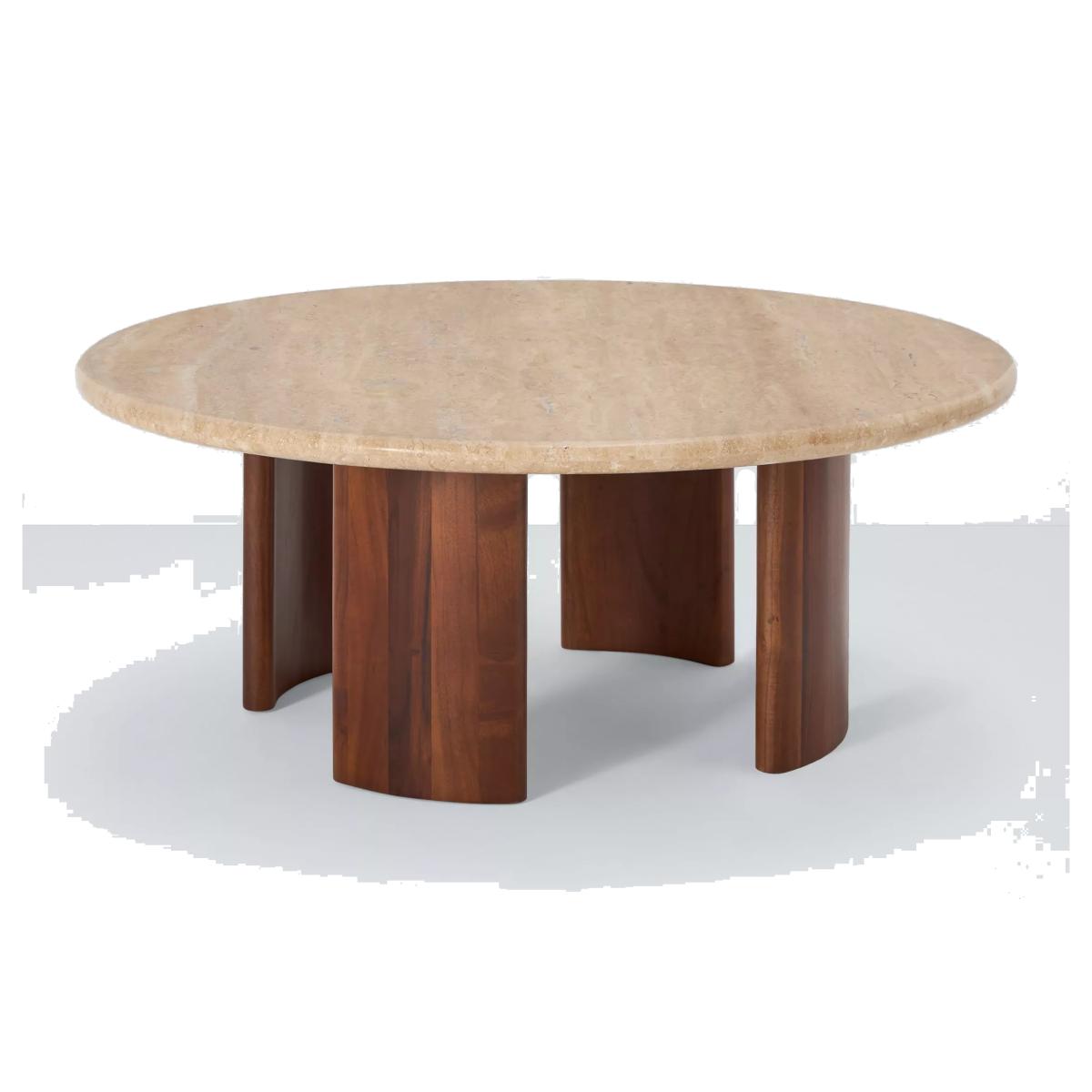 I really like this coffee table because of its clean, modern design that combines the warmth of travertine with the elegance of walnut. It works well in contemporary or mid-century styled interiors, especially ones that feature natural materials and neutral tones. To style it effectively, keep accessories minimal-perhaps a small tray or a few coffee table books-to prevent it from looking cluttered. It also pairs nicely with both plush sofas and more minimalist furniture. Practical tip: its sturdy build makes it perfect for everyday use, and it can seamlessly anchor a seating area while adding a touch of understated sophistication.