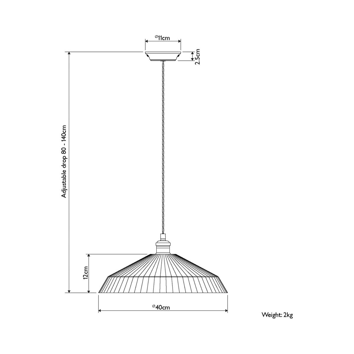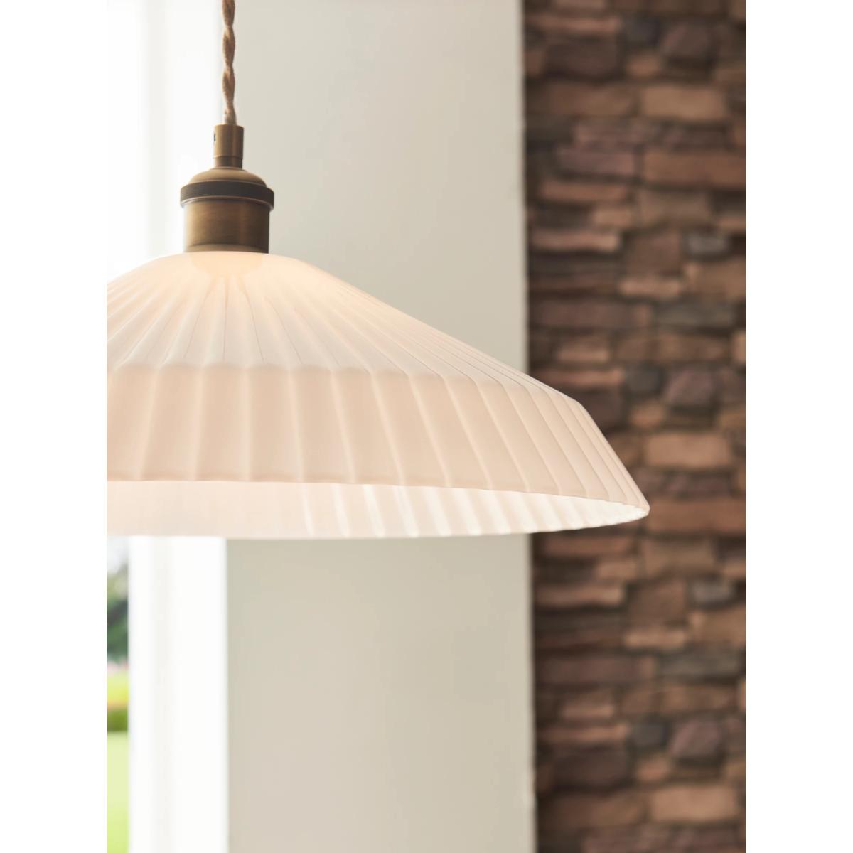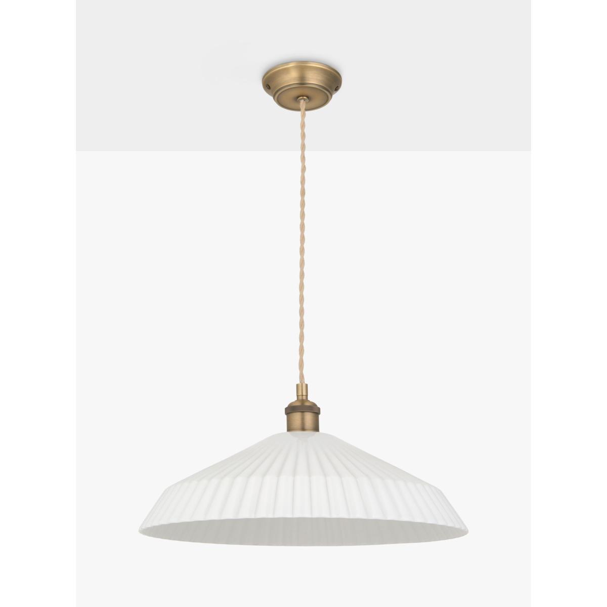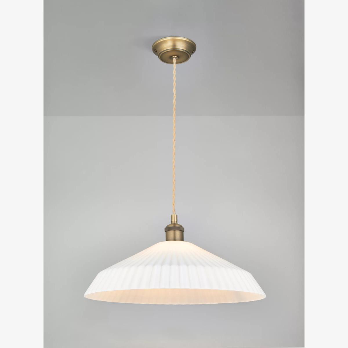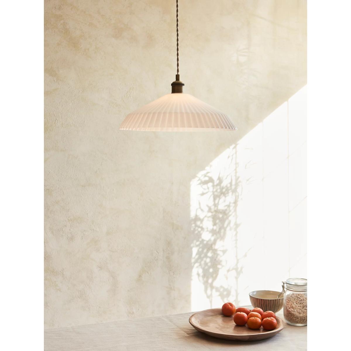 Fluted glass shade ceiling light with metallic fittings and a braided cable. A classic design particularly suited to dining areas.