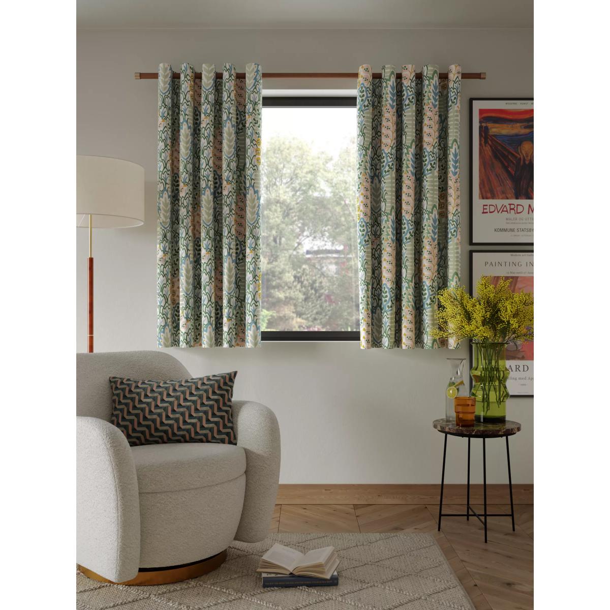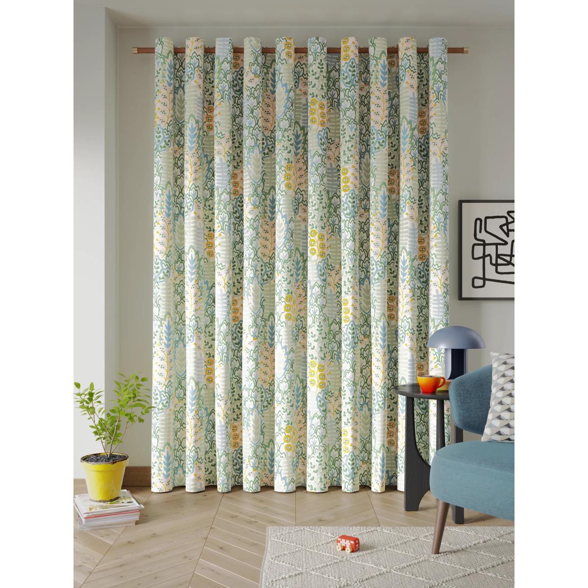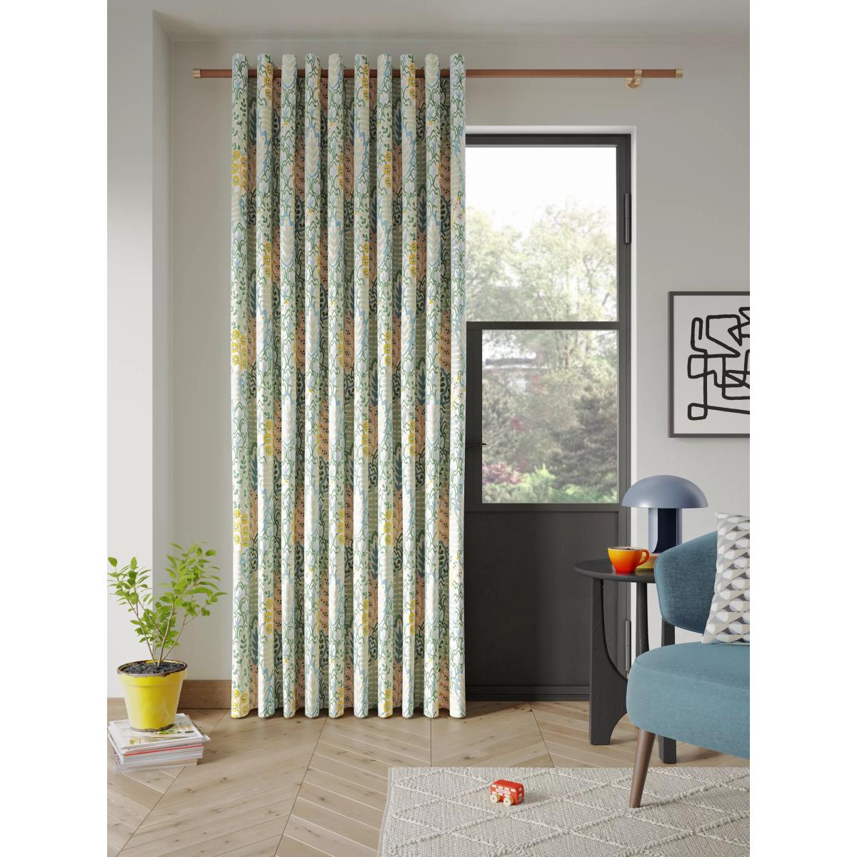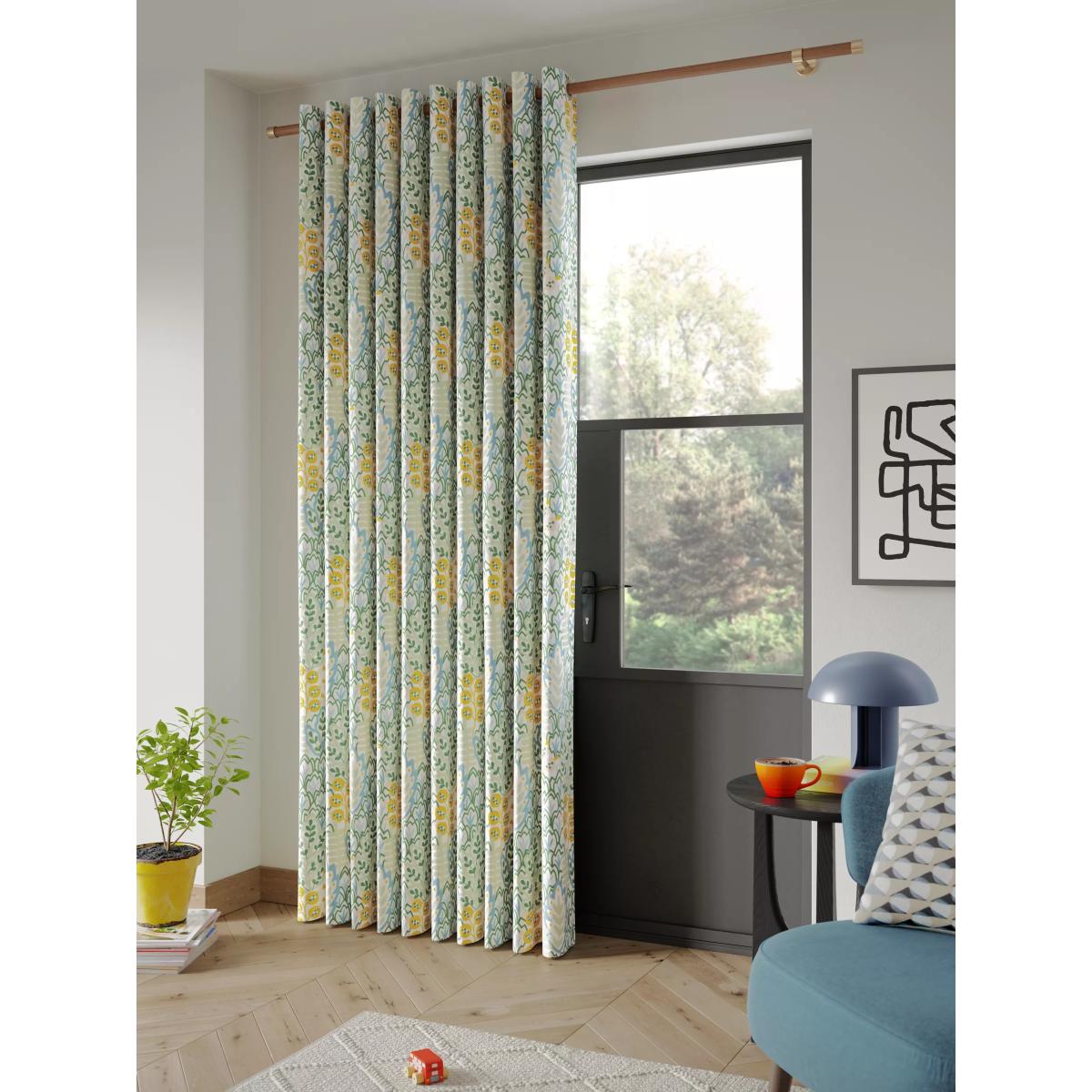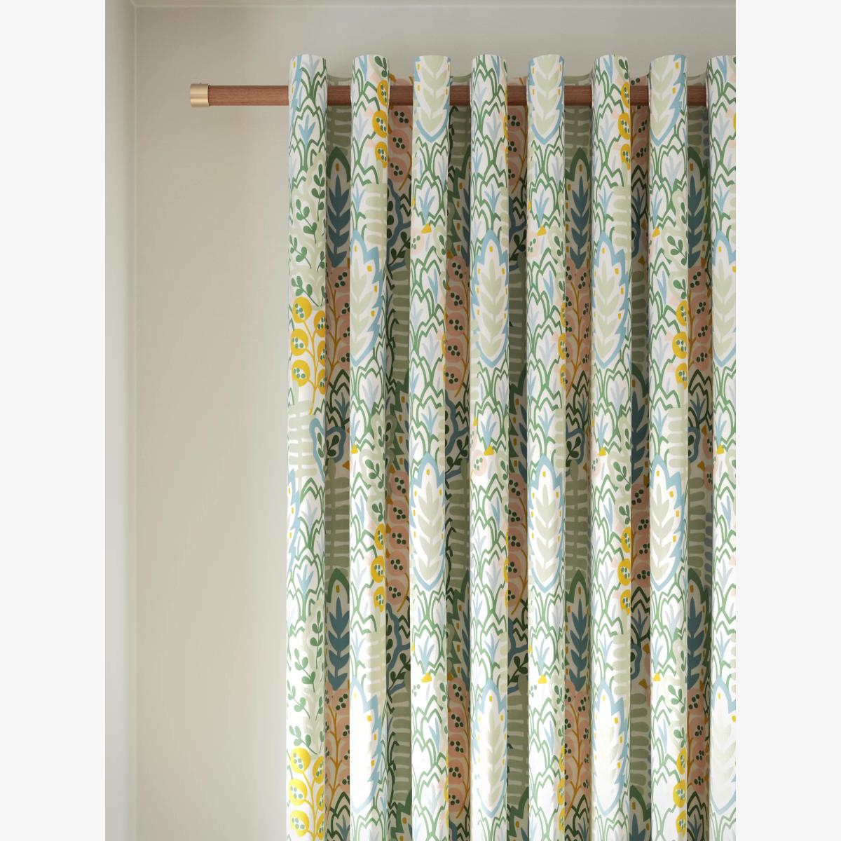 Our Alva print curtains feature a graphic all-over design that depicts stylised flora and fauna. The eyelet heading gives them a more contemporary look with large, even folds and the 3-pass blackout lining eliminates light and lends a full look to the curtains, improving the drape and enhancing the vibrancy of the pattern. Warm in winter, cool in summer As the blackout lining on these curtains blocks out sunlight they help keep your room cool as well as dark. This lining also adds an extra layer of insulation to the curtains, giving them the added benefit of being thermal. They protect against both heat loss and heat gain, regulating the temperature of your room so you’re kept warm in winter and cool in summer. The width stated indicates the size of one curtain panel when laid completely flat. This pack contains two panels and the track/pole length we've recommended allows for the two panels to be gathered when the curtains are drawn. For a fuller look, increase the curtain width. One pair of 117cm width curtains will fit a curtain track/pole size 117-167cm One pair of 167cm width curtains will fit a curtain track/pole size 133-167cm One pair of 228cm width curtains will fit a curtain track/pole size 182-228cm Better Cotton By choosing our cotton products, you’re supporting our investment in Better Cotton’s mission to help cotton communities survive and thrive while protecting and restoring the environment. Better Cotton Farmers are farmers who care for the environment and respect workers’ rights and wellbeing. This product is sourced via a system of mass balance and therefore may not contain Better Cotton. bettercotton.org/massbalance Worth knowing... We package our curtains in recycled materials to keep them protected whilst they make their way to you. This means that when they arrive there could be some creases in them. We recommend you hang them for a few days to allow them to flatten and for the creases to fall out. If after this period your curtains still show signs of being folded then follow the ironing instructions on the back of the packaging. Be aware that each style of curtain has different ironing instructions, including heat limitations according to the fabric, so do make sure you follow the guidance provided to get the best results. Do you need a curtain pole and accessories? Shop them here.