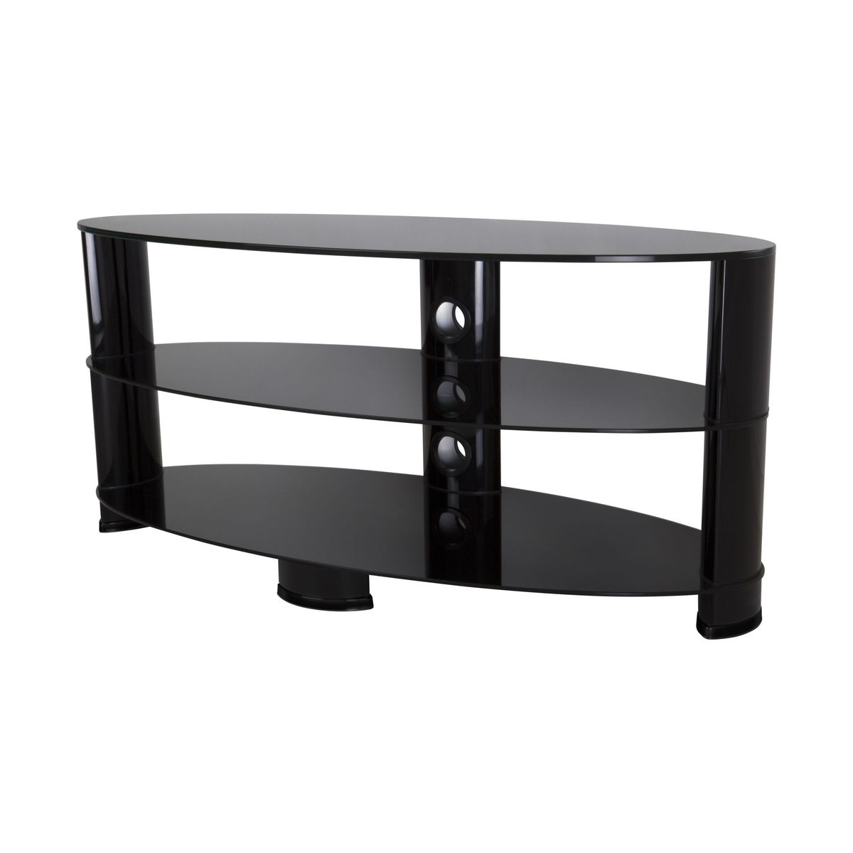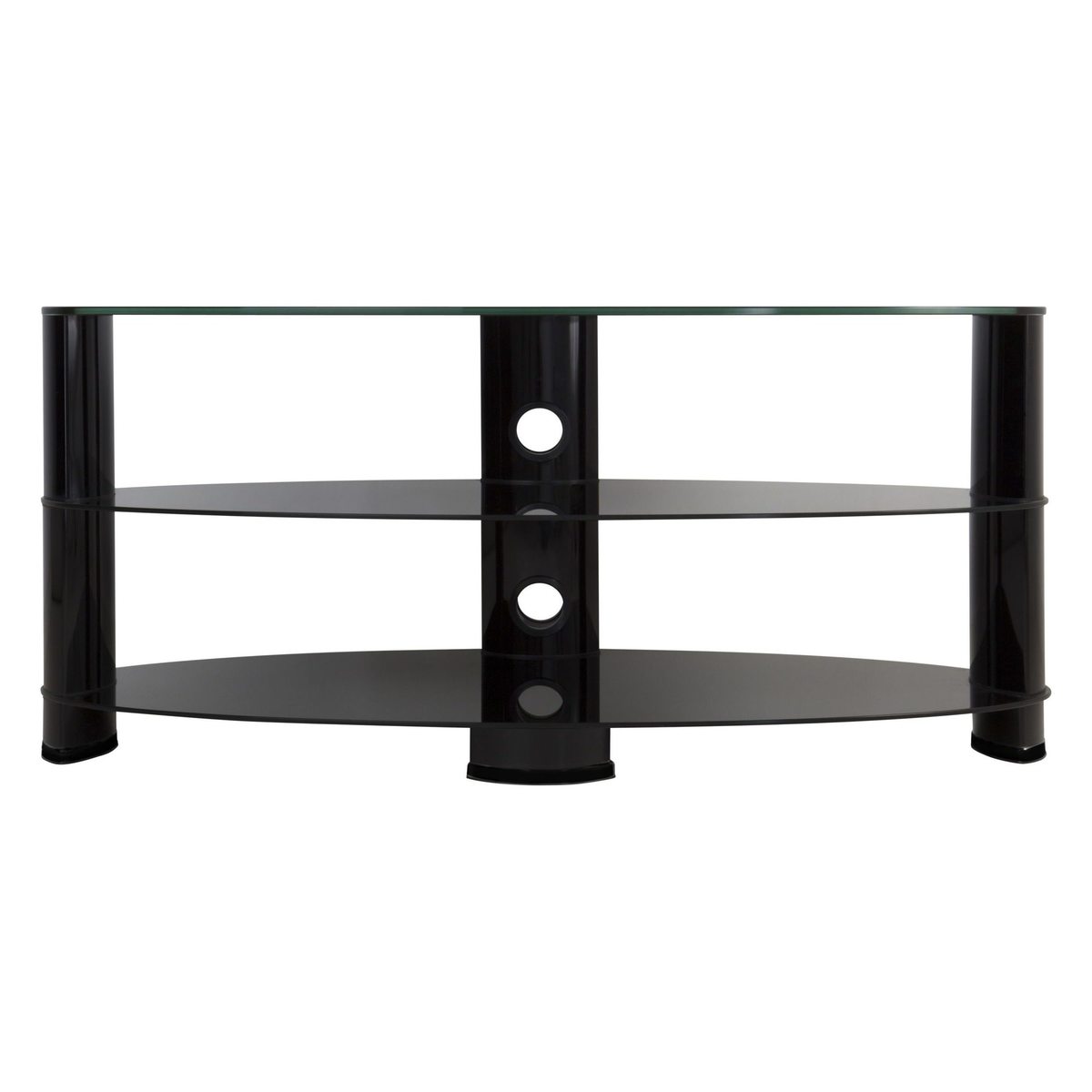 Display your TV in style with the John Lewis Oval Stand. This attractive glass stand is designed to accommodate TVs with a screen size of up to 60 inches. Boasting three shelves - the top capable of holding a TV up to 50kg and the lower subsequent shelves supporting 15kg each - the unit is large enough to support the screen and even a games console or sound base. With no doors or draws to contend with, the TV stand offers easy access and cross-ventilation which will prevent your technologies from overheating. What's more, the neat cable management system also helps to keep connections under control, so you'll spend less time fiddling with cables and more time watching the programmes you want. Please note: Any maximum TV size quoted is a recommendation only and the exact dimensions of the TV's pedestal/feet should be checked to ensure it fits prior to purchase.